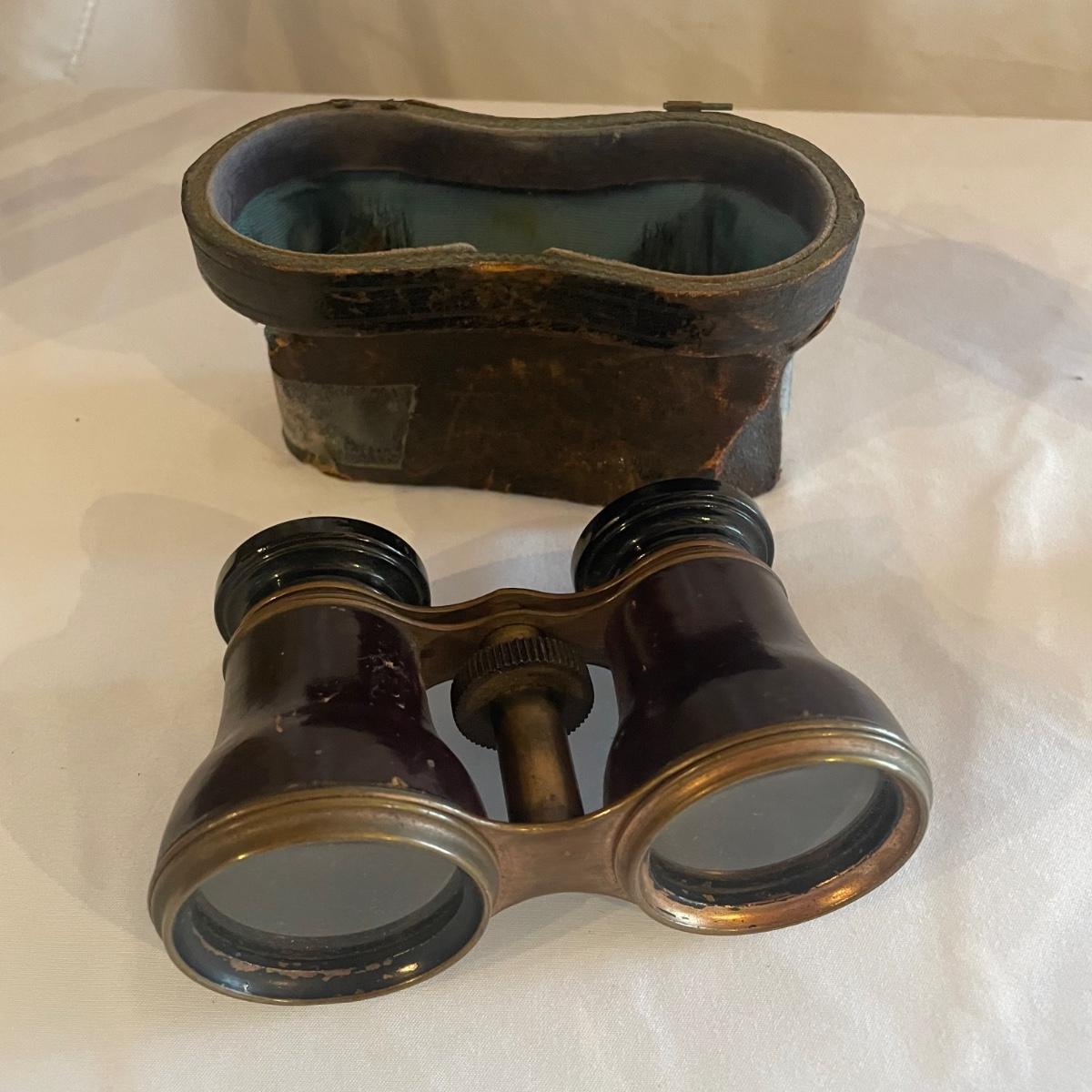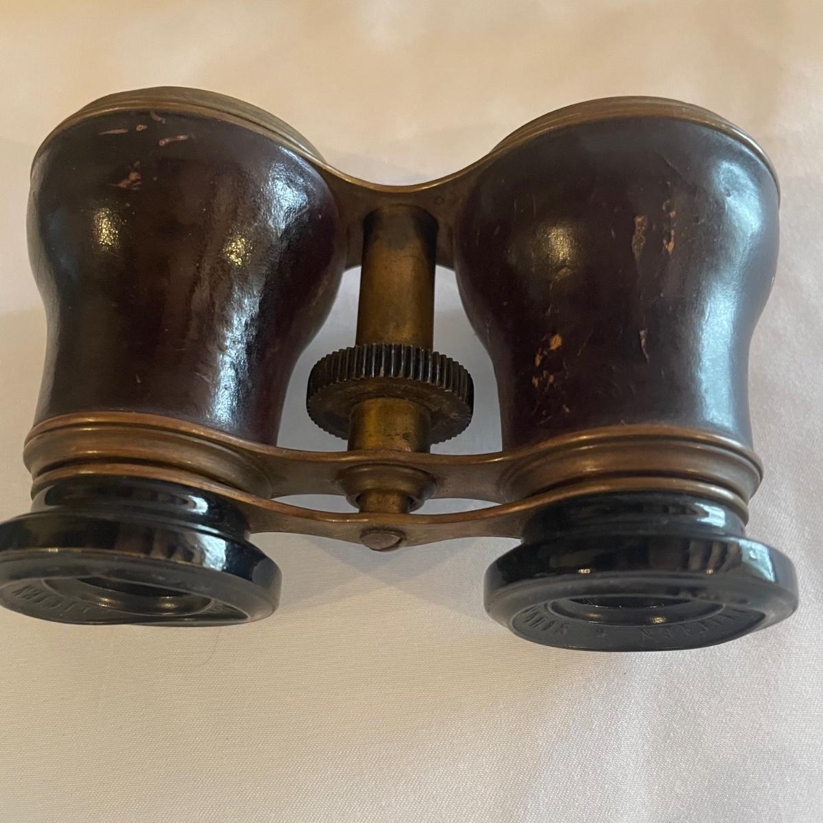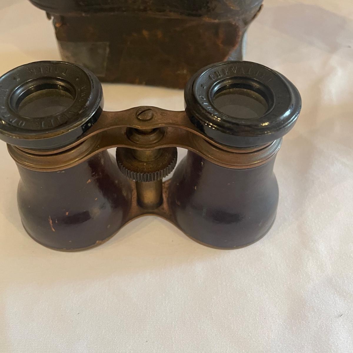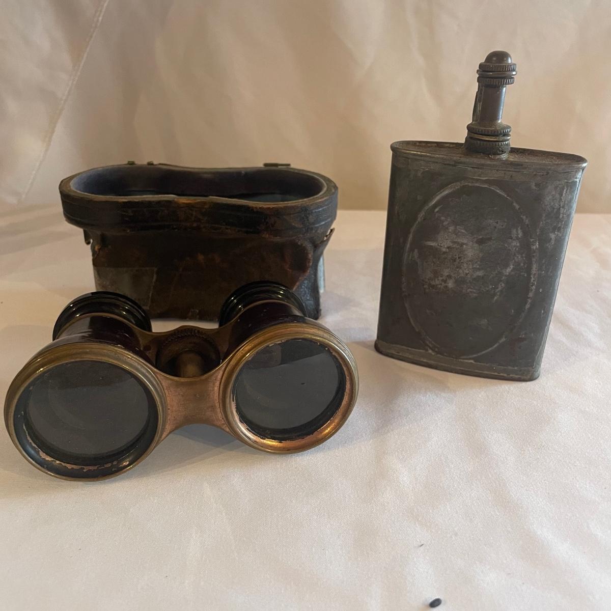 These brass opera glasses are from Chevalier Optician of Paris and come with their original leather case which is very delicate and pulling away at the seams. Also included is a metal flask that measures 5” tall.