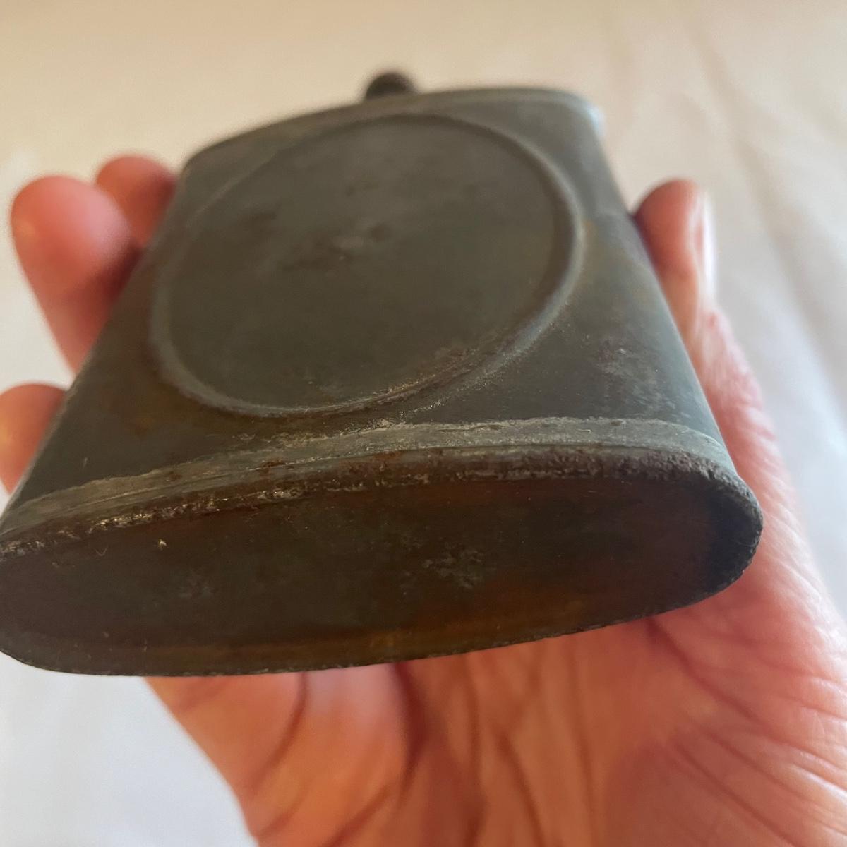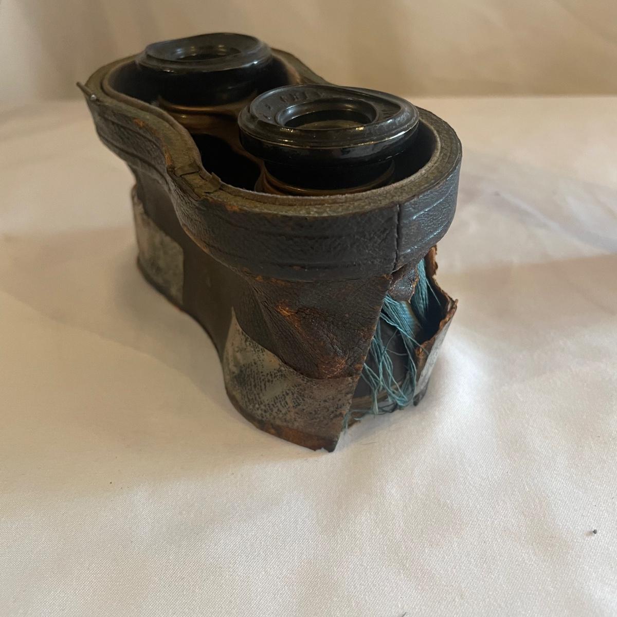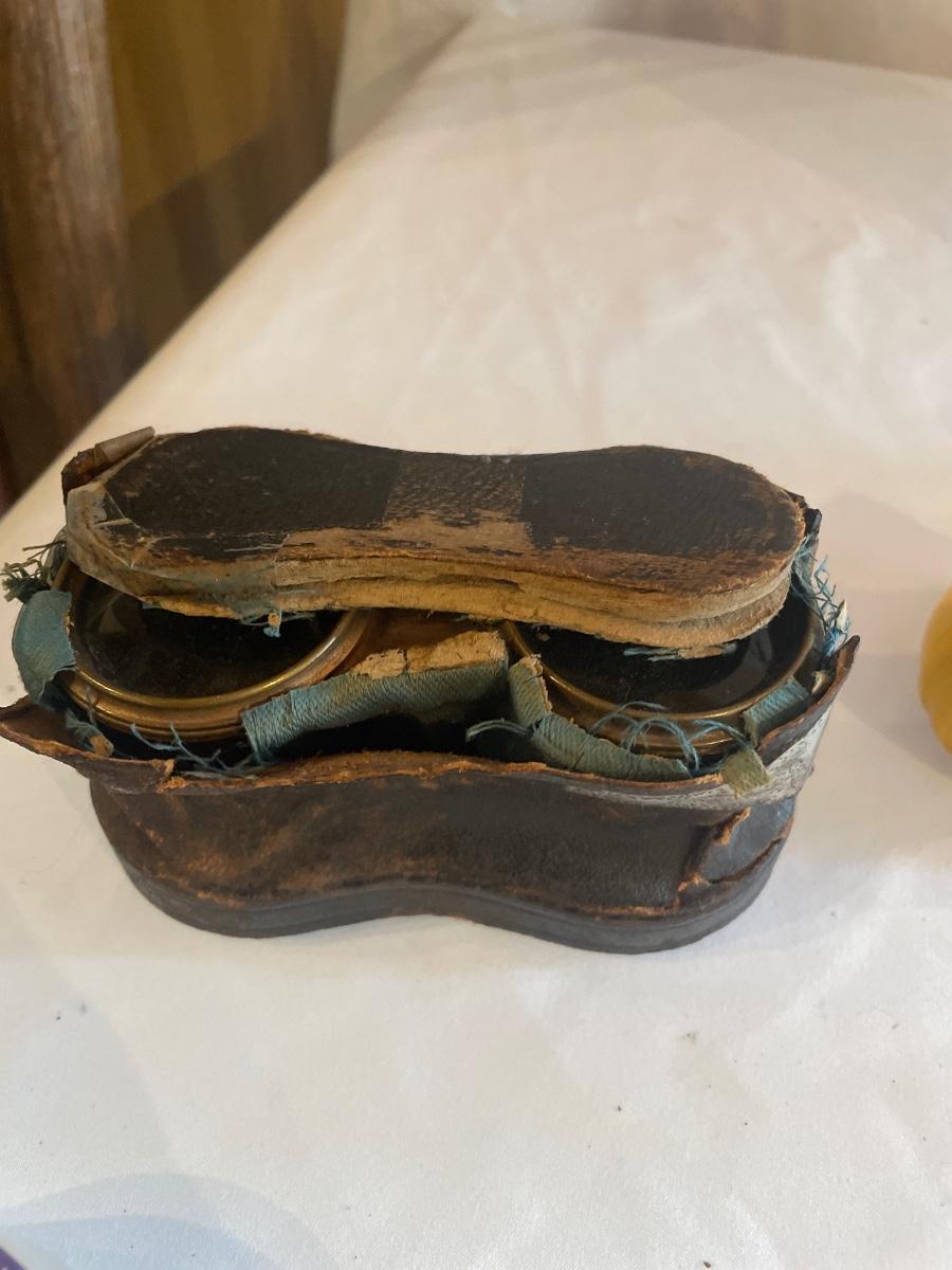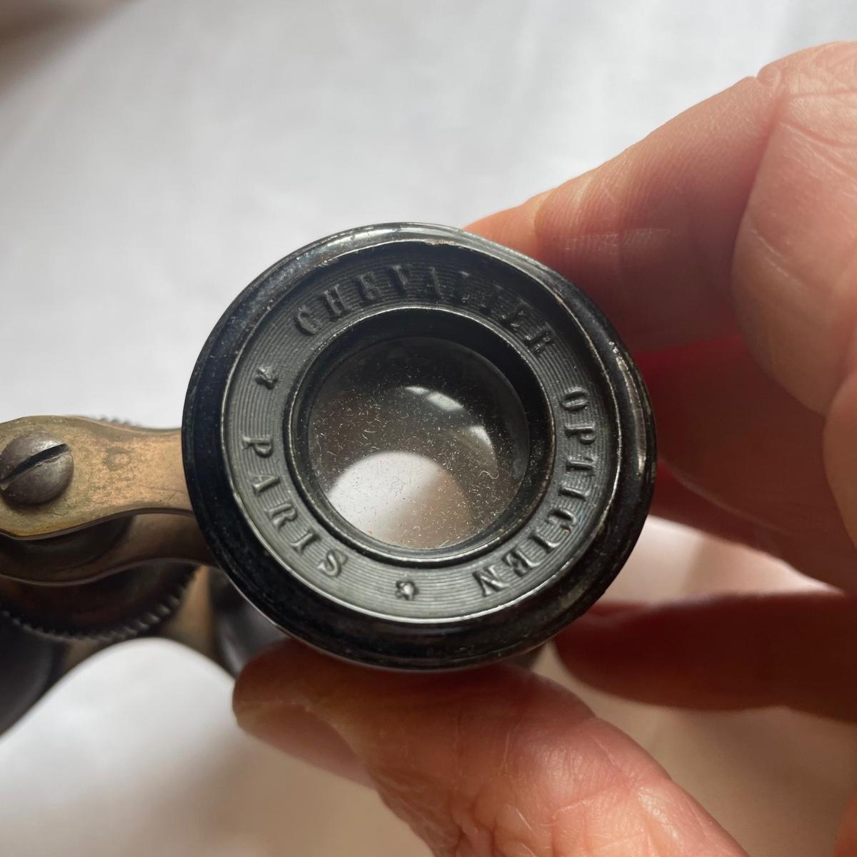 These brass opera glasses are from Chevalier Optician of Paris and come with their original leather case which is very delicate and pulling away at the seams. Also included is a metal flask that measures 5” tall.
