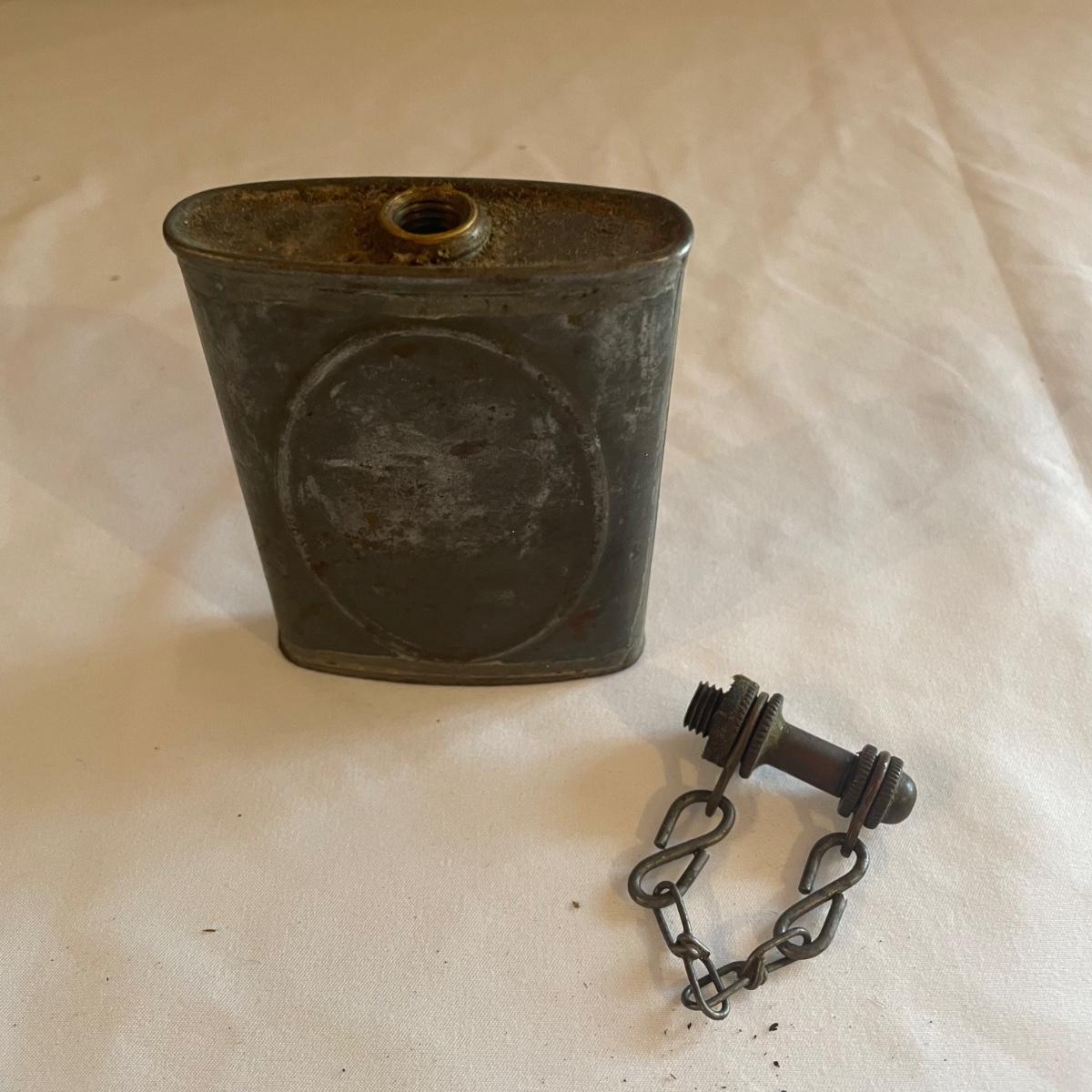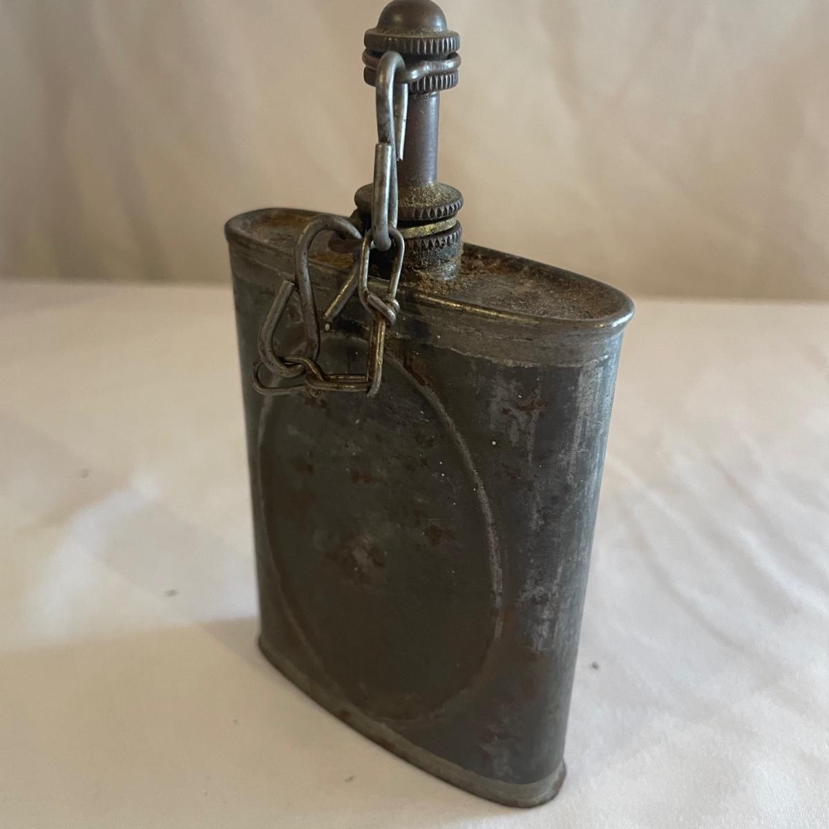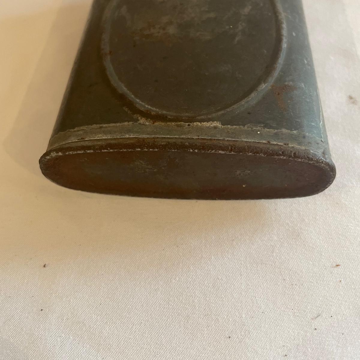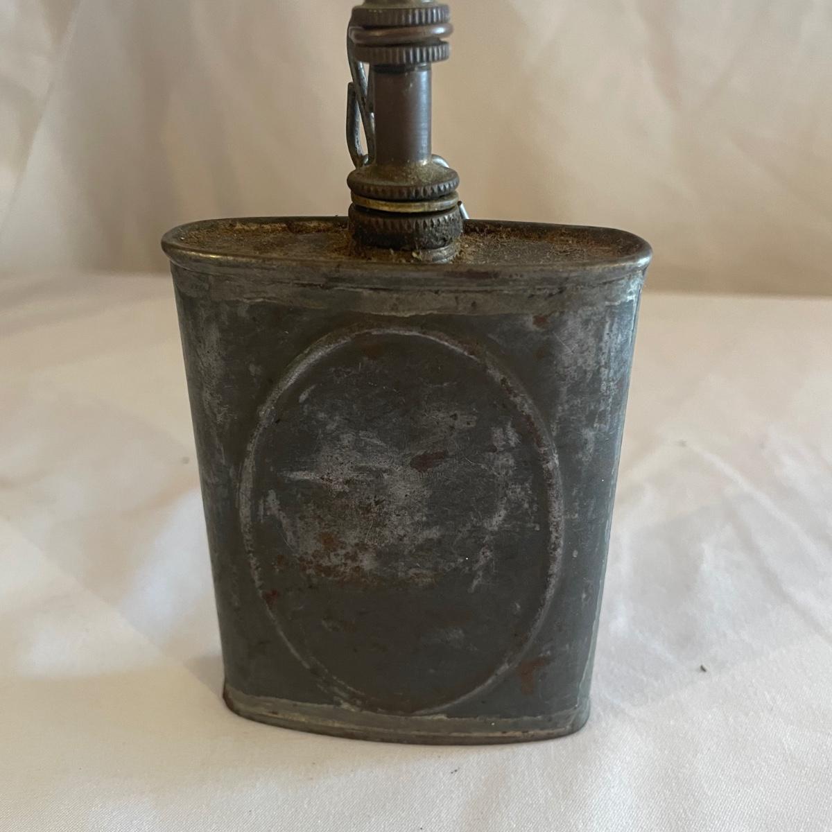 These brass opera glasses are from Chevalier Optician of Paris and come with their original leather case which is very delicate and pulling away at the seams. Also included is a metal flask that measures 5” tall.