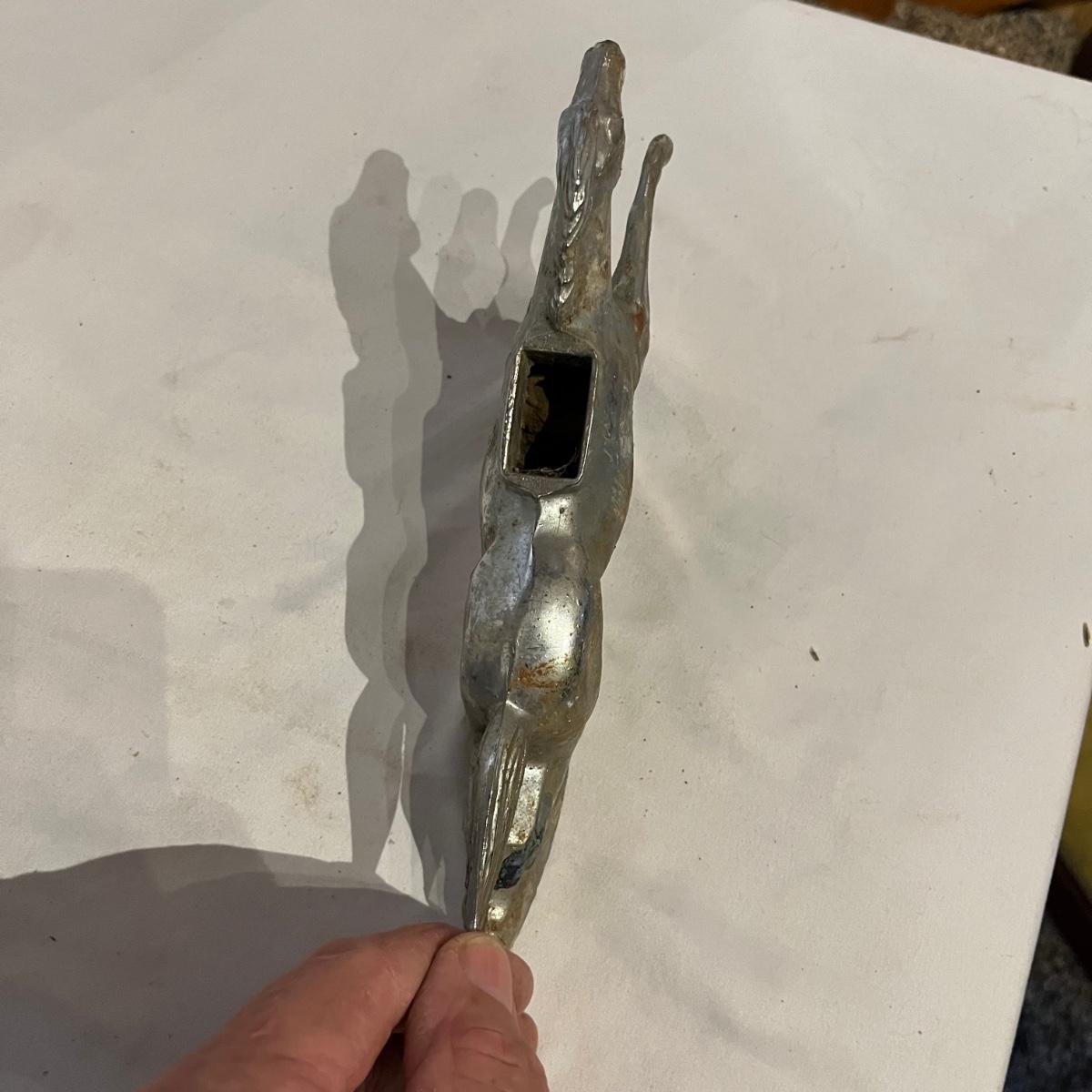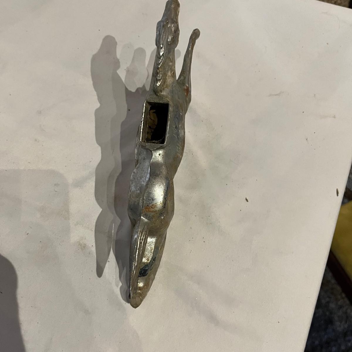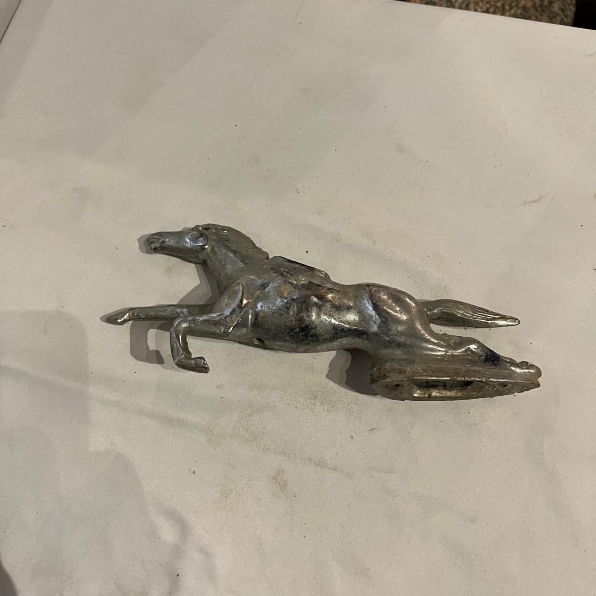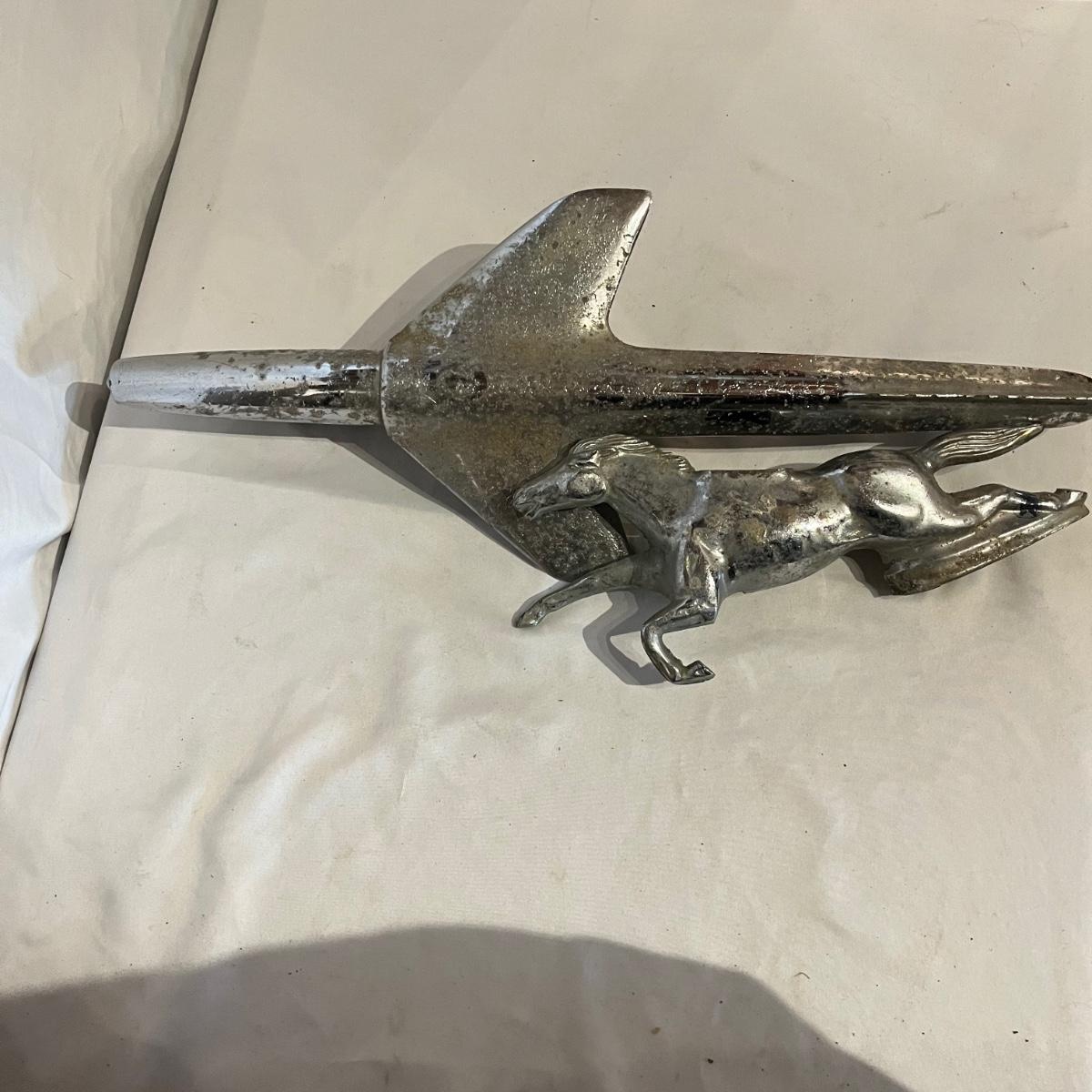 Lot includes a Chevrolet Belair hood ornament and a horse ornament. Both items are pitted. Belair ornament measures 6.5” x 16.5” x 2.5”.