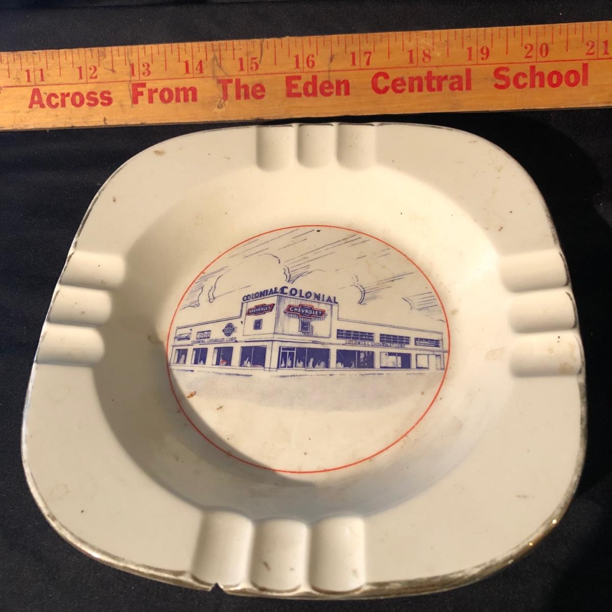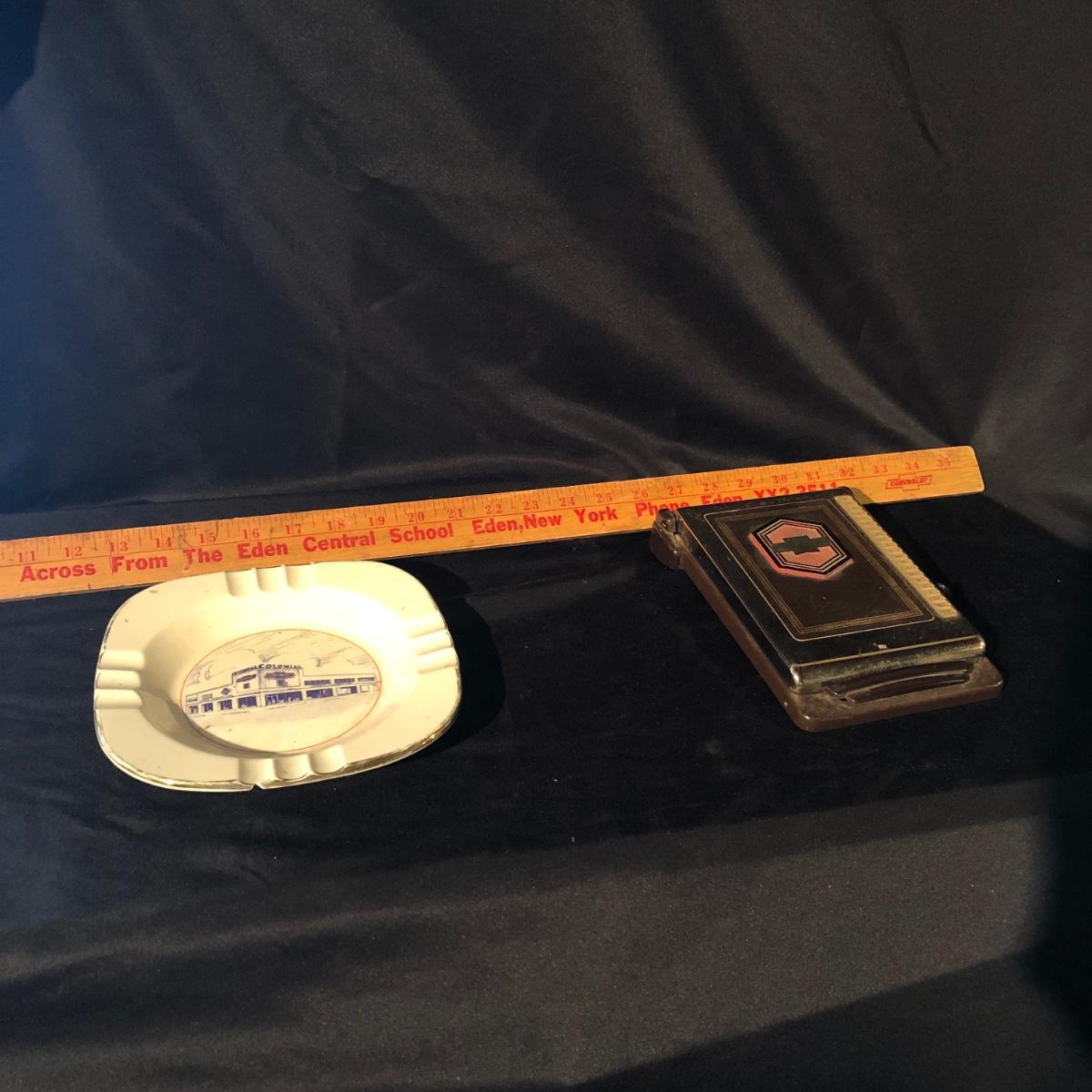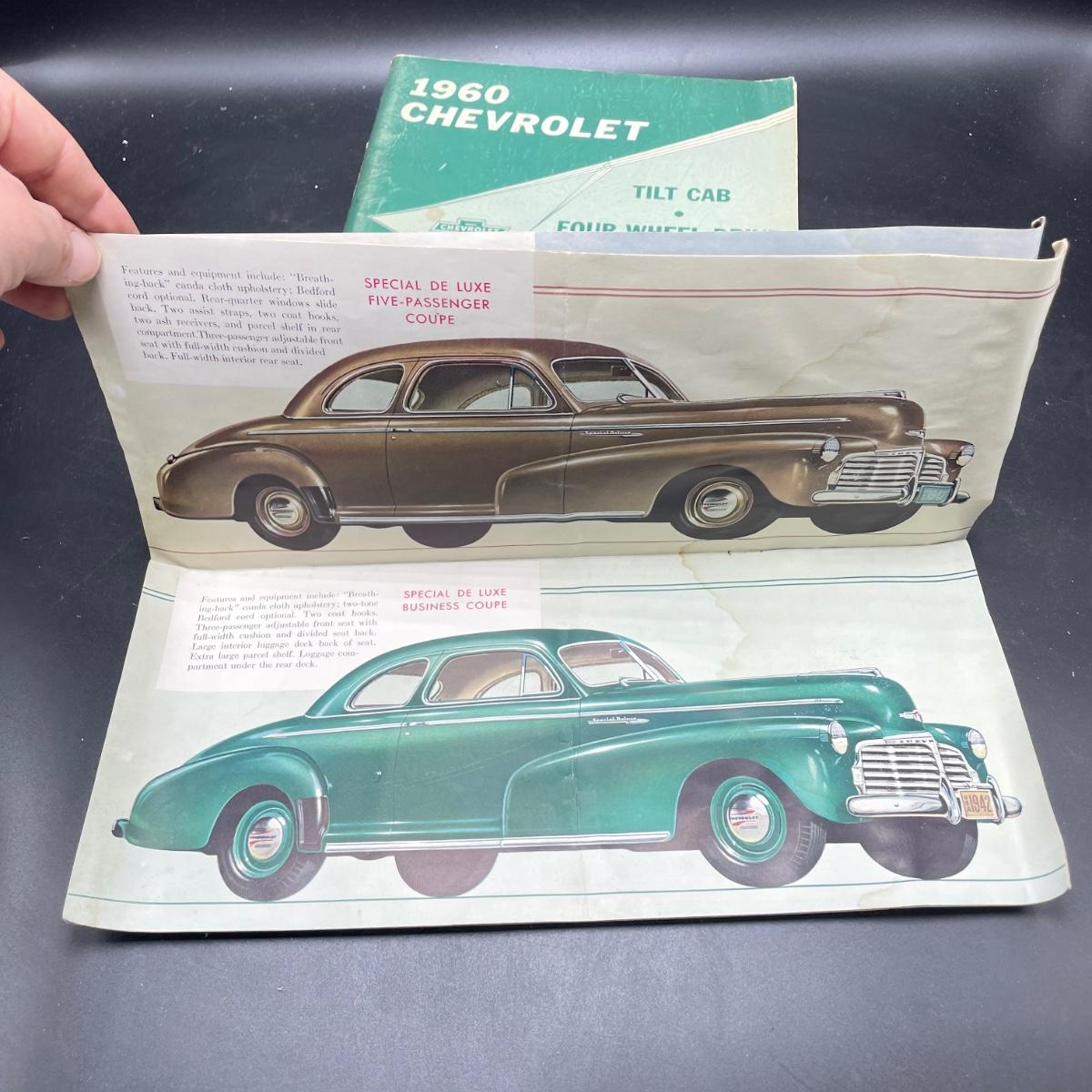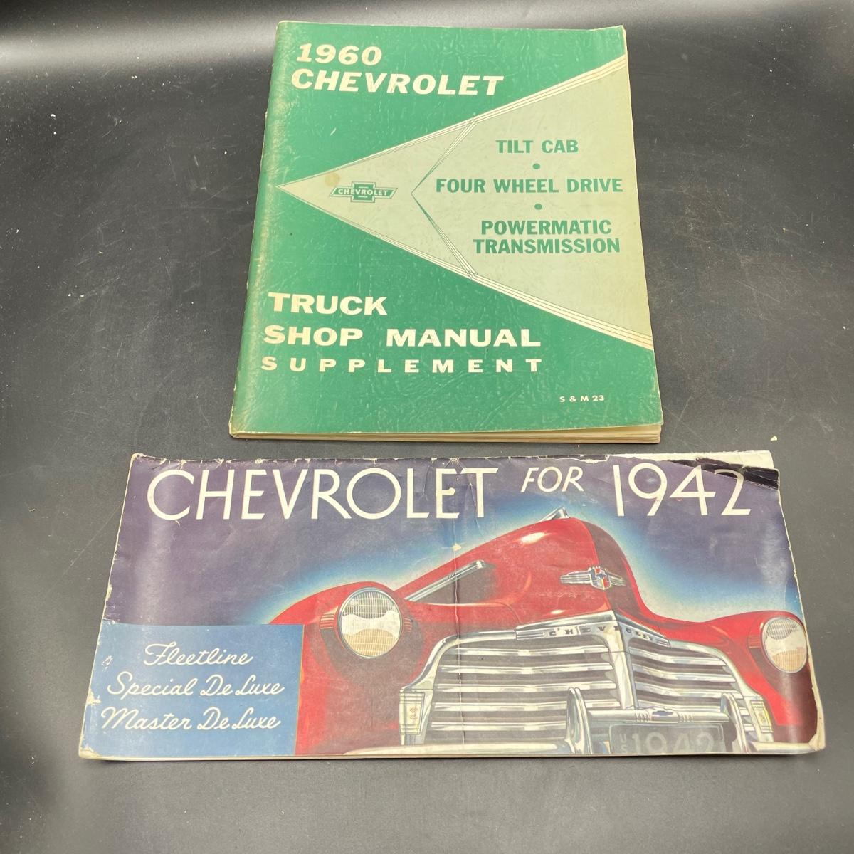 Fun Chevy collection here. An ashtray (7” x 7”,), a list finder (5” x 8”) and a wooden yardstick. Note the chip on the edge of the ashtray. On the back of the list finder it reads, “Bates List Finder Cavalier Model” “Made by The Bates MFG Co. Orange NJ USA PAT. Pending.” This would probably make a fine Rolodex. Lot also features a 1942 catalog and a 1960 Truck Shop Manual. Shipping Available.