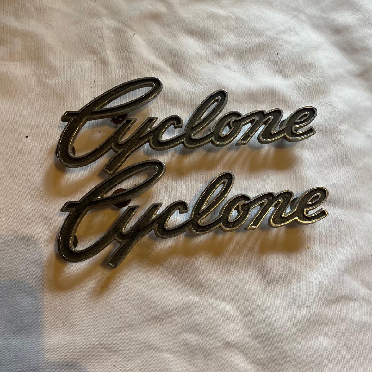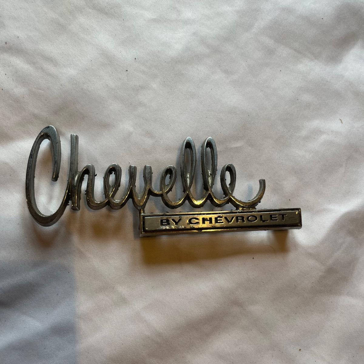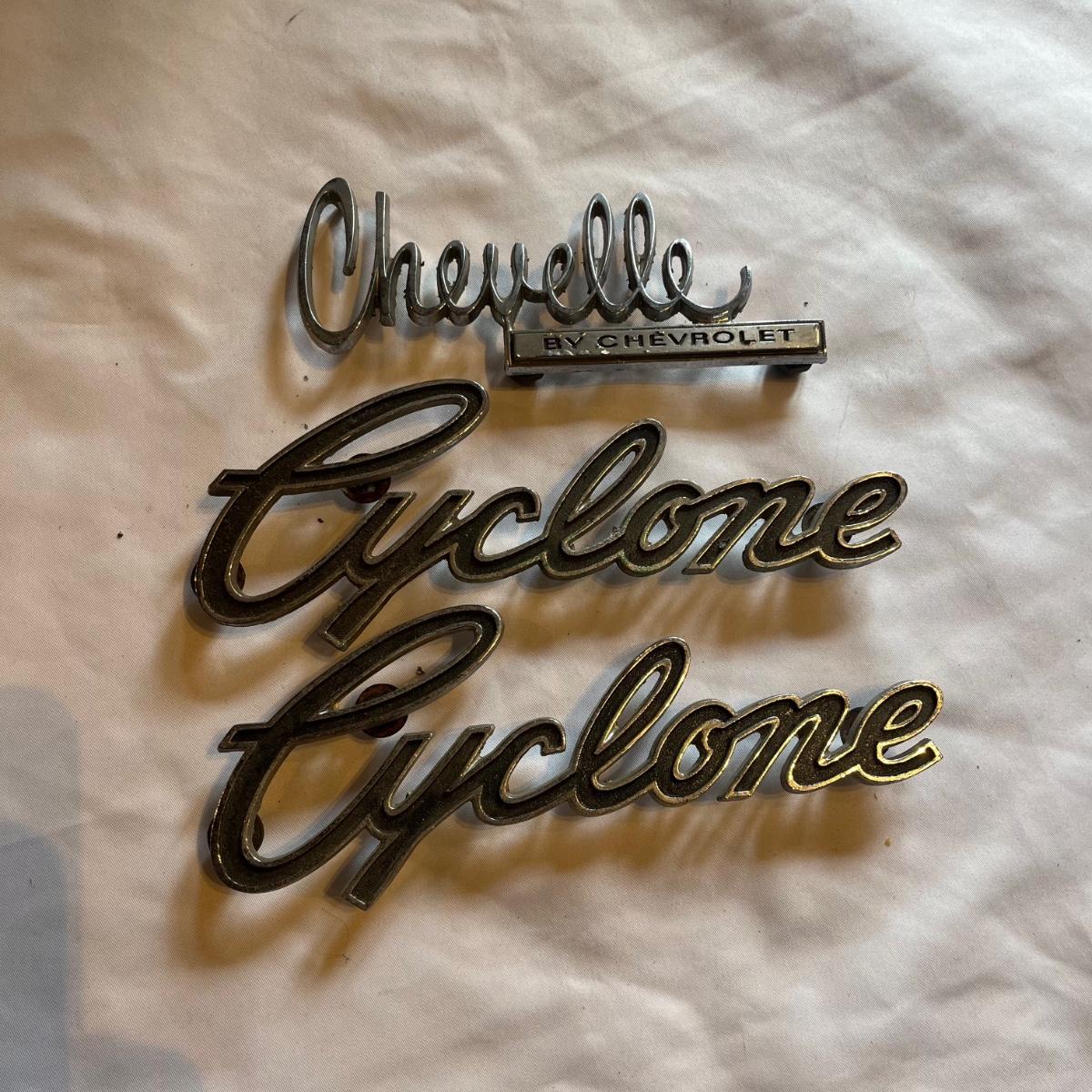 Lot includes a metal Chevelle trunk emblem and a pair of Cyclone metal emblems. All emblems appear to be OEM. Cyclone emblem is missing one pin.