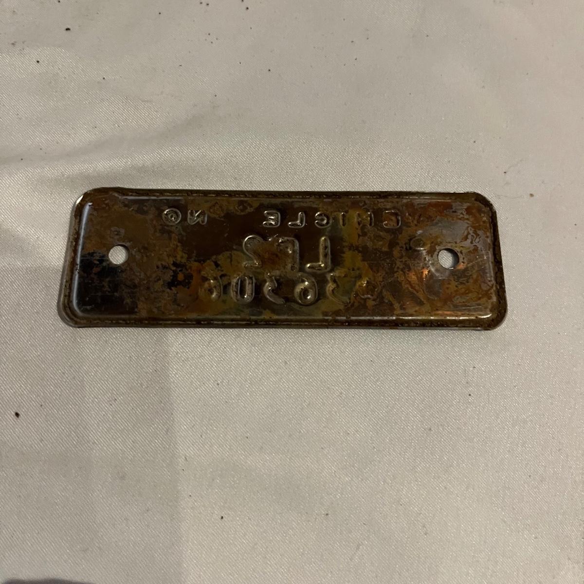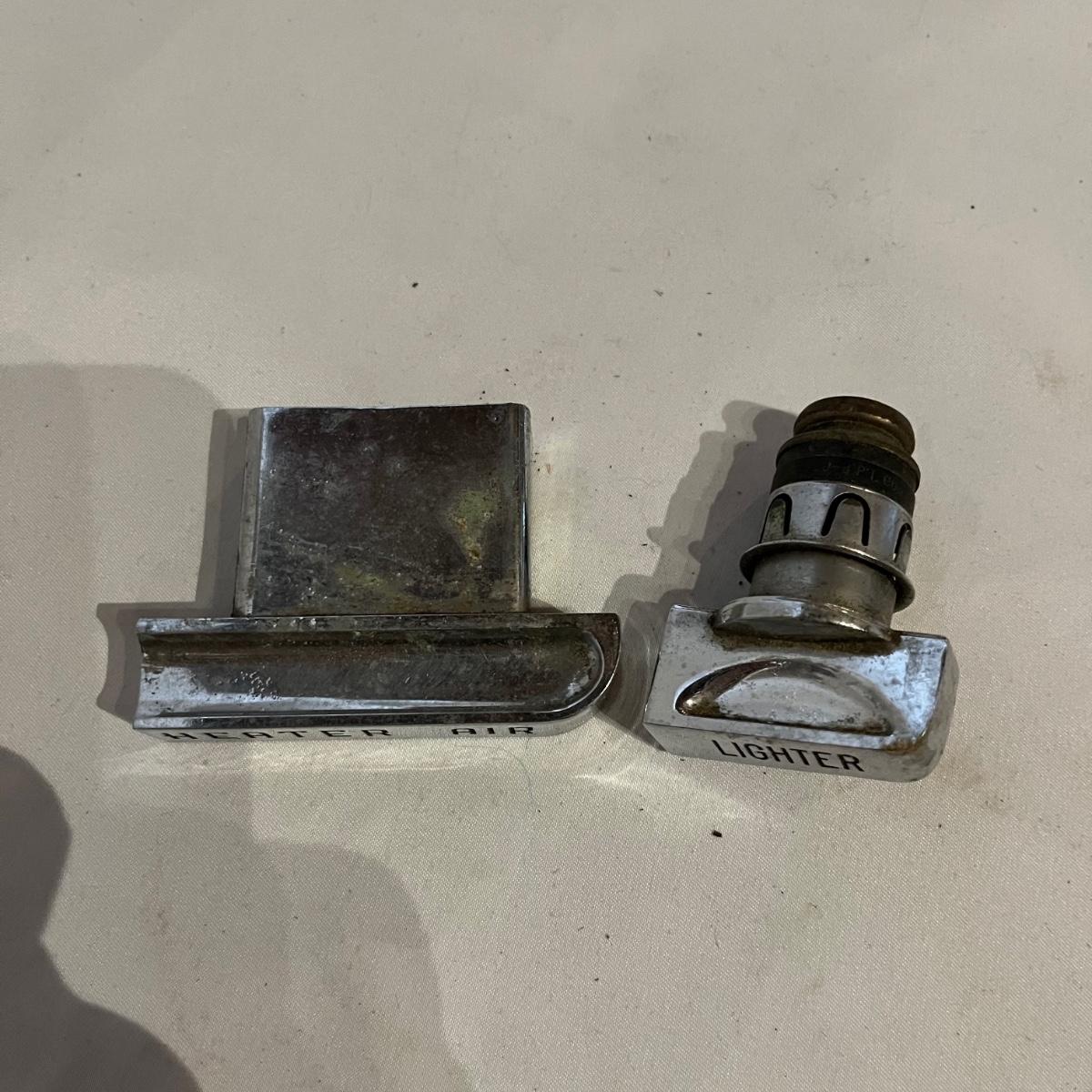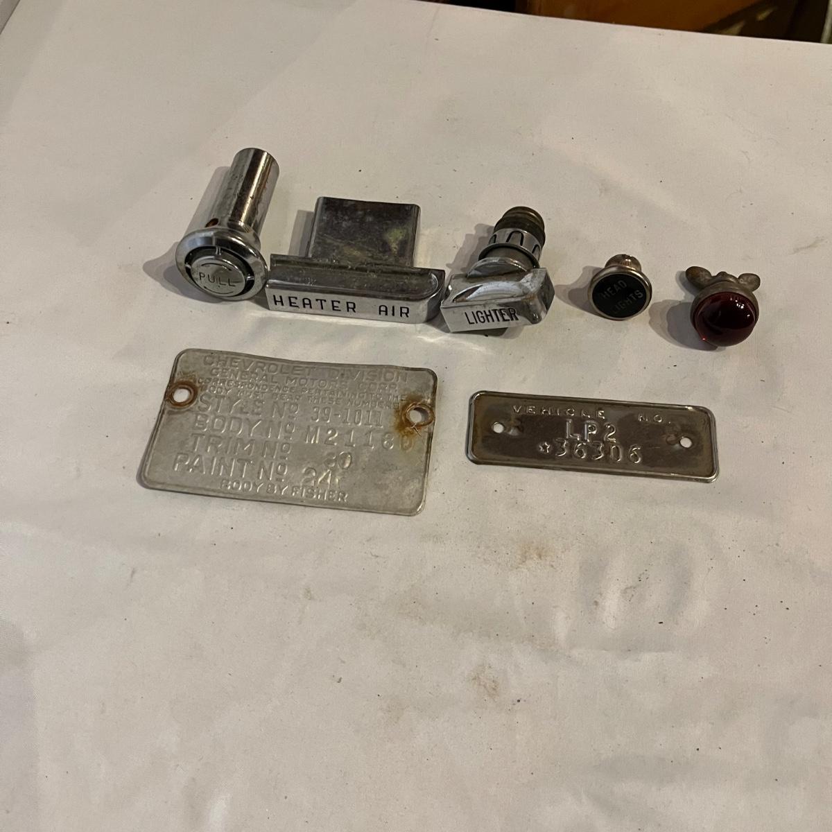 Lot includes a VIN tag for a 1939 Chevrolet, data tag, glass reflector license plate bolt, head light knob, lighter and more.