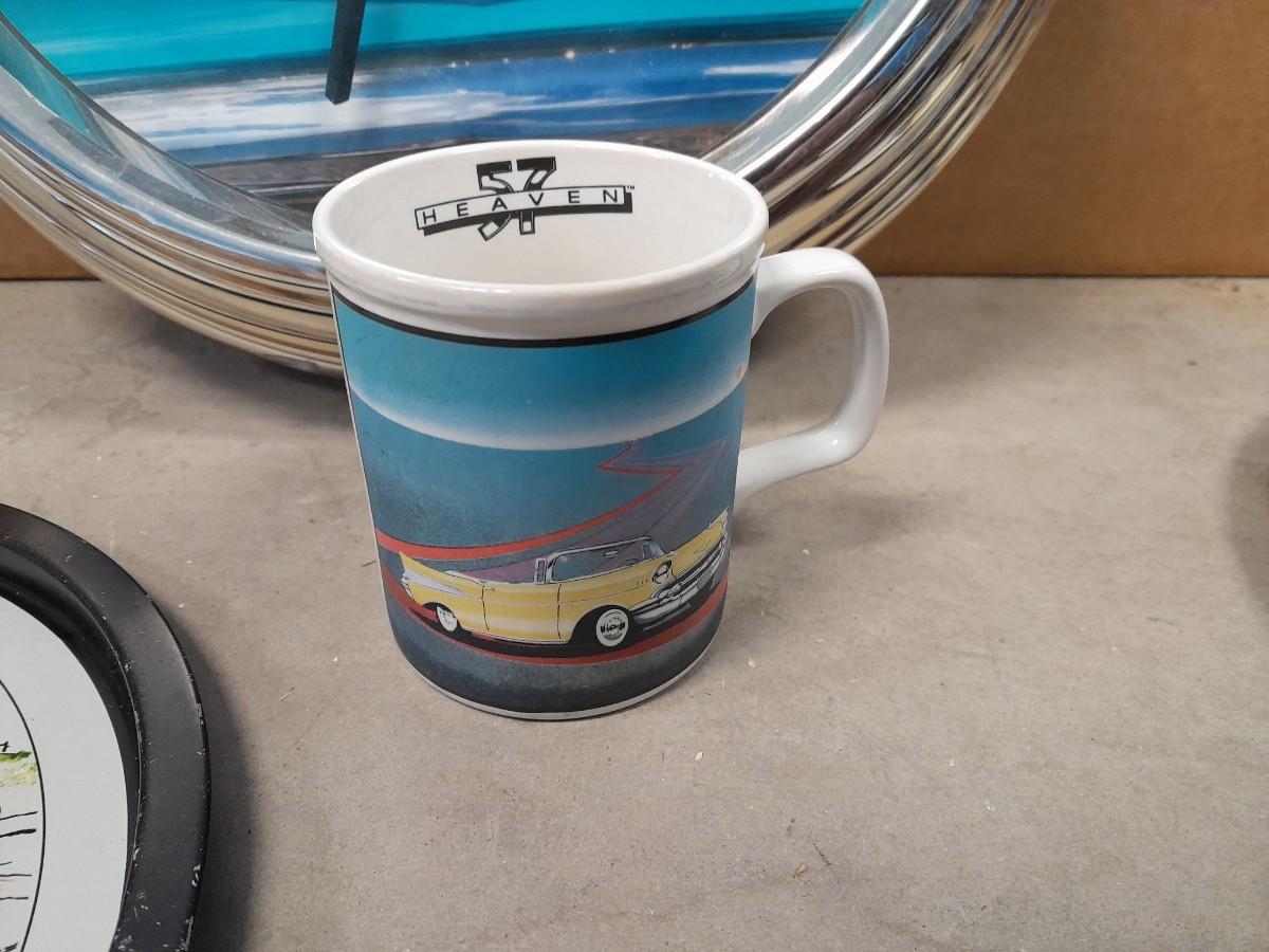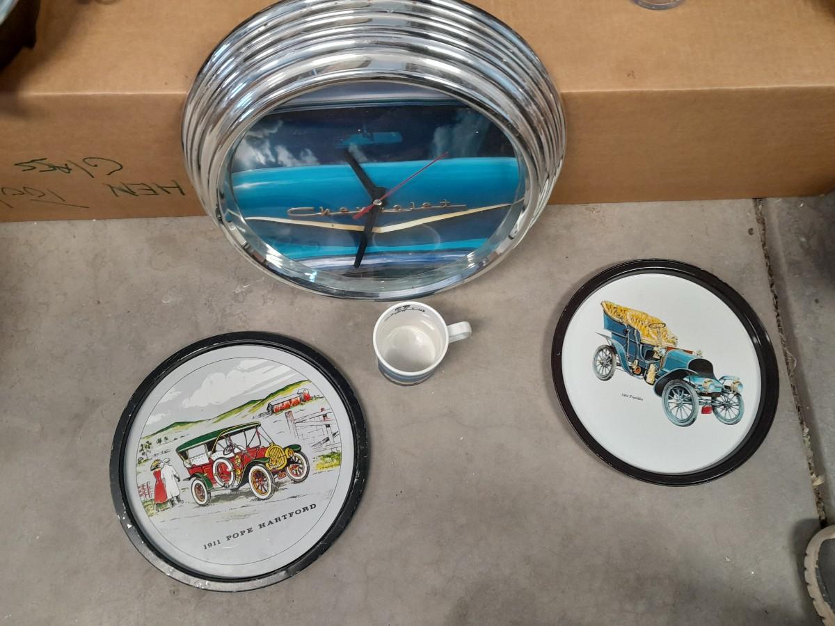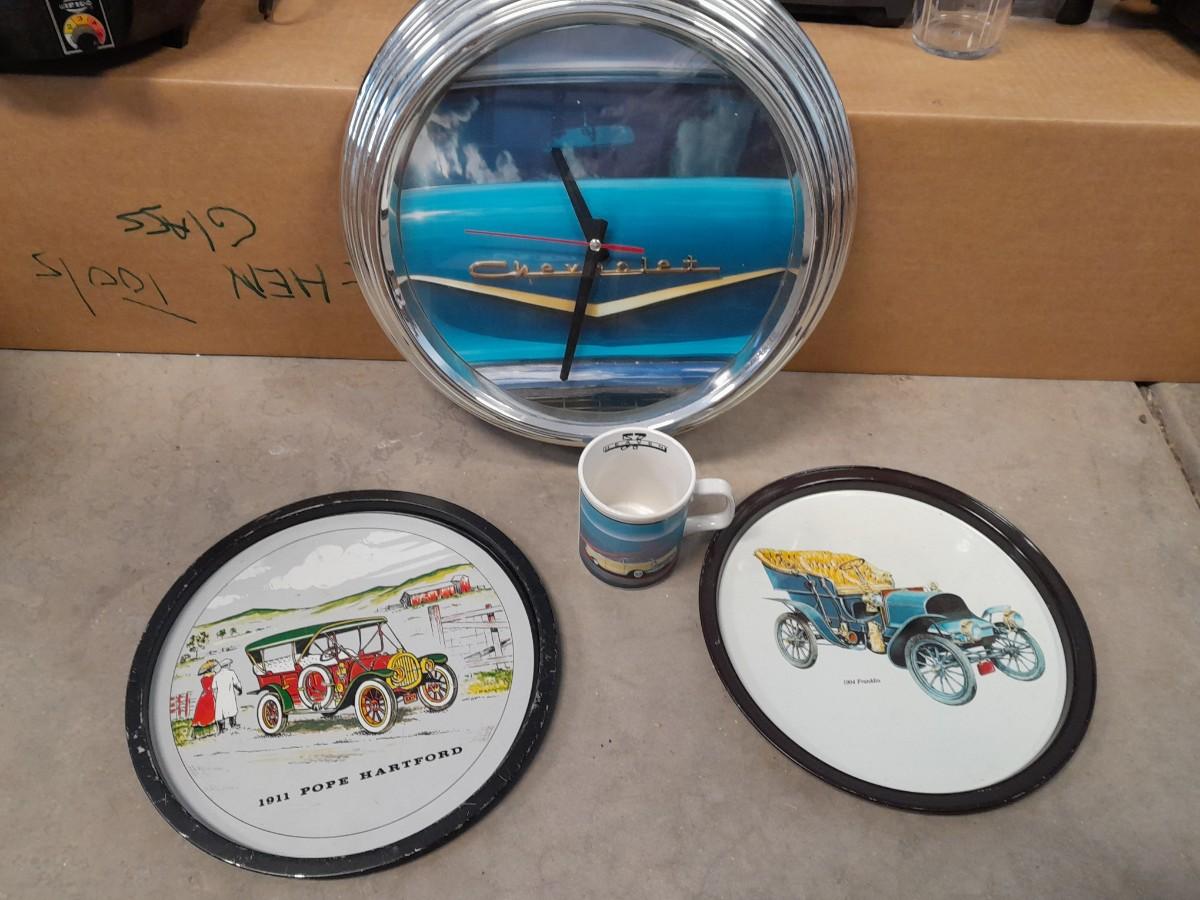 CHEVROLET WALL CLOCK, TIN TRAYS AND COFFEE MUG