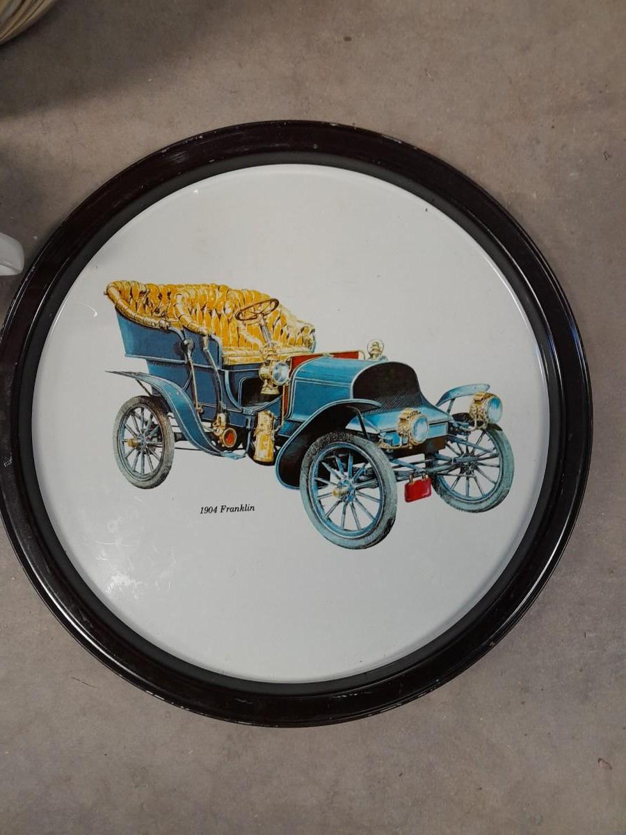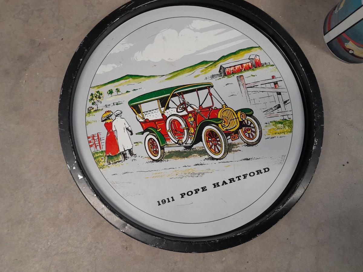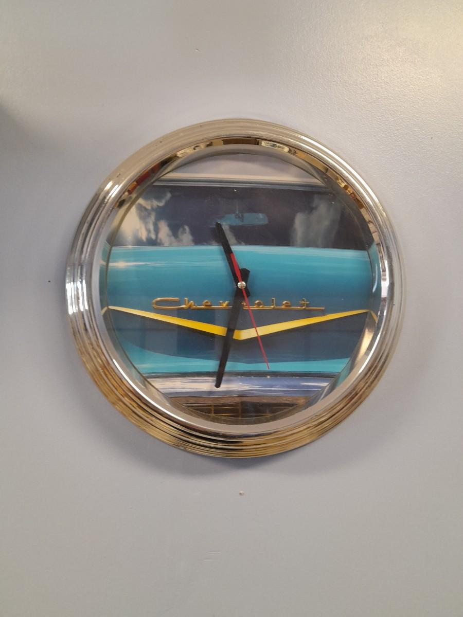CHEVROLET WALL CLOCK, TIN TRAYS AND COFFEE MUG