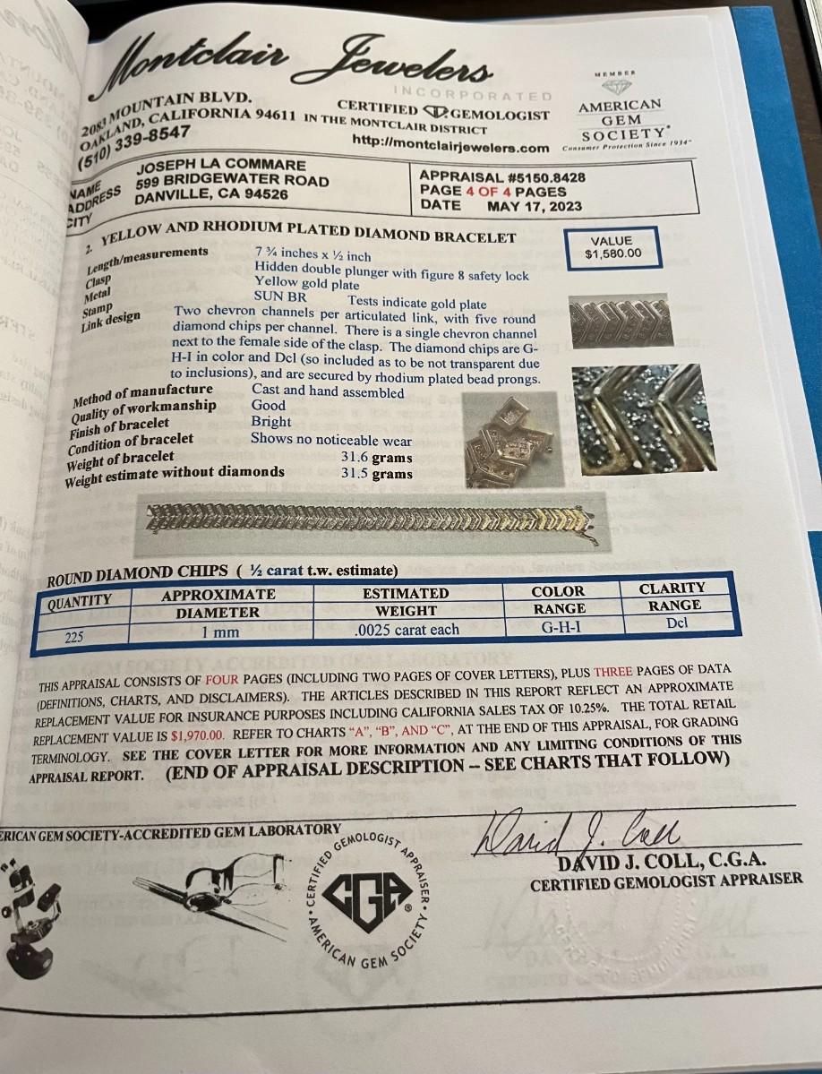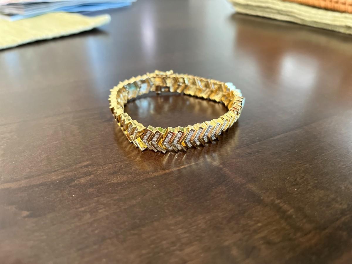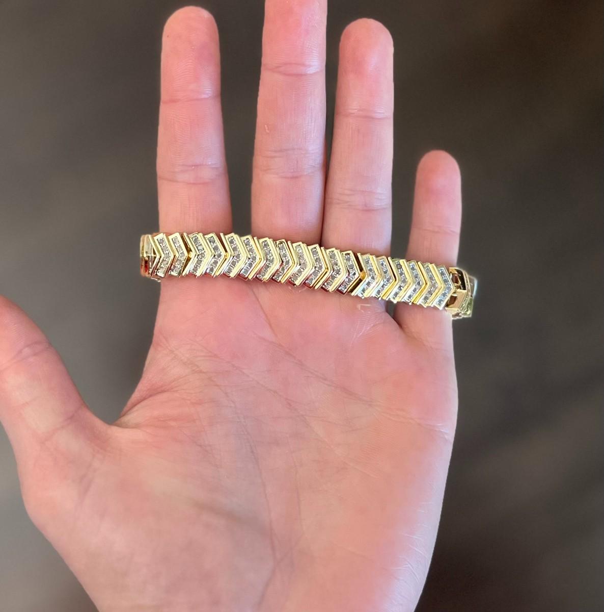 Introducing a stunning chevron diamond bracelet, boasting a total weight of 0.5 carats and an appraised value of over $1500. This exquisite piece features a captivating chevron pattern adorned with sparkling diamonds that radiate elegance and sophistication. Please note that the bracelet has a broken clip, which can be easily repaired by a professional jeweler, offering you an opportunity to own this exquisite accessory at a fraction of its appraised value. With its timeless design and irresistible allure, this chevron diamond bracelet is the perfect addition to any jewelry collection.