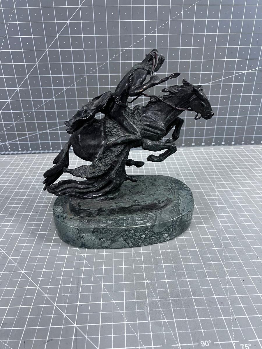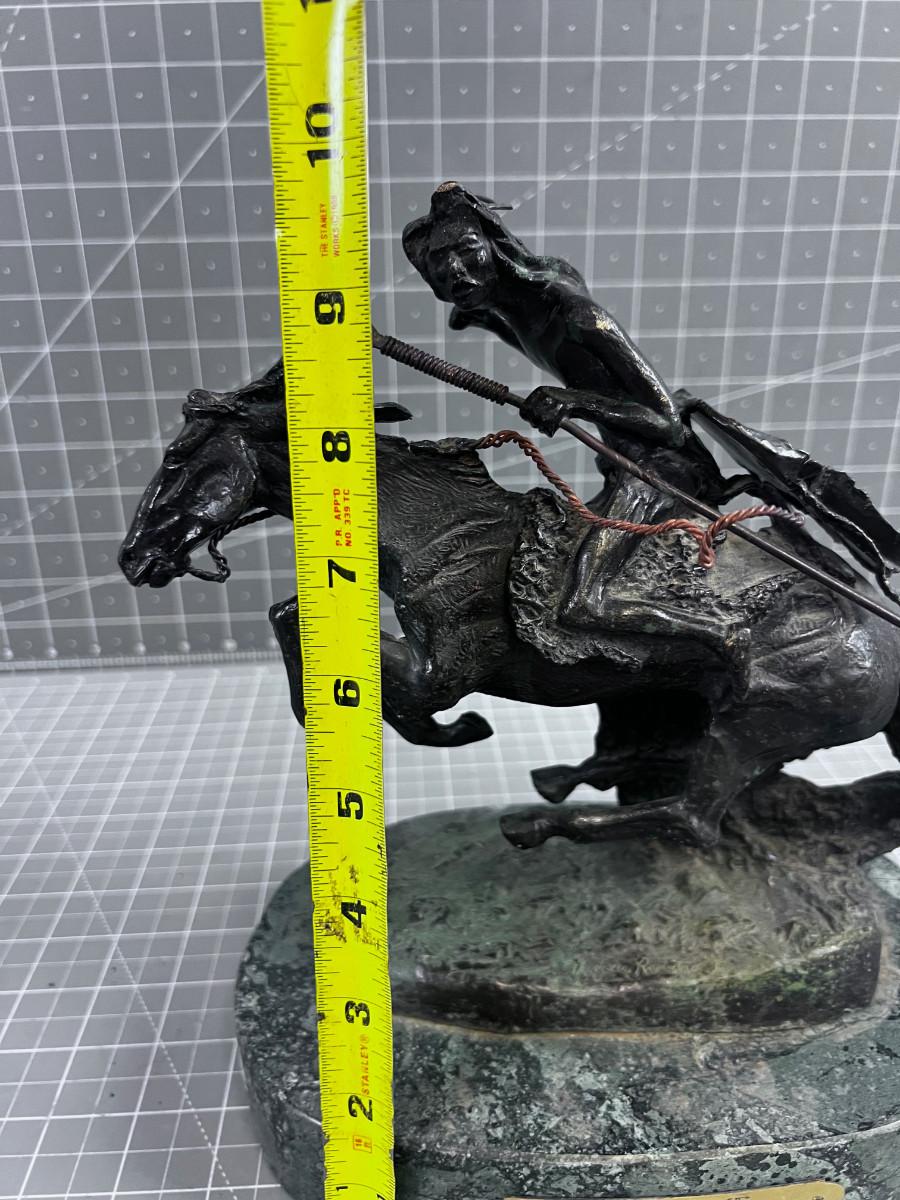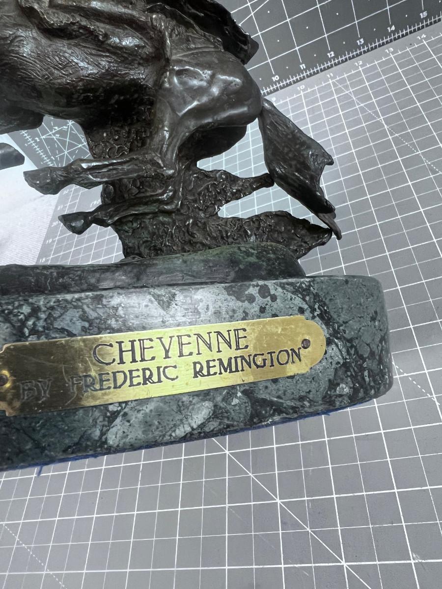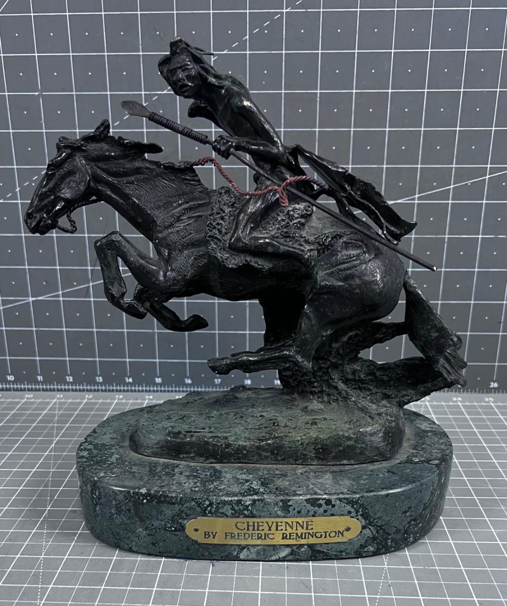 "Cheyenne" by Fredrick Remington Bronze Sculpture Marble Base Statue is in good condition a bit dusty, stands about 12" tall overall.