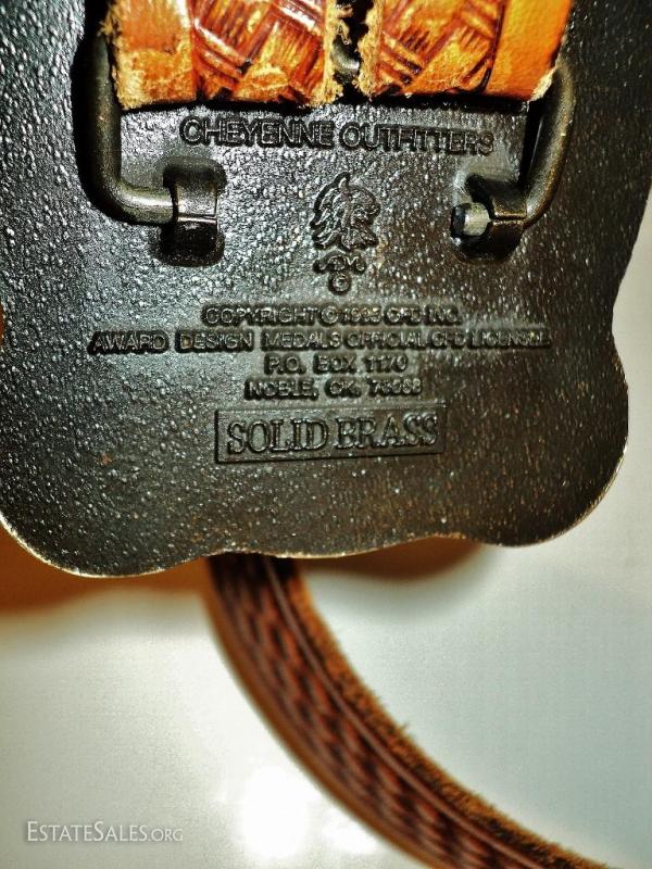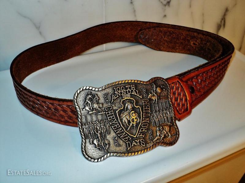 Cheyenne frontier leather carved belt solid brass buckle 100 years frontier days
