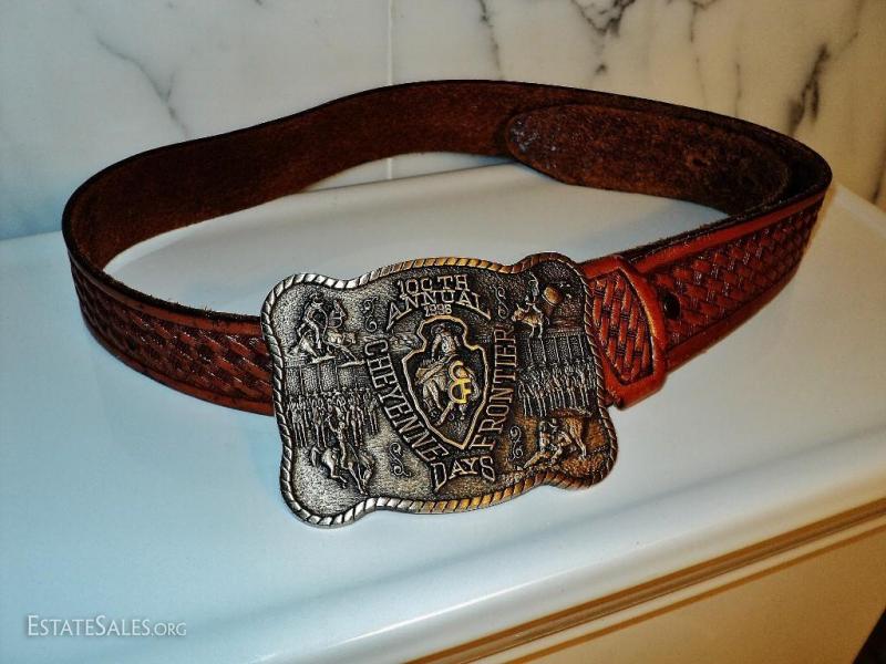 Cheyenne frontier leather carved belt solid brass buckle 100 years frontier days