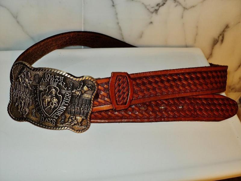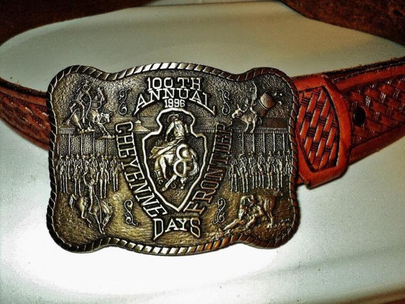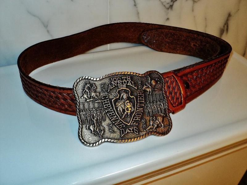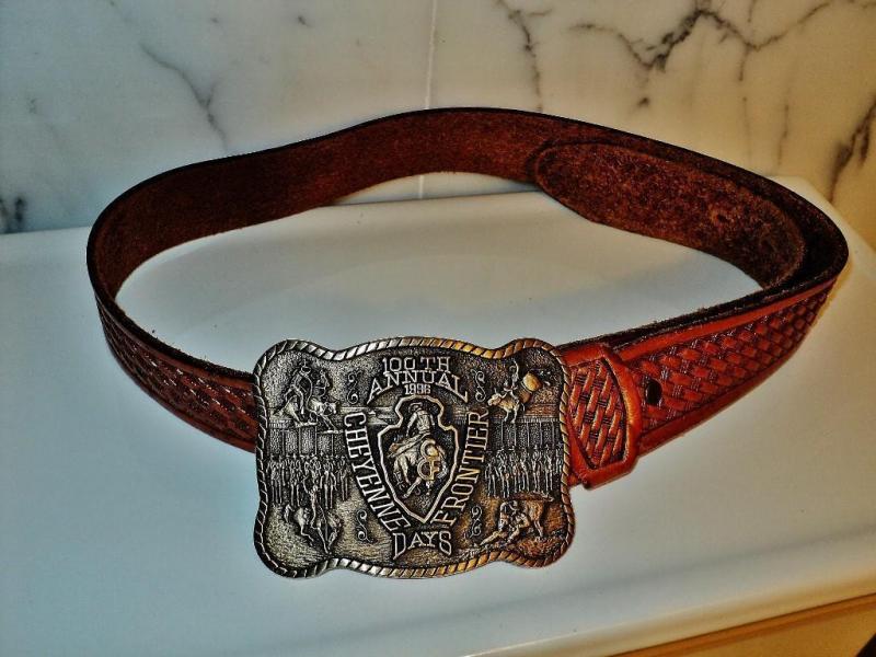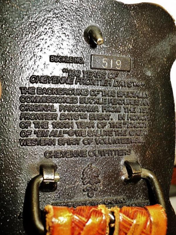 Amazing 100 years of Cheyenne frontier days solid leather hand cut carved and braided embossed weave with a large solid brass buckle all encrusted with dates and literature