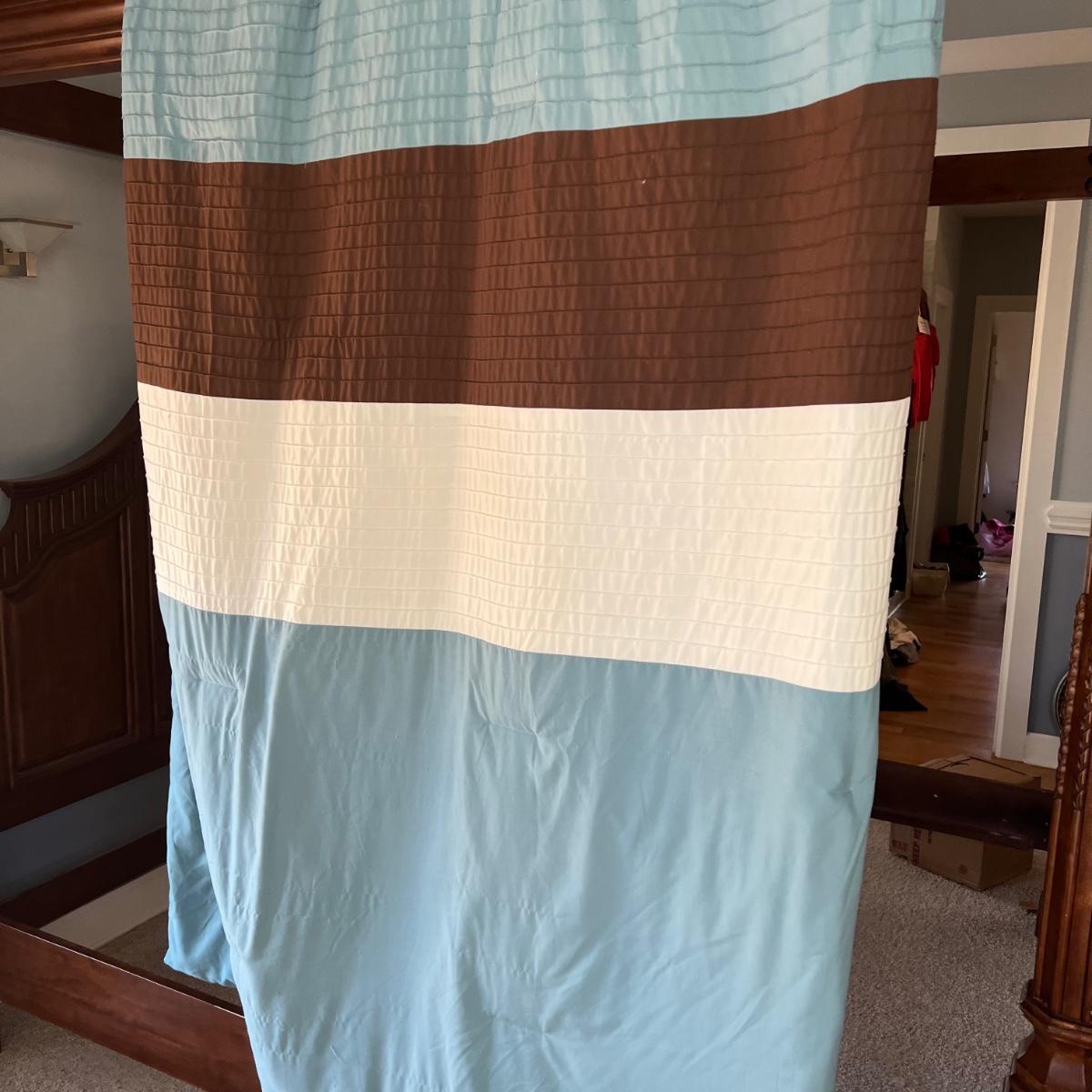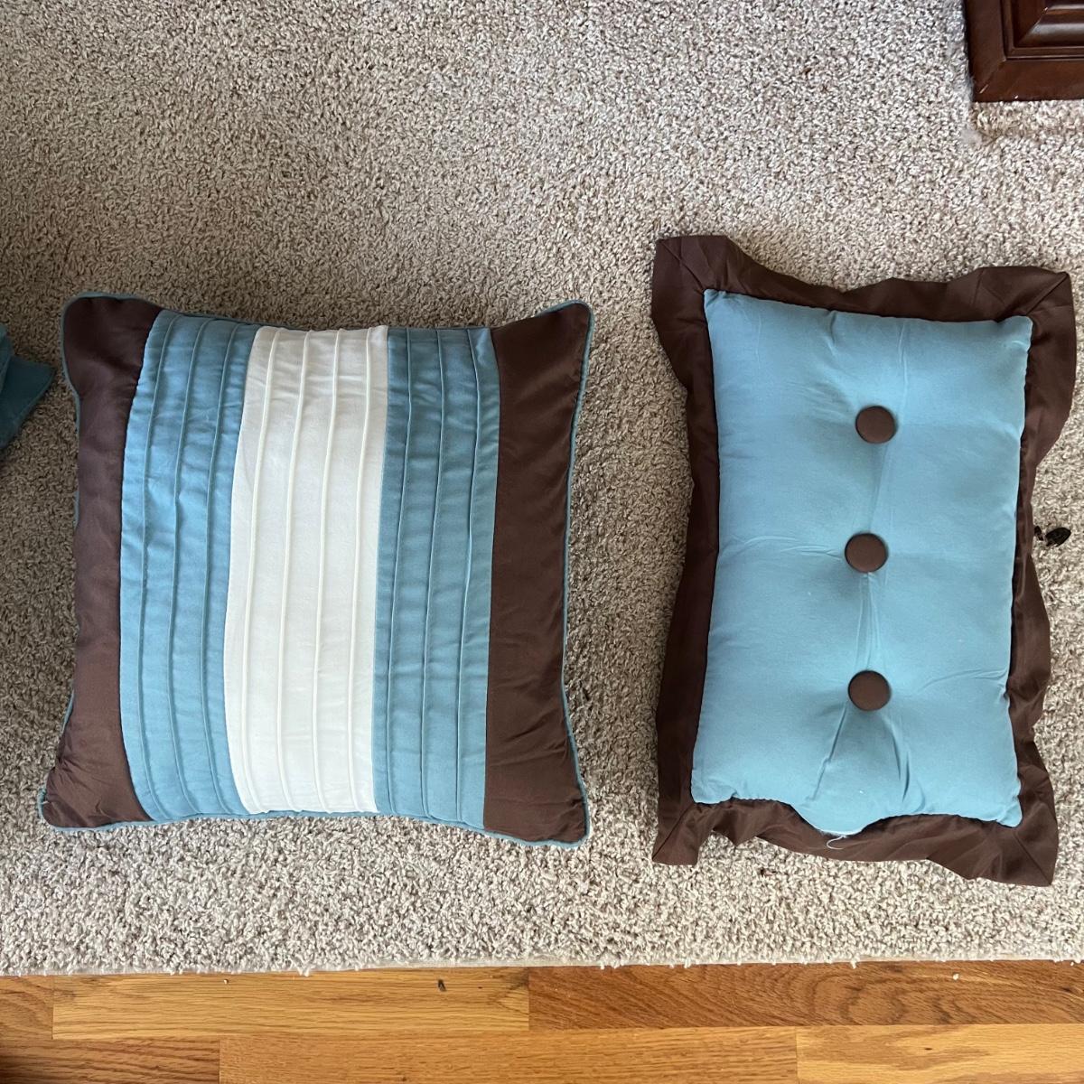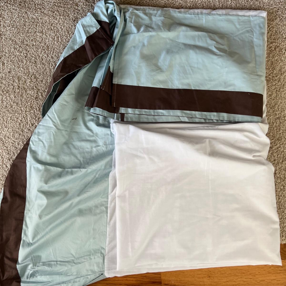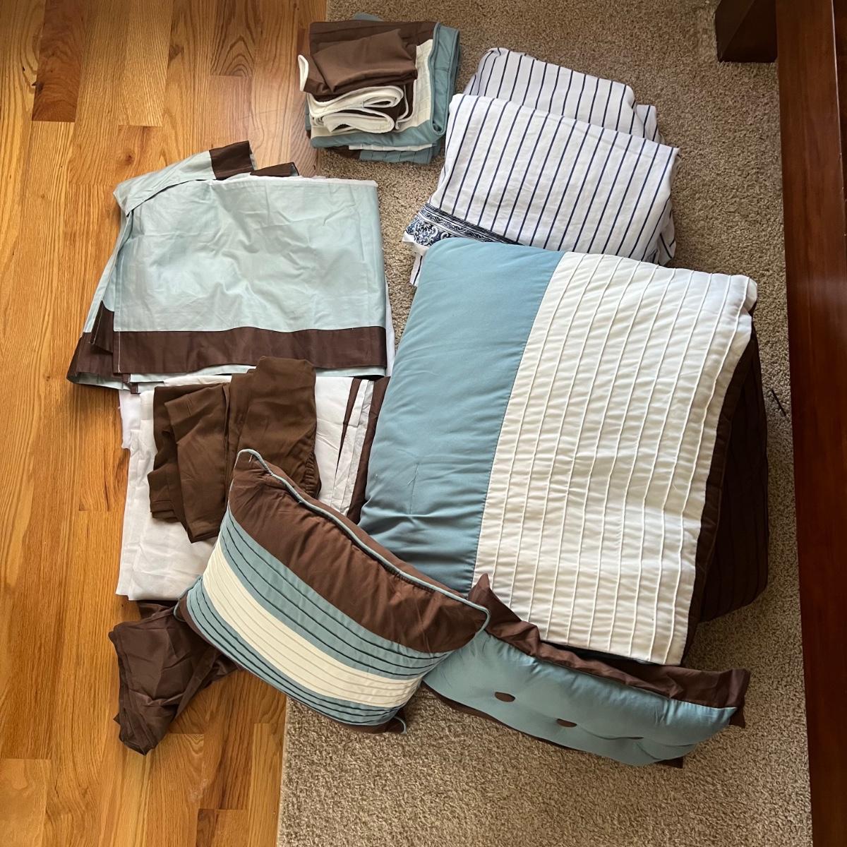 Teal, brown and cream king size linen set. Set includes blue and white striped Ralph Lauren 100% cotton sheets. Two throw pillows, one with minor damage as shown in the photographs. Two square brown shams with cream, two King shams, two King silk-like pillowcases, two bed skirts (one solid brown and one matching the comforter in color way). And one comforter. Shipping available.