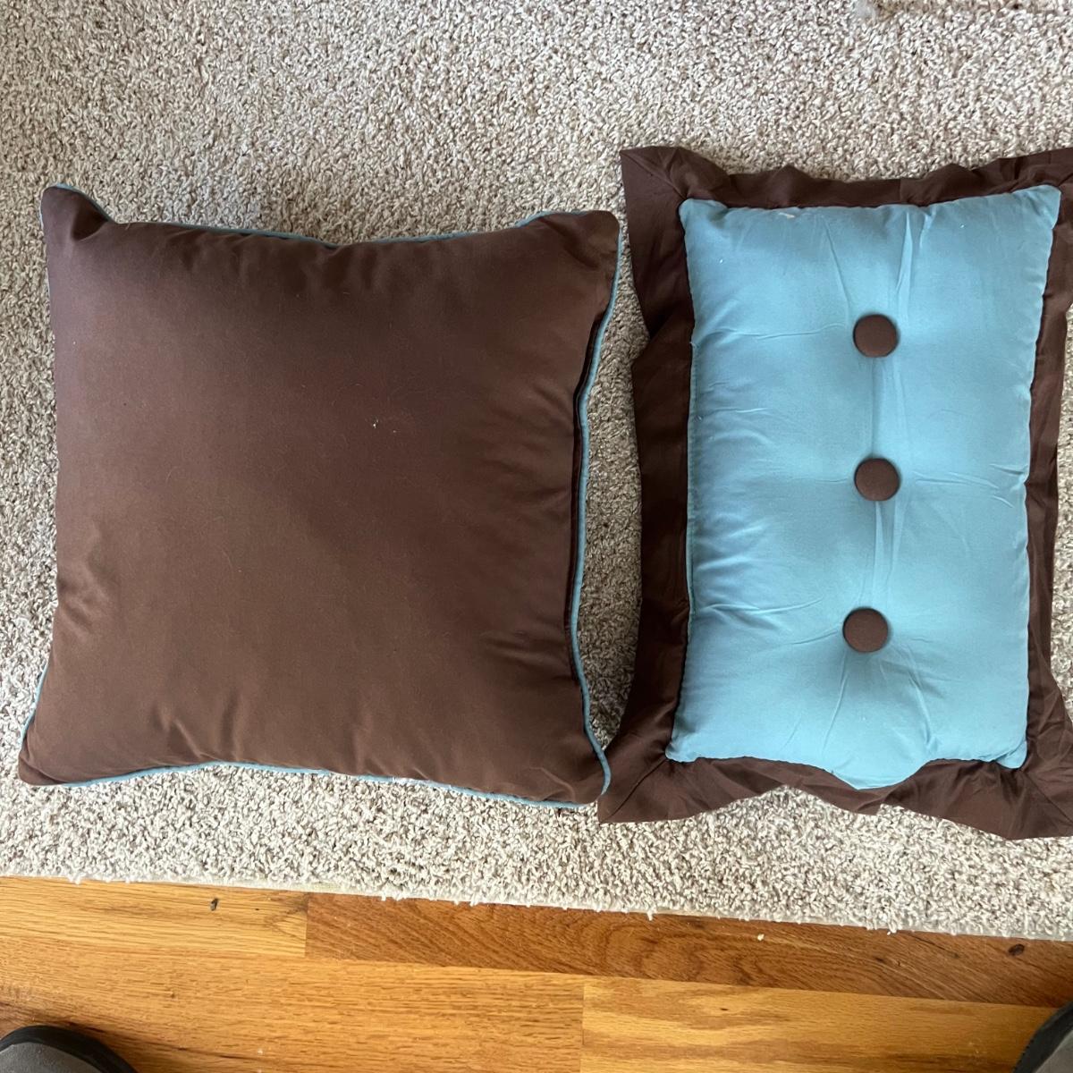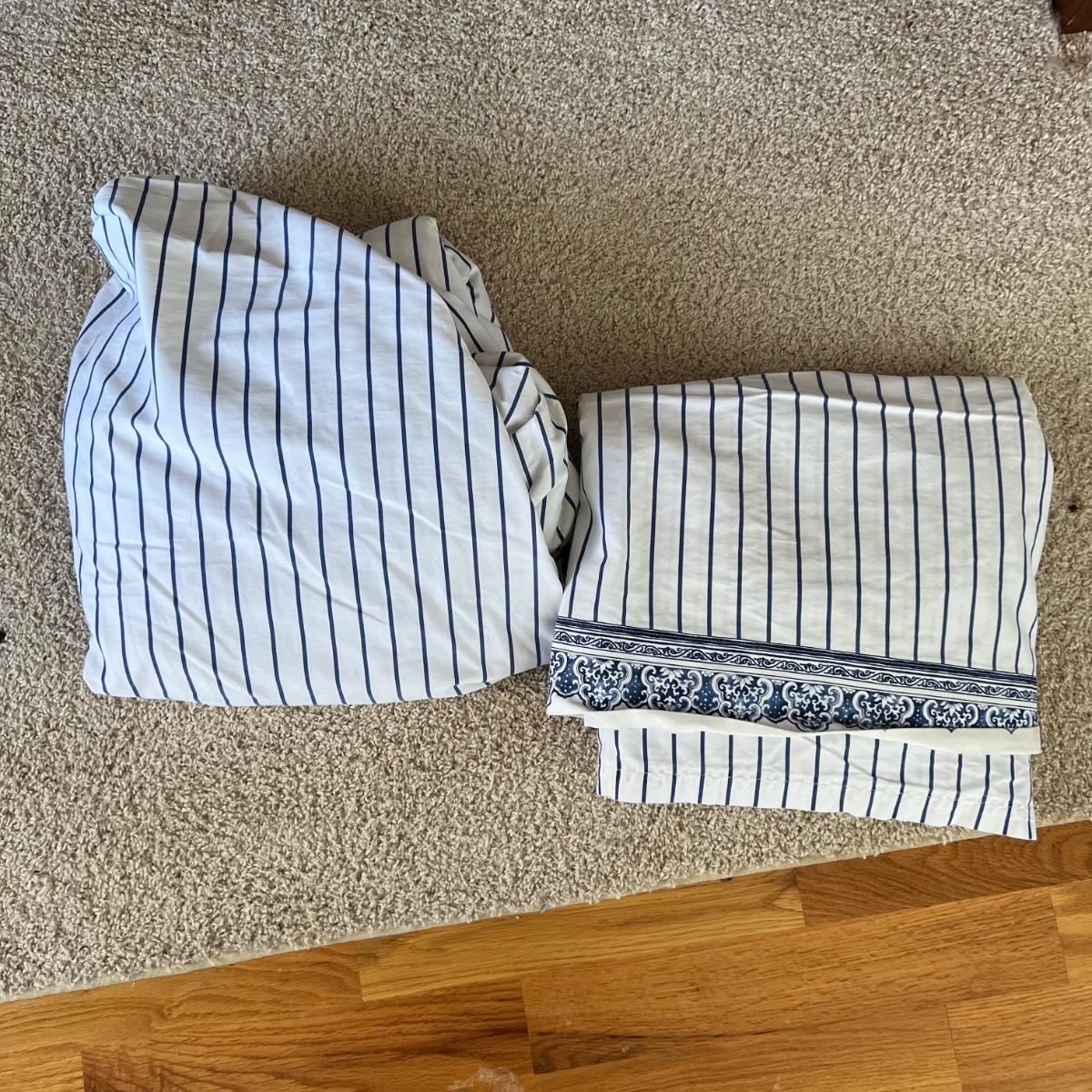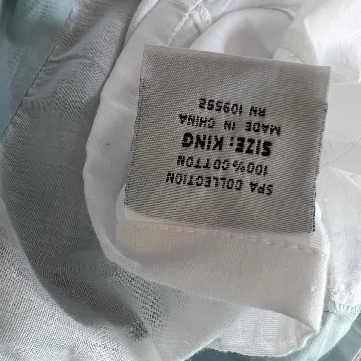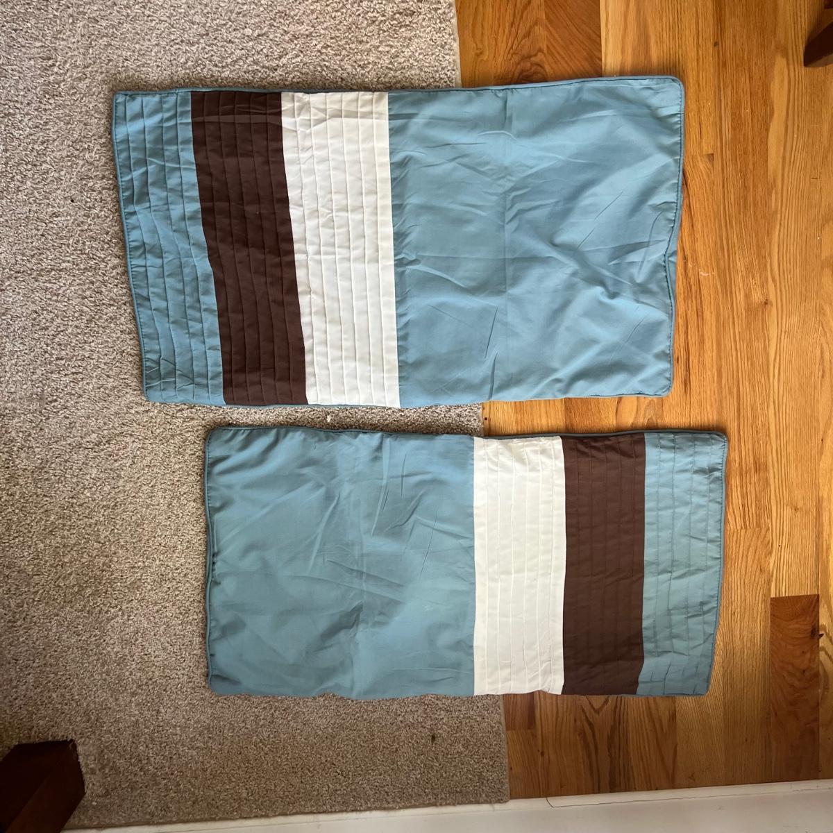 Teal, brown and cream king size linen set. Set includes blue and white striped Ralph Lauren 100% cotton sheets. Two throw pillows, one with minor damage as shown in the photographs. Two square brown shams with cream, two King shams, two King silk-like pillowcases, two bed skirts (one solid brown and one matching the comforter in color way). And one comforter. Shipping available.
