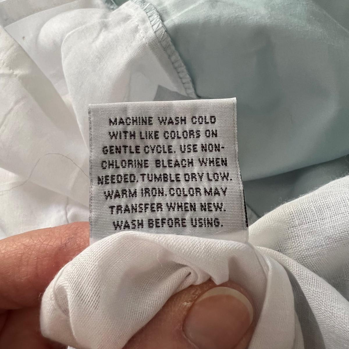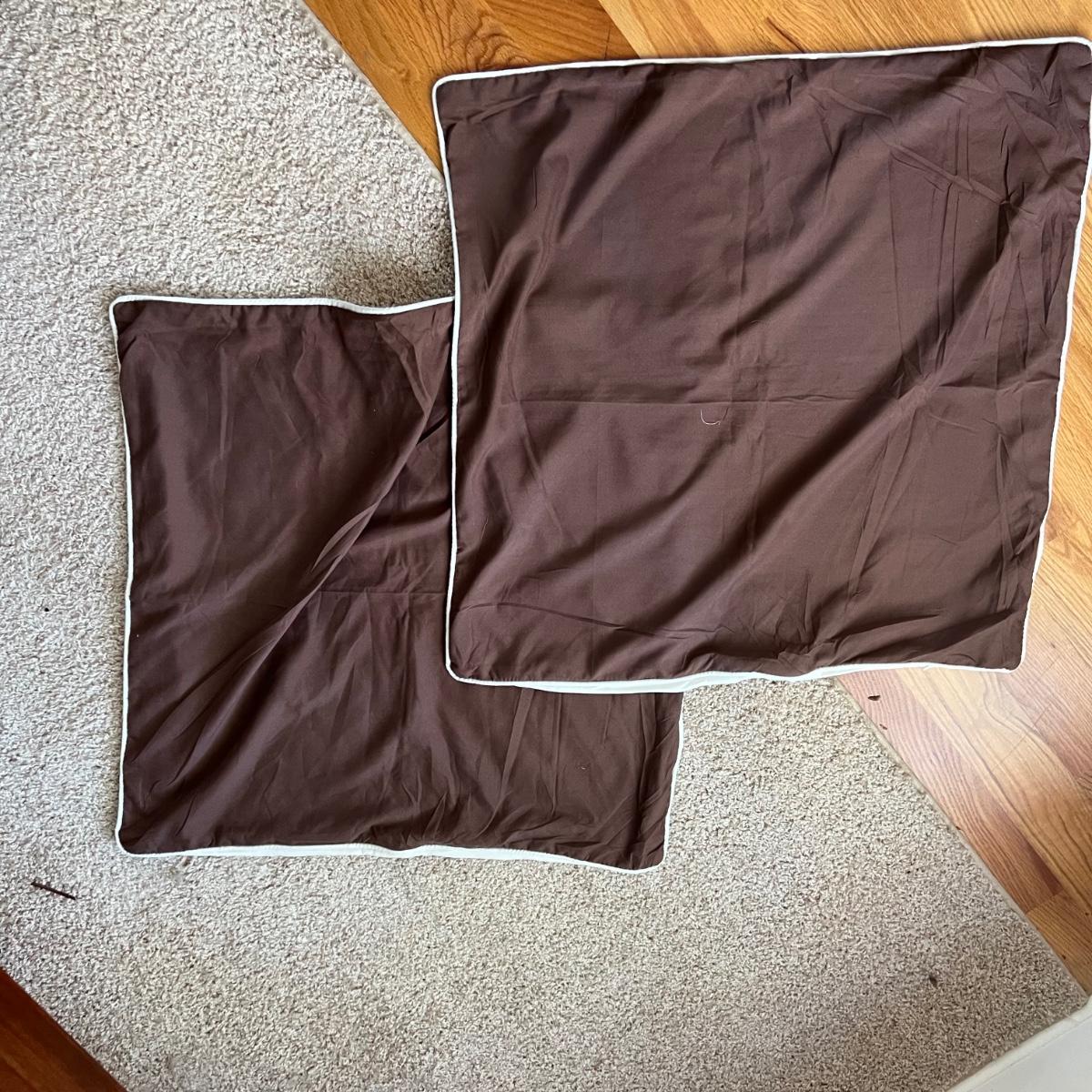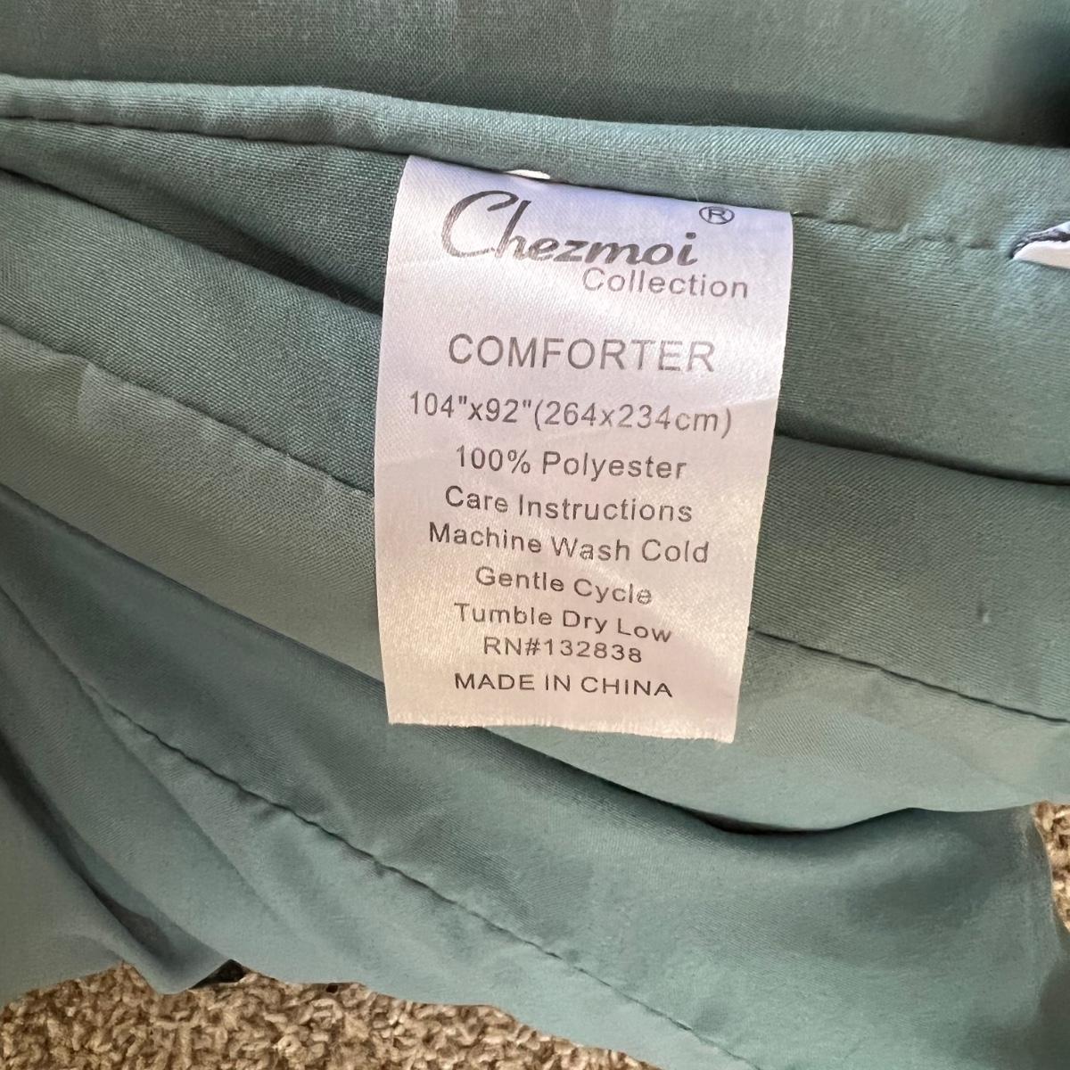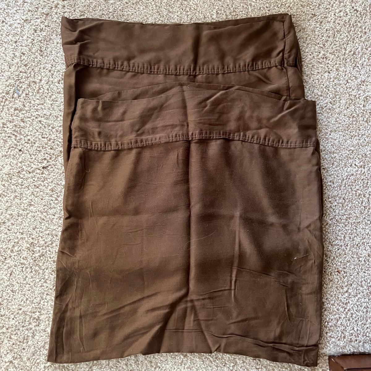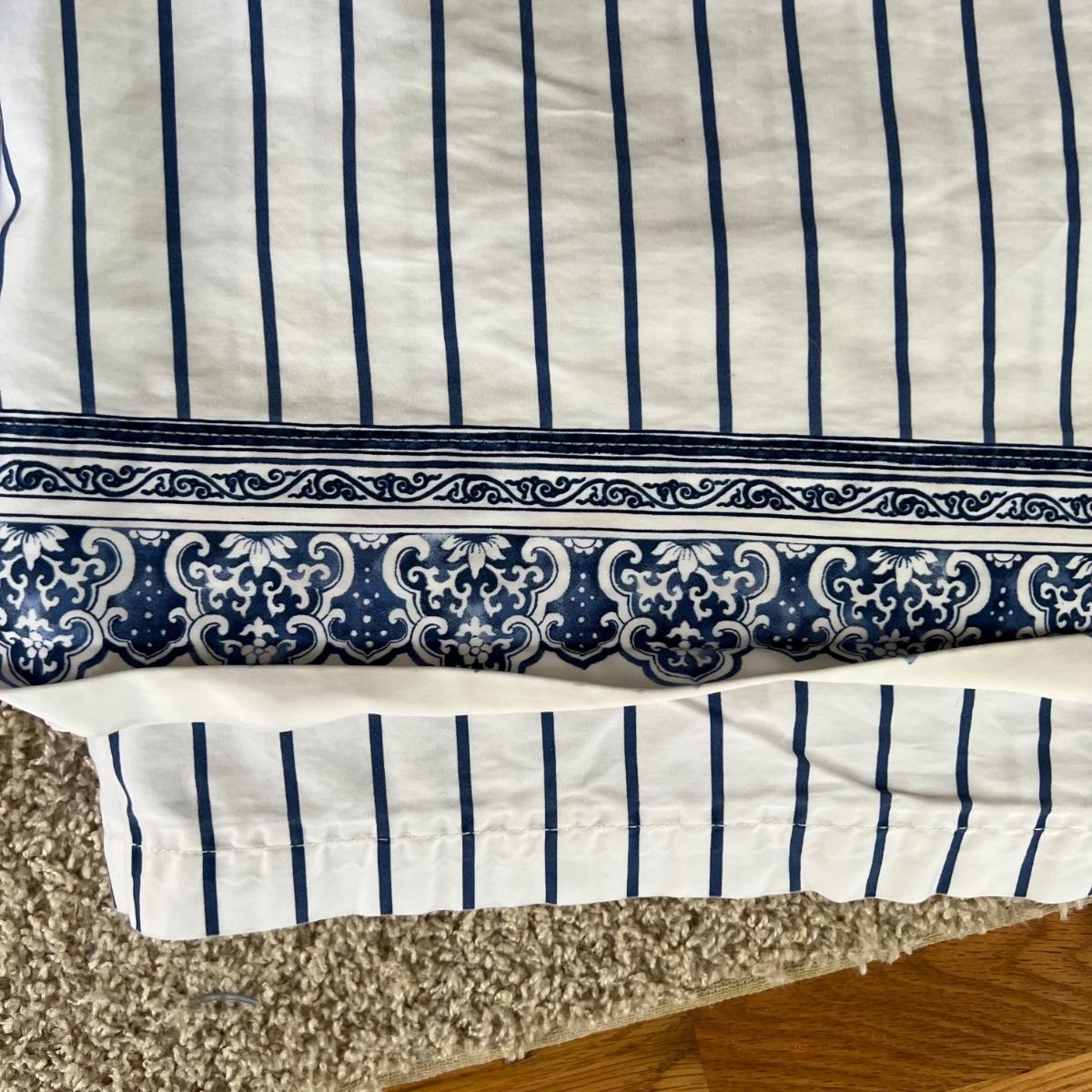 Teal, brown and cream king size linen set. Set includes blue and white striped Ralph Lauren 100% cotton sheets. Two throw pillows, one with minor damage as shown in the photographs. Two square brown shams with cream, two King shams, two King silk-like pillowcases, two bed skirts (one solid brown and one matching the comforter in color way). And one comforter. Shipping available.