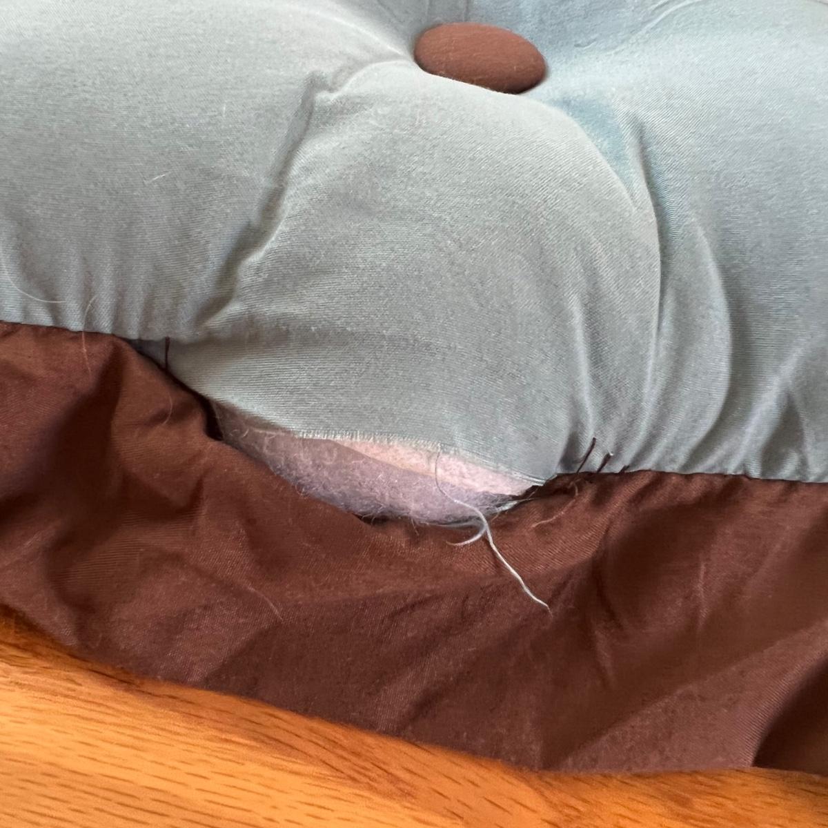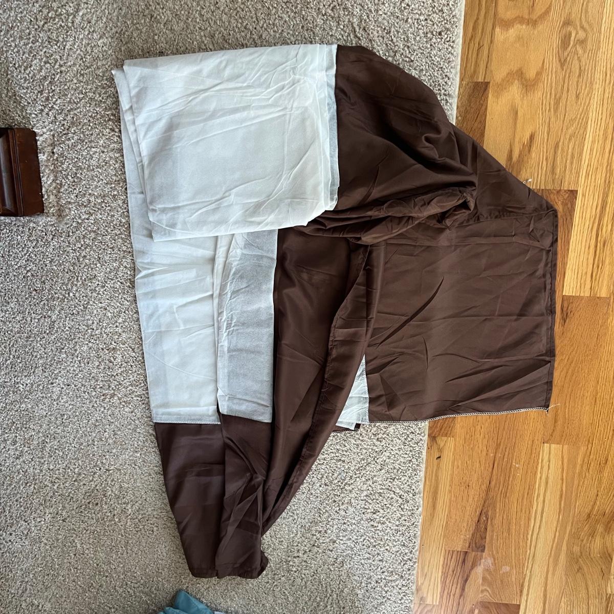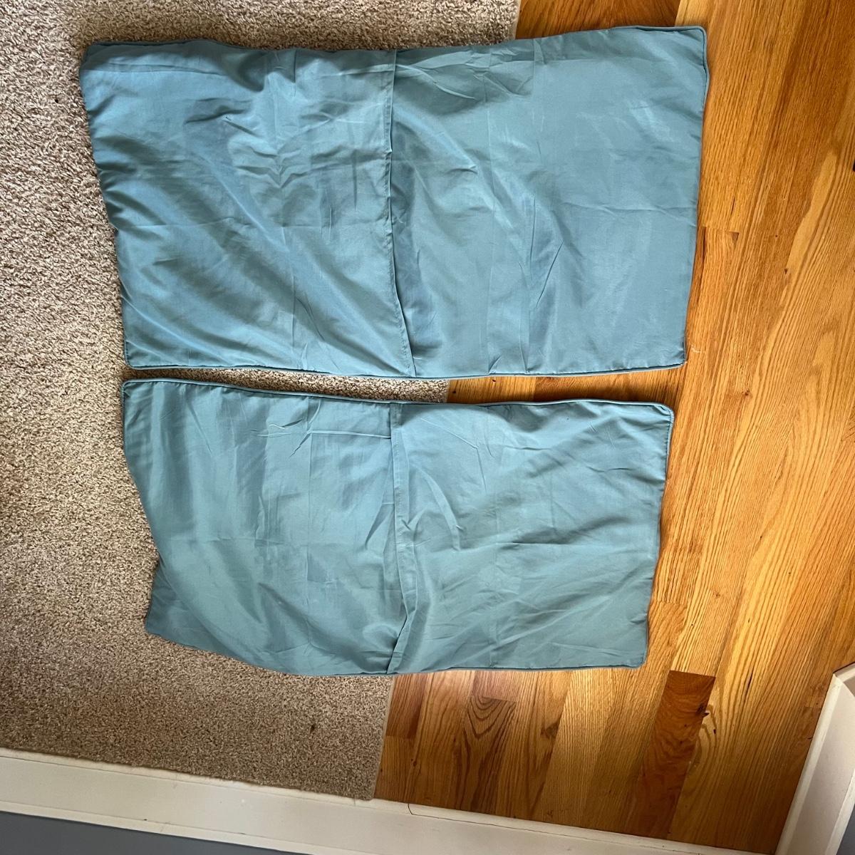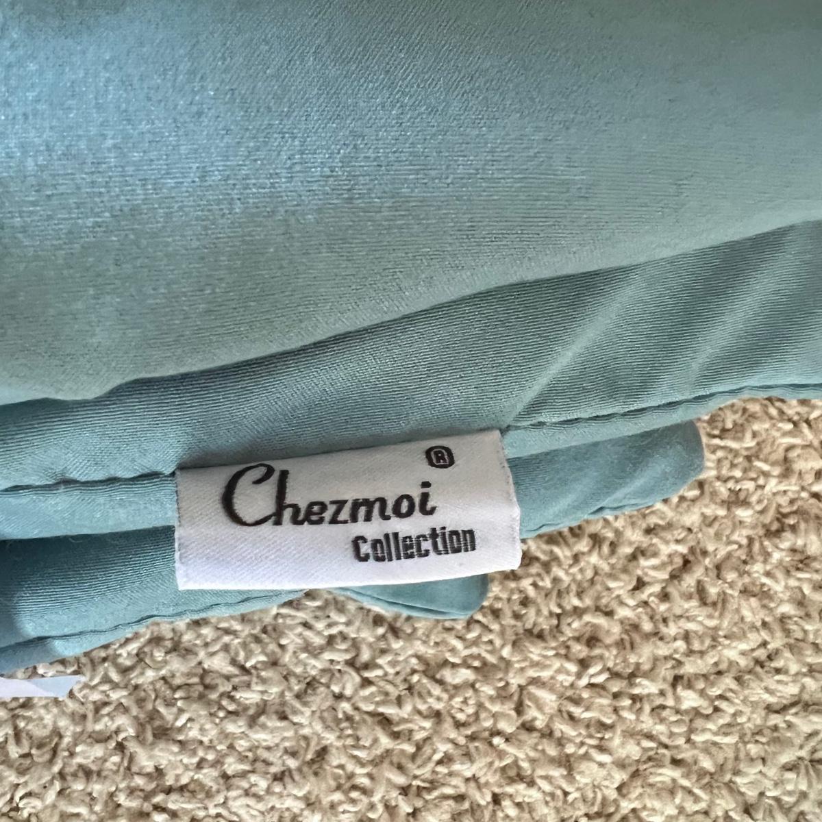 Teal, brown and cream king size linen set. Set includes blue and white striped Ralph Lauren 100% cotton sheets. Two throw pillows, one with minor damage as shown in the photographs. Two square brown shams with cream, two King shams, two King silk-like pillowcases, two bed skirts (one solid brown and one matching the comforter in color way). And one comforter. Shipping available.