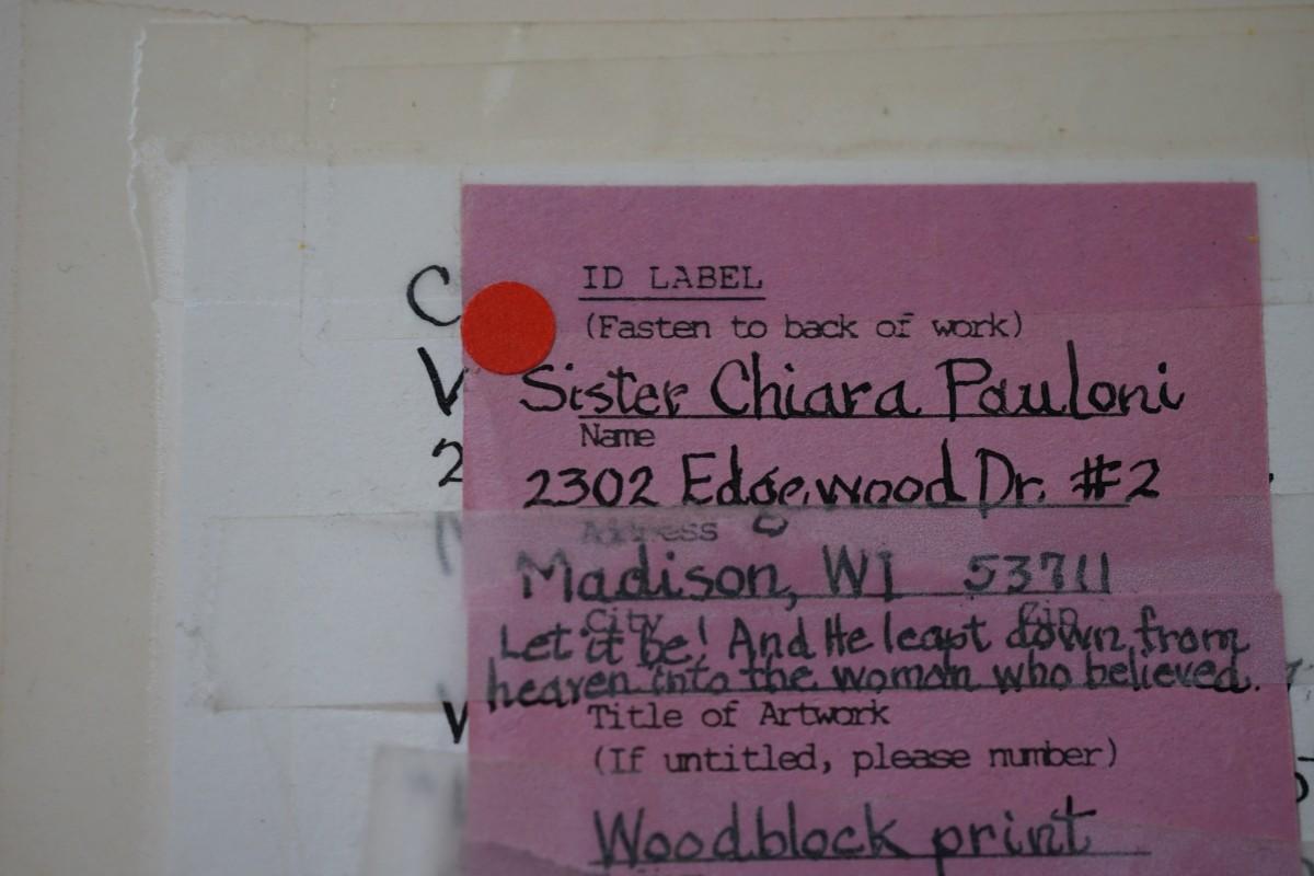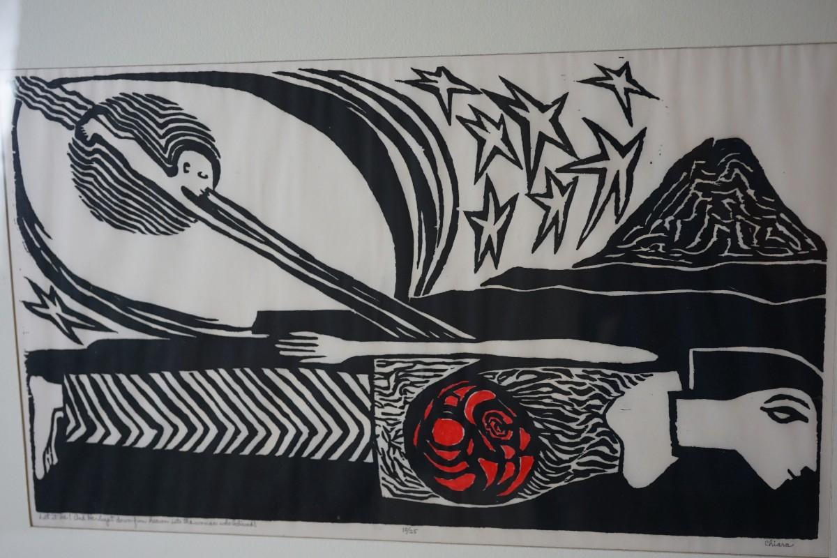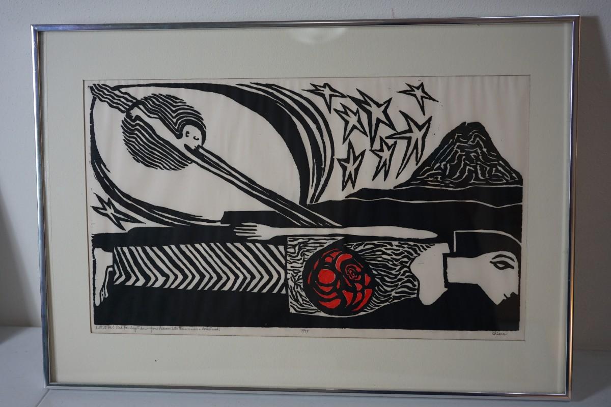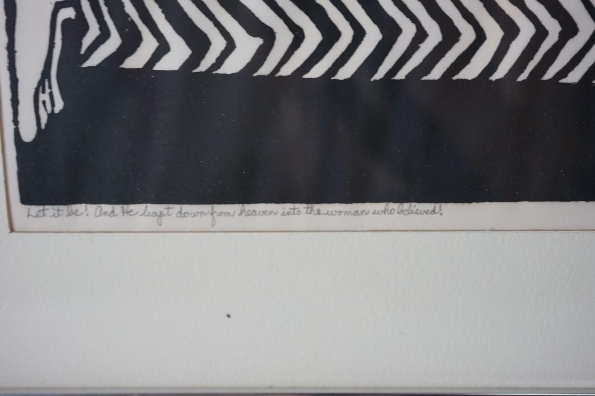 Chiara PAULONI woodblock TITLE " LET IT BE! AND HE LEAPTDOWN FROM HEAVEN INTO THE WOMEN WHO BELIEVED ! 10/25