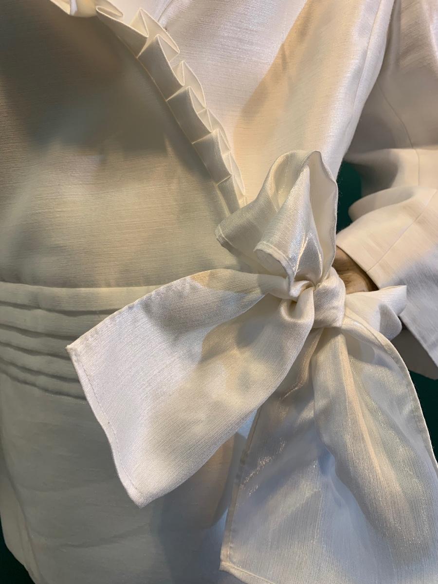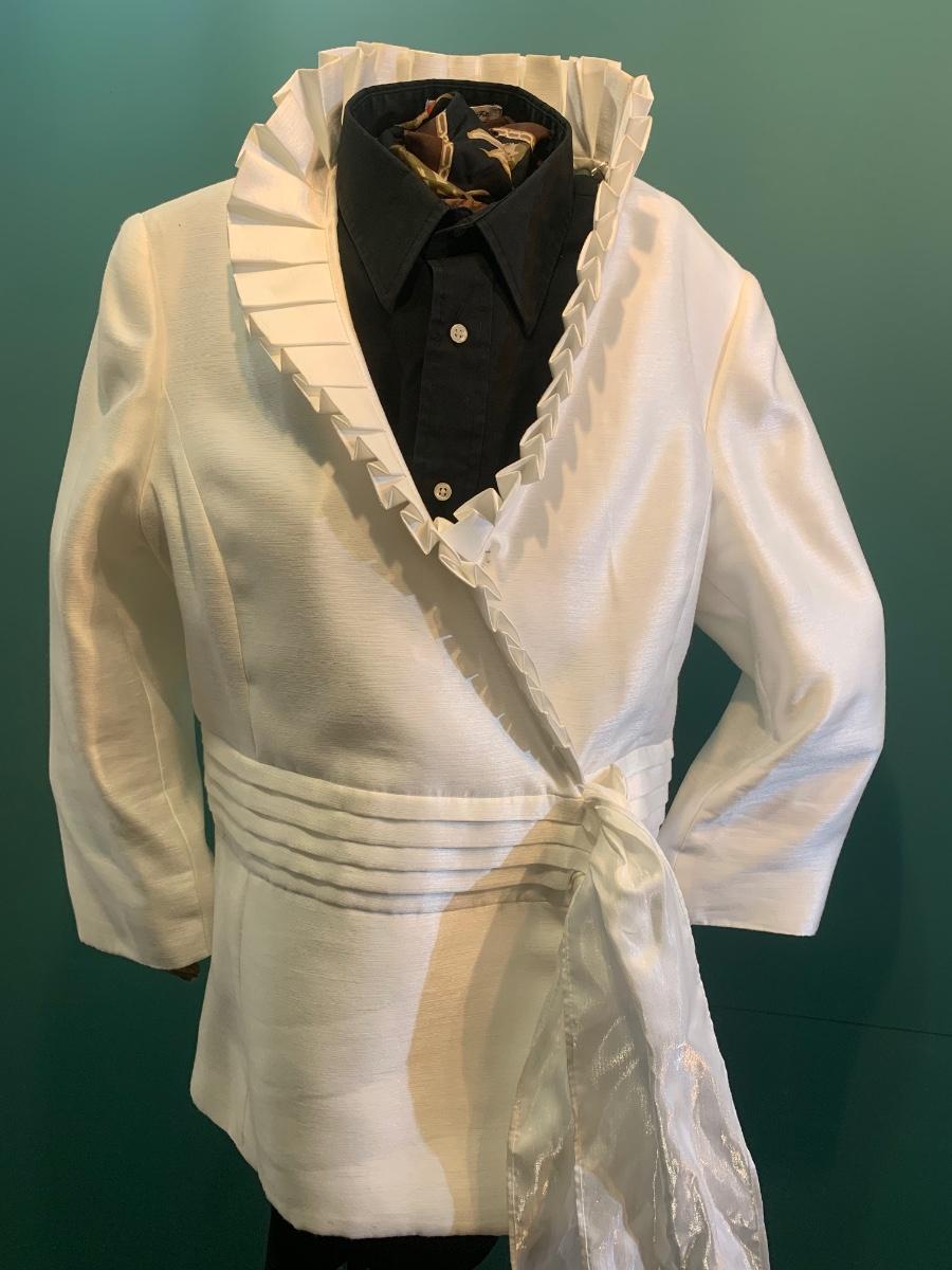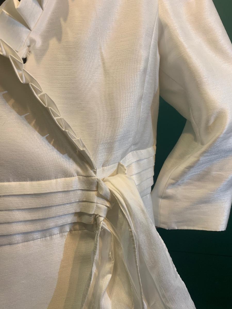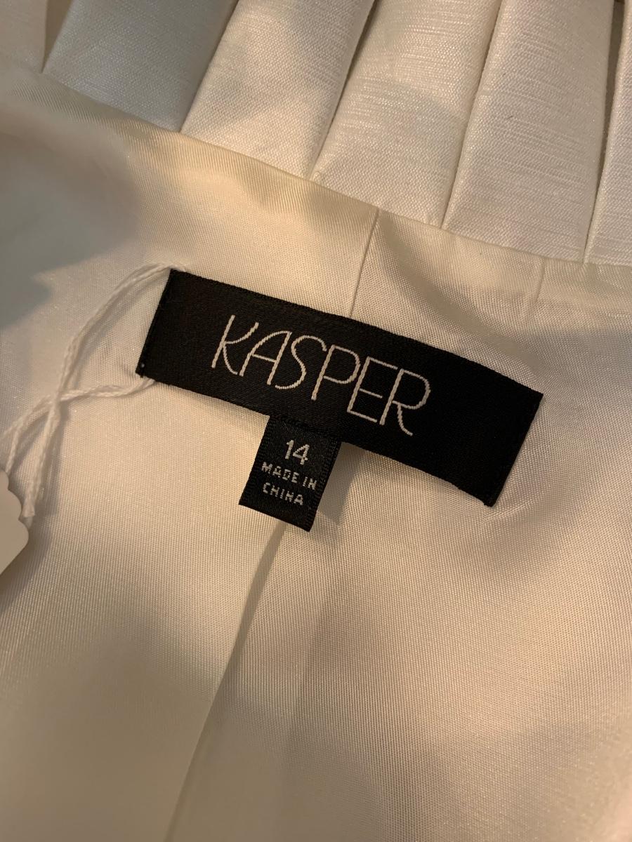 Indulge in timeless sophistication with this Kasper dress jacket. Adorned with a graceful ruffle collar and a flattering side tie, this size 14 piece embodies chic style for your holiday gatherings. Elevate your festive wardrobe with this refined and fancy jacket, a perfect blend of fashion and flair. Accessories not included,