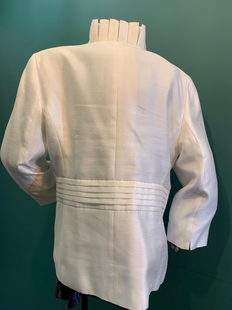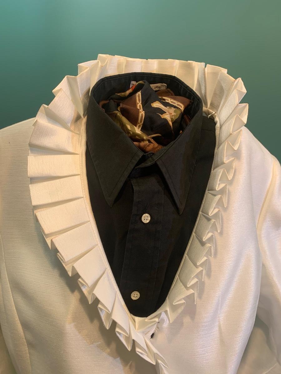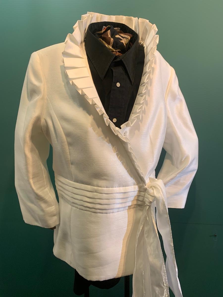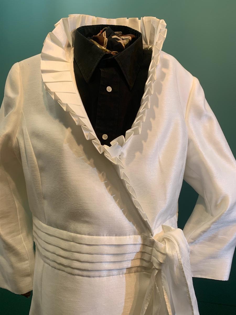 Indulge in timeless sophistication with this Kasper dress jacket. Adorned with a graceful ruffle collar and a flattering side tie, this size 14 piece embodies chic style for your holiday gatherings. Elevate your festive wardrobe with this refined and fancy jacket, a perfect blend of fashion and flair. Accessories not included,