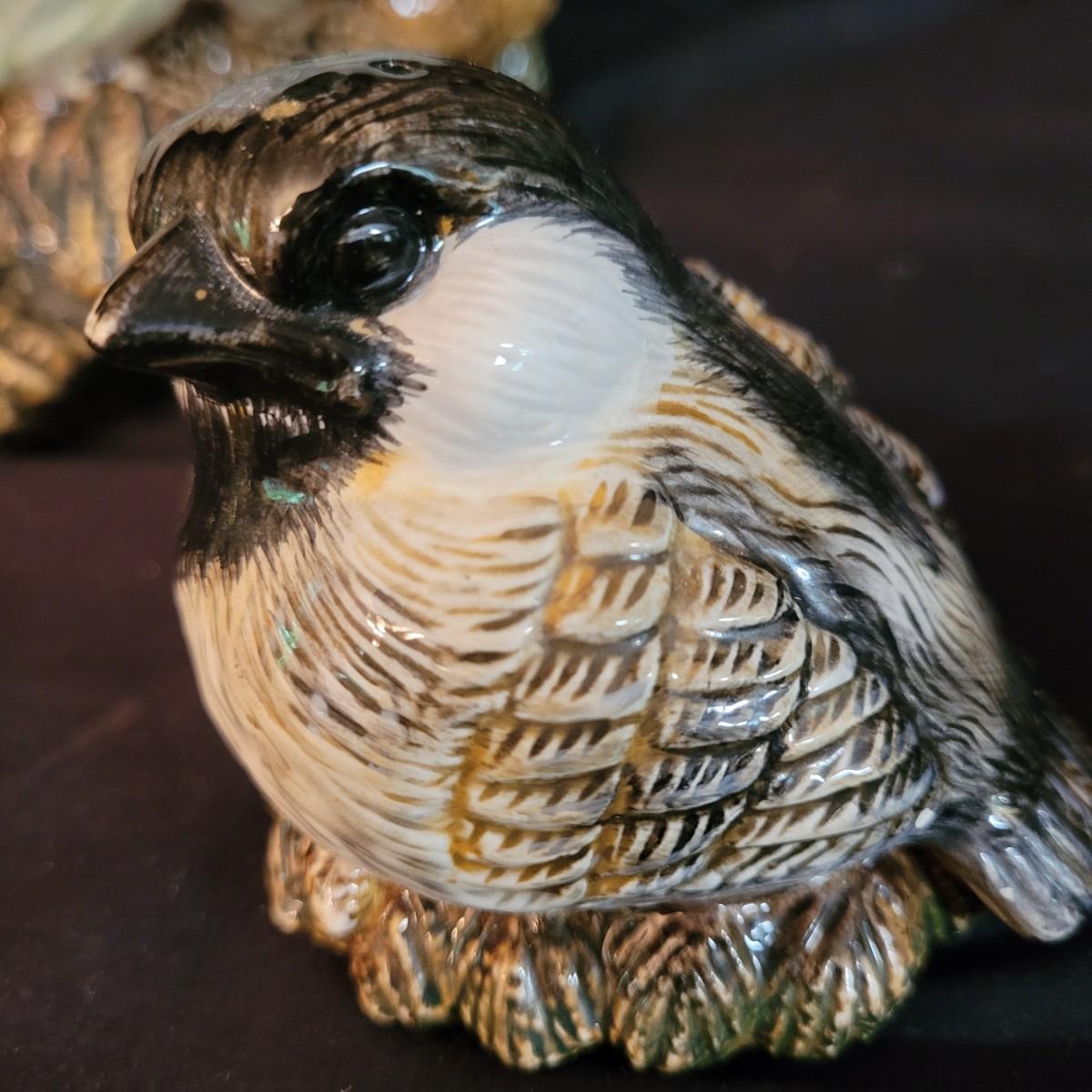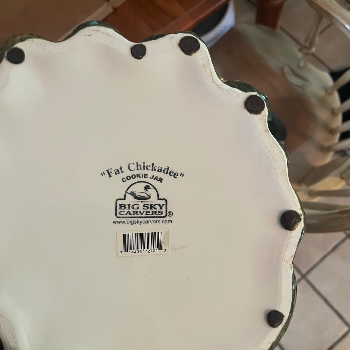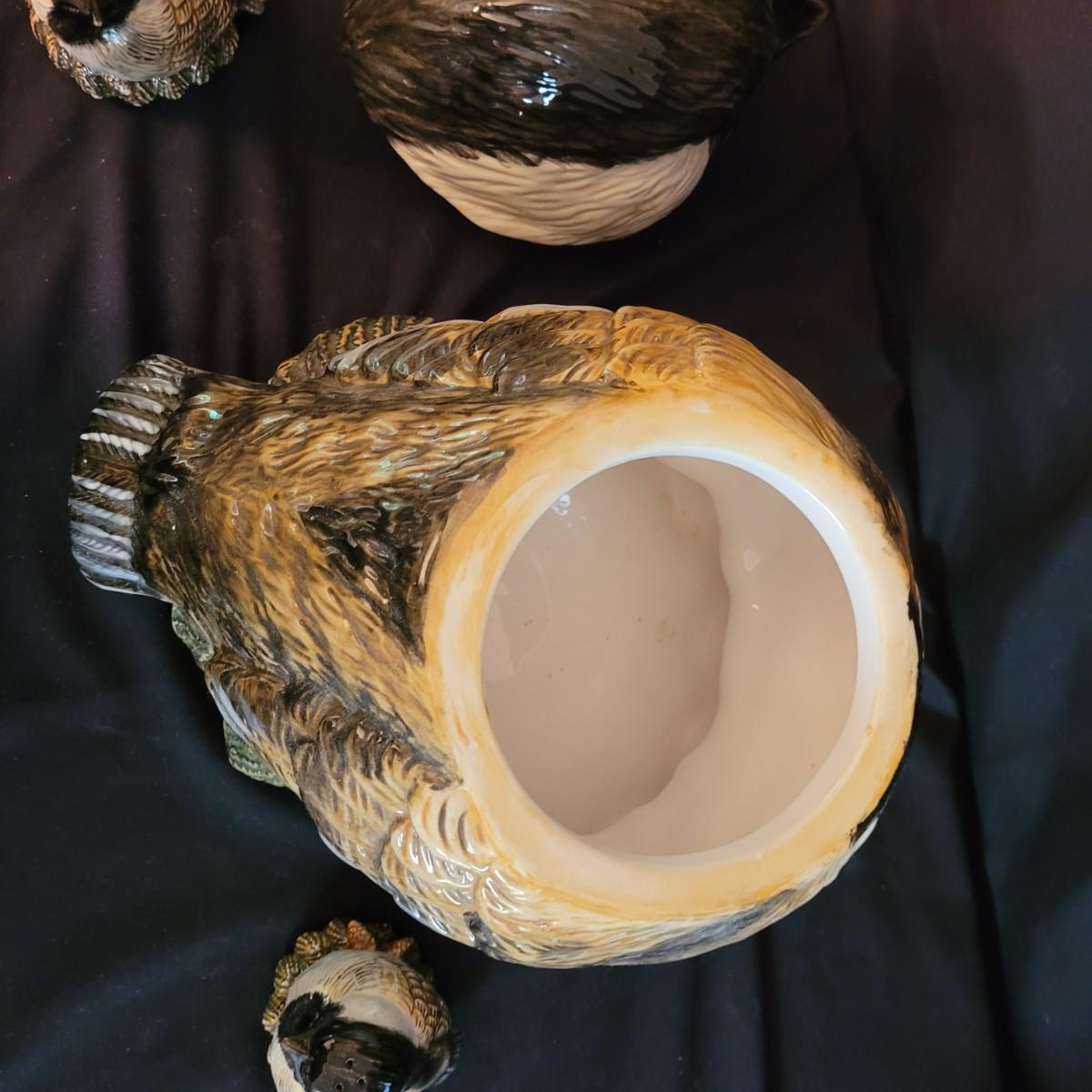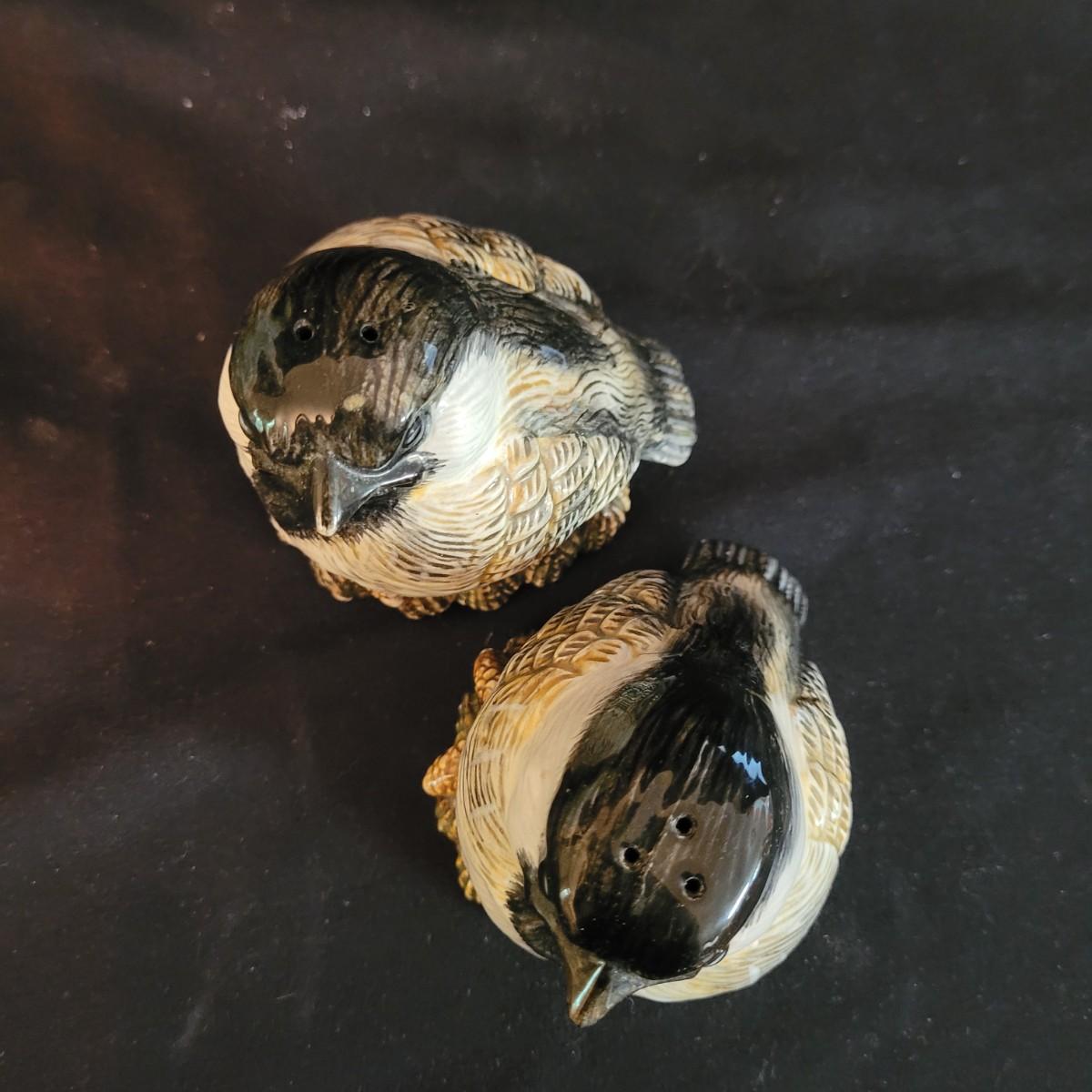 This lot includes a large ceramic chickadee cookie jar and salt and pepper shakers. Jar measures approximately 11”H. Shipping available.