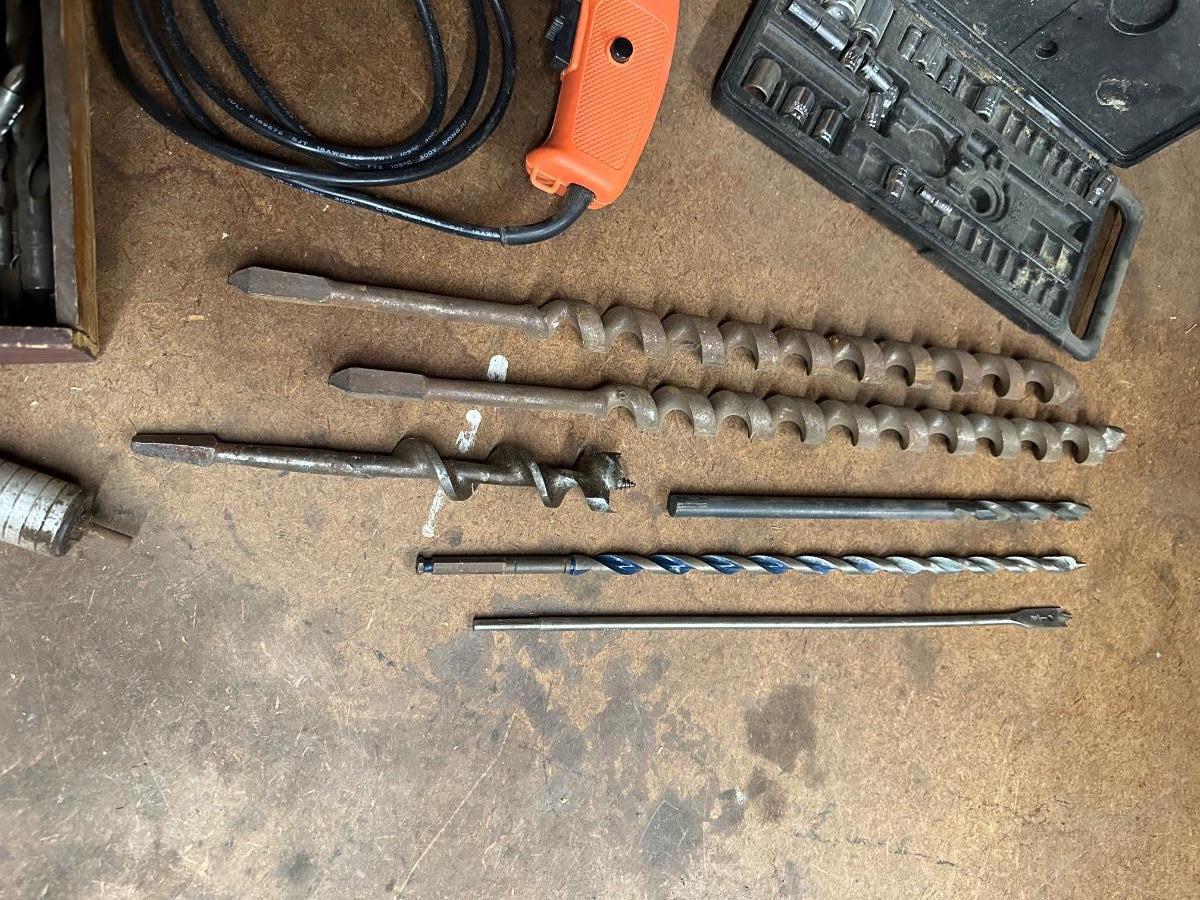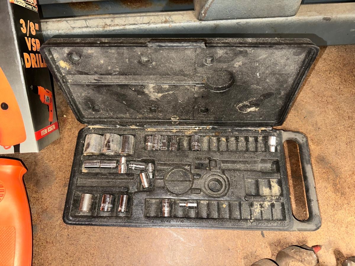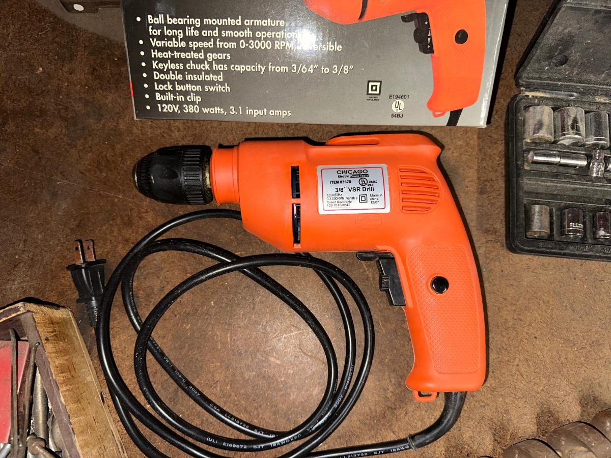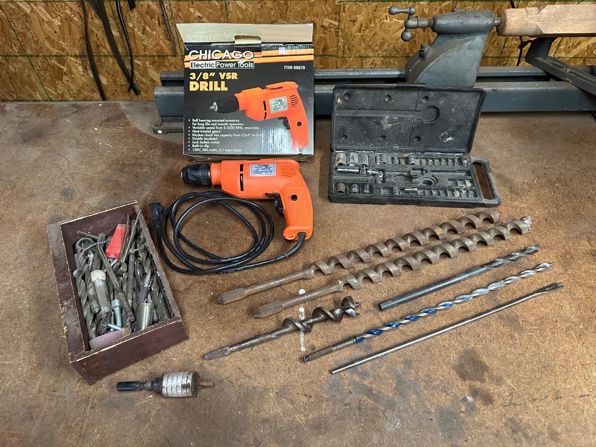 CHICAGO 3/8” VSR DRILL, DRILL BITS AND SOME SOCKETS