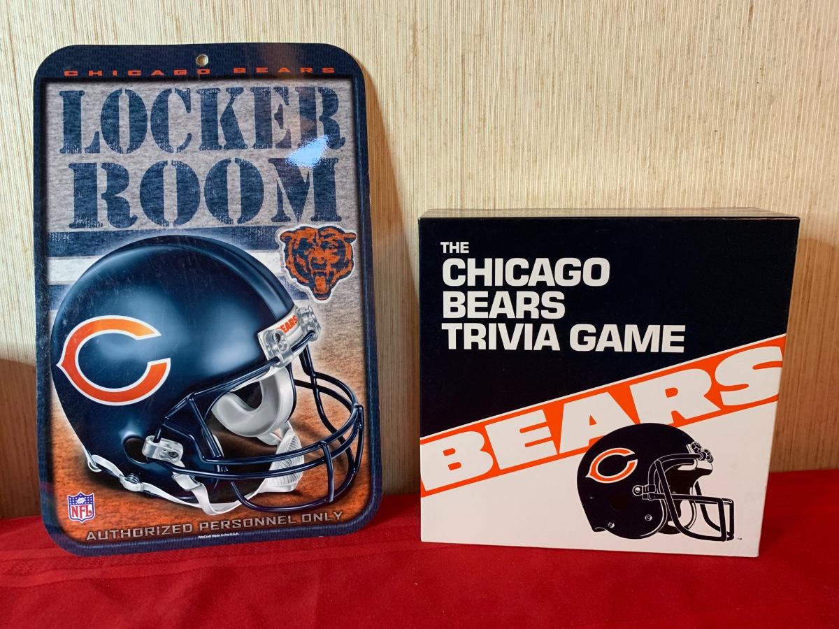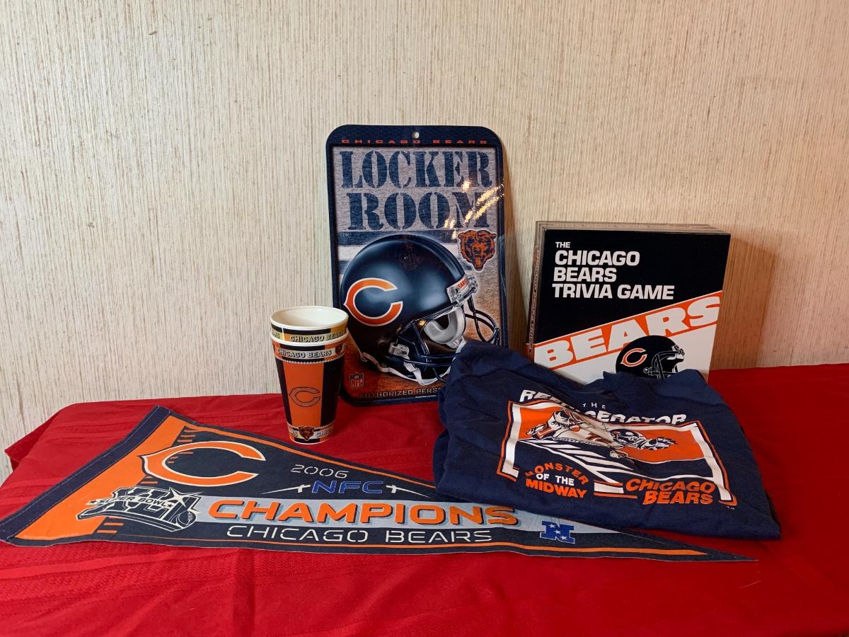 Misc chicago bears memorabilia including a bears trivia game, two tumblers, one bears sweatshirt and one pennant
