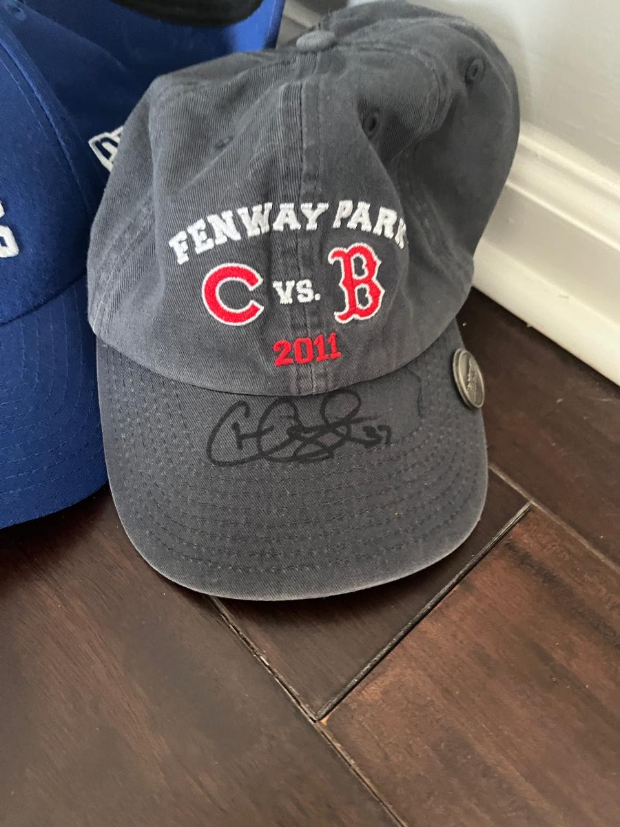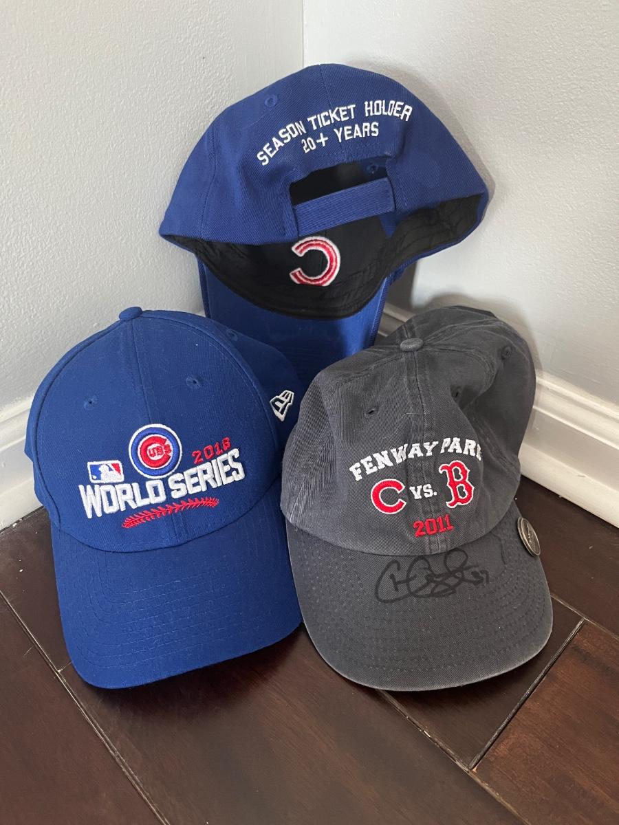 Lot of 3 Chicago Cubs baseball caps. One World Series Cap from 2016, one season ticket holder cap, and one cap from the 2011 Cubs game at Fenway, signed by #37 Chris Carpenter, a former Cubs pitcher.