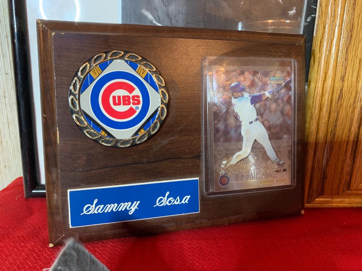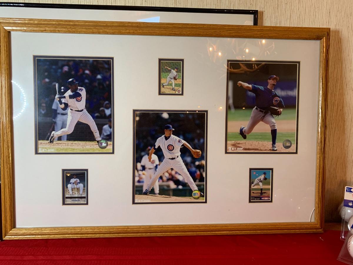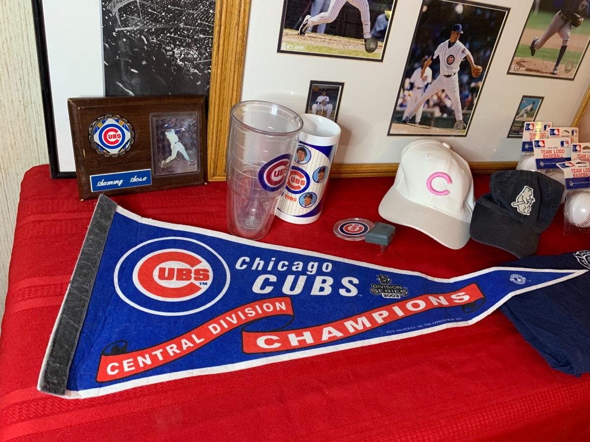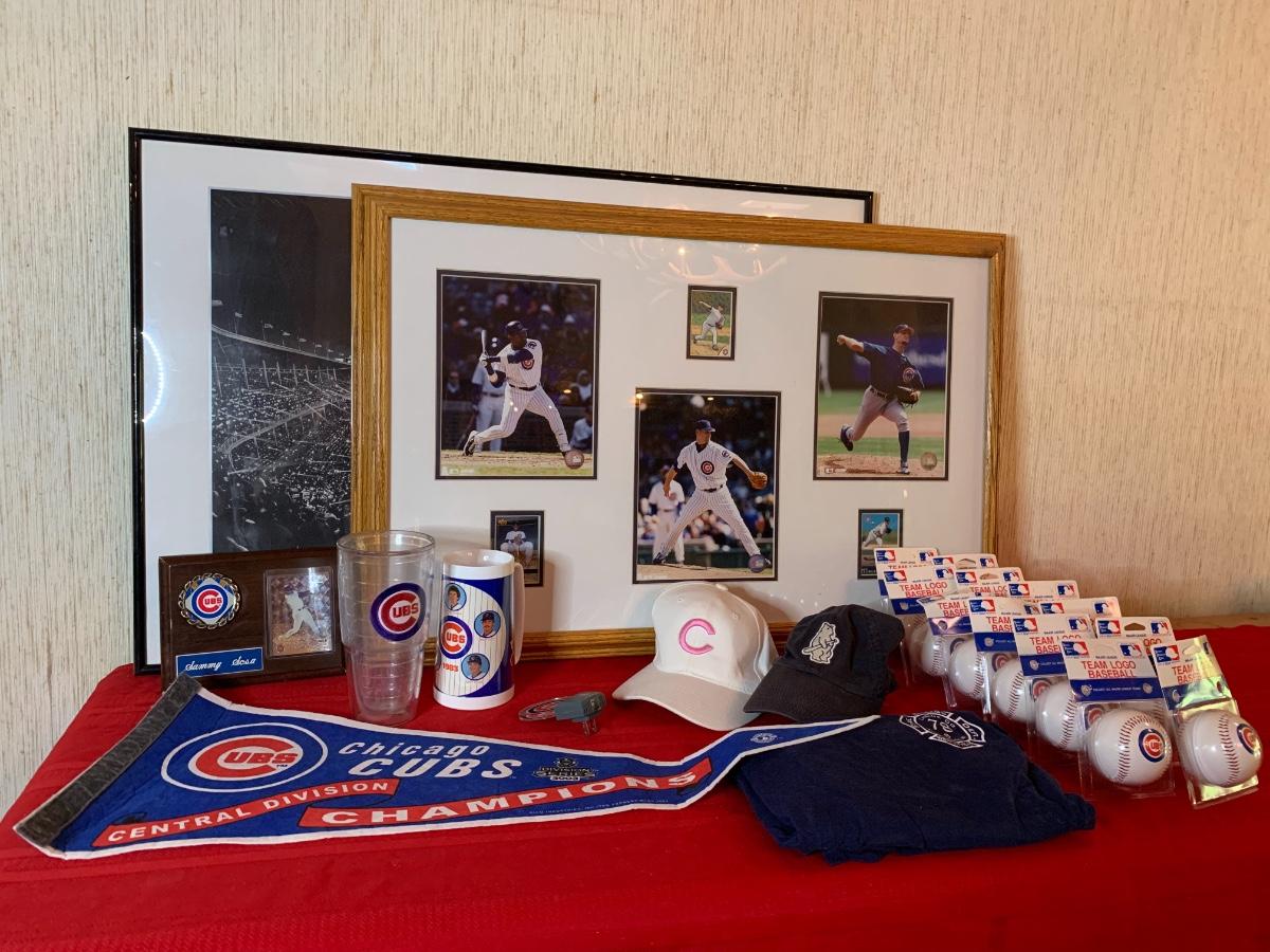 Artwork including one framed picture of Wrigley field, one framed picture of 3 baseball cards with some glass damage to lower right side, cubs tumblers, cubs hats, numerous cubs team logo baseballs and one cubs pennant flag from division series 2003