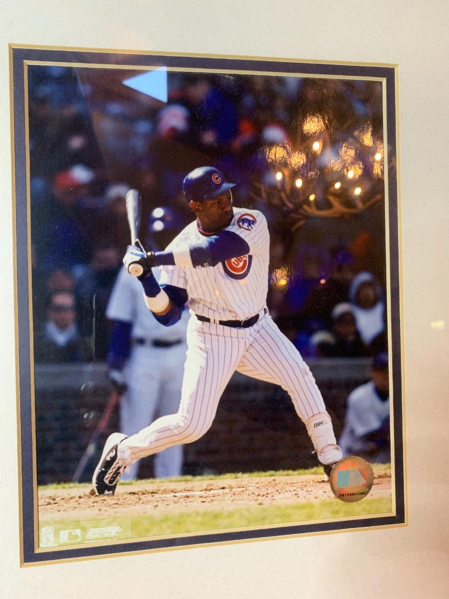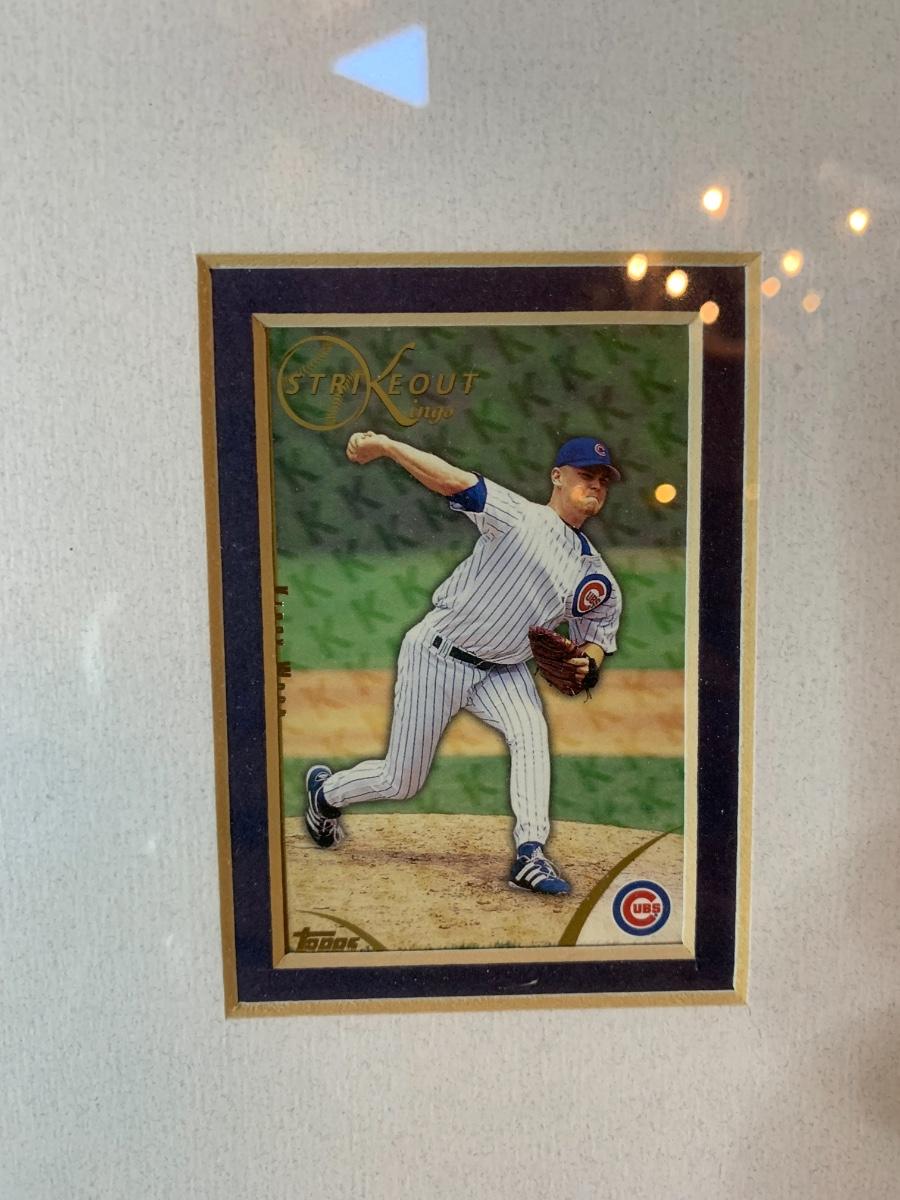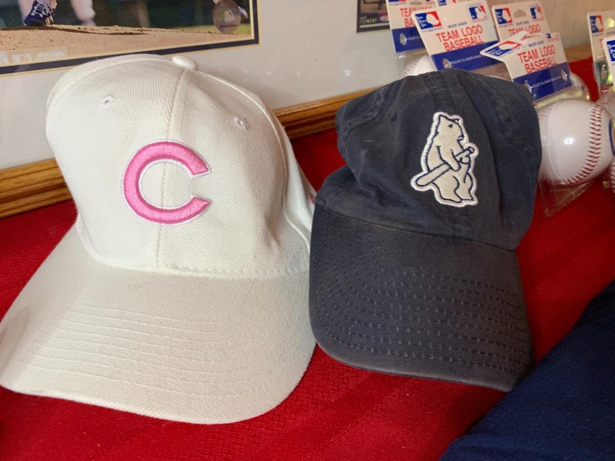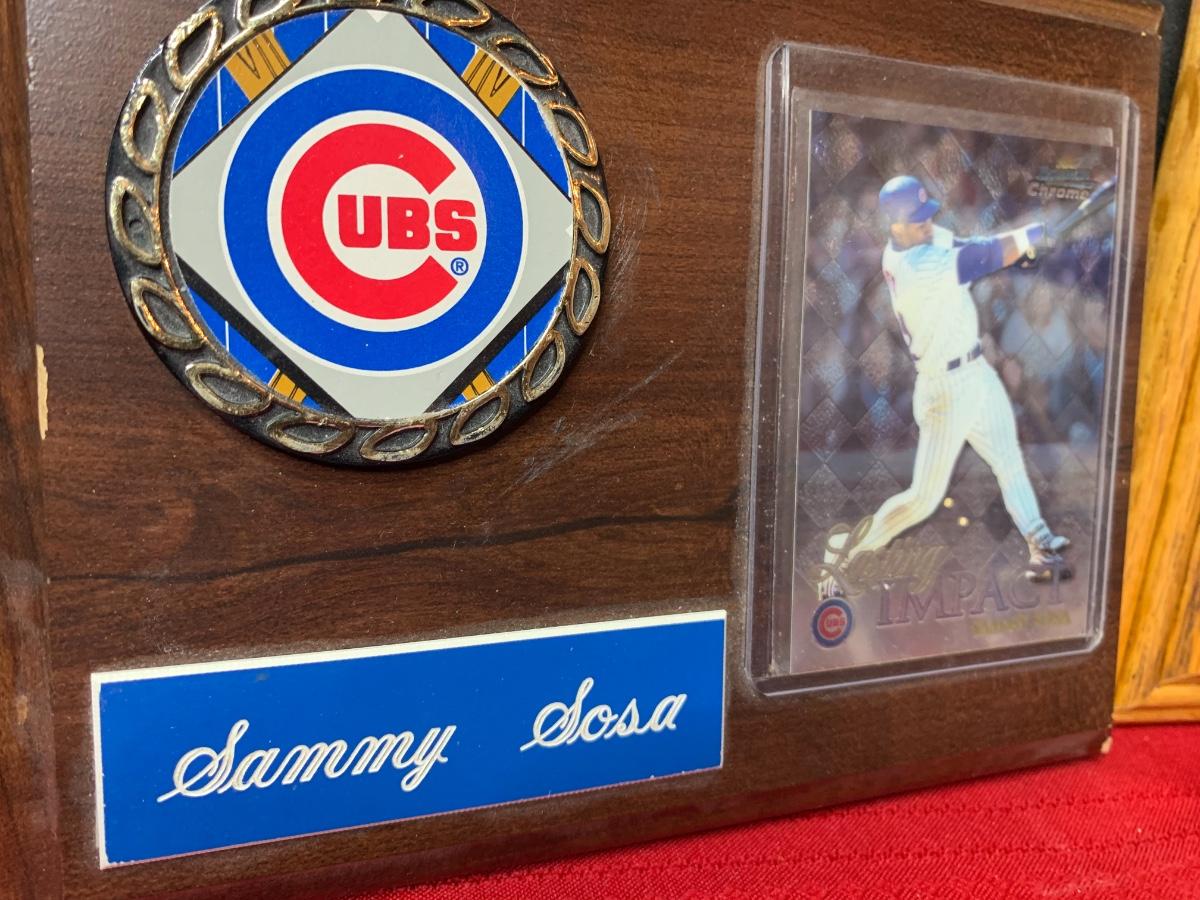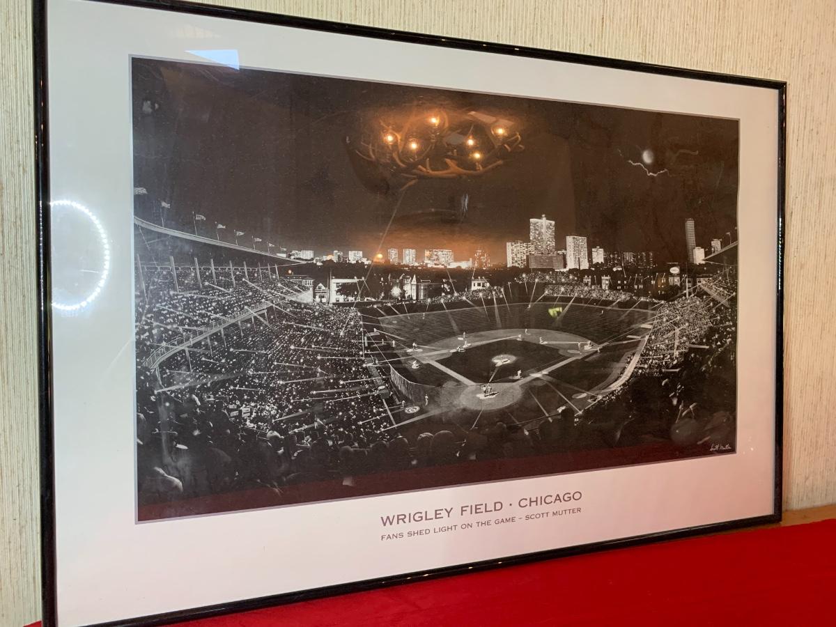 Artwork including one framed picture of Wrigley field, one framed picture of 3 baseball cards with some glass damage to lower right side, cubs tumblers, cubs hats, numerous cubs team logo baseballs and one cubs pennant flag from division series 2003