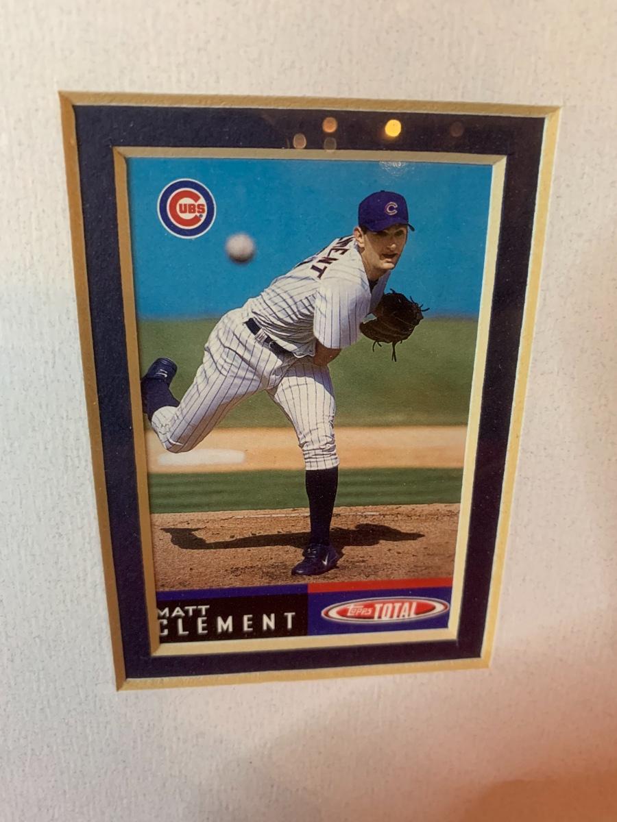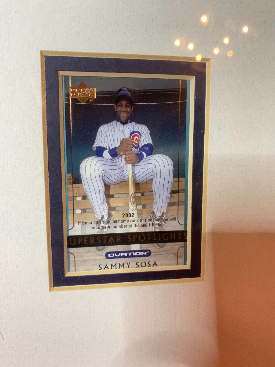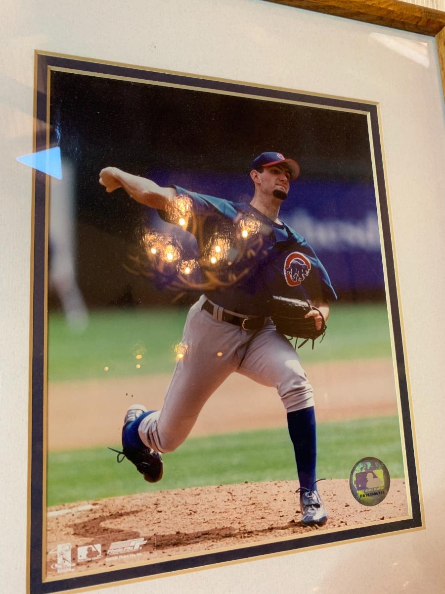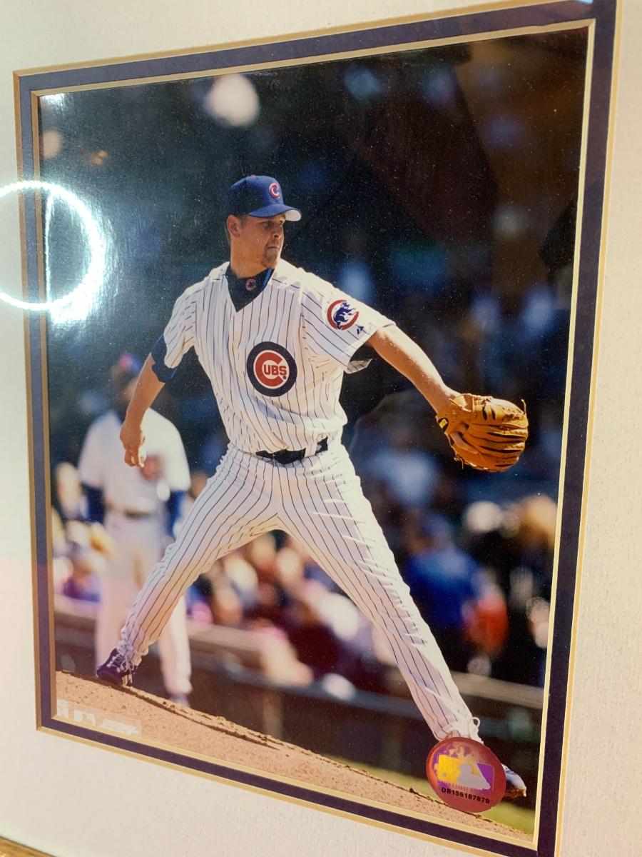 Artwork including one framed picture of Wrigley field, one framed picture of 3 baseball cards with some glass damage to lower right side, cubs tumblers, cubs hats, numerous cubs team logo baseballs and one cubs pennant flag from division series 2003