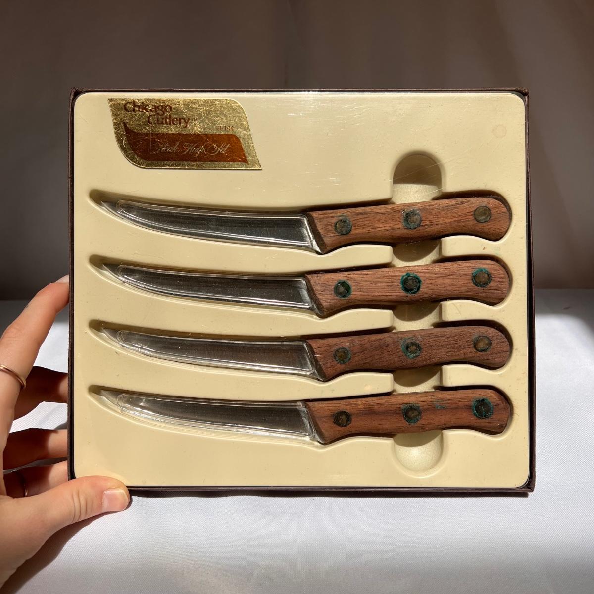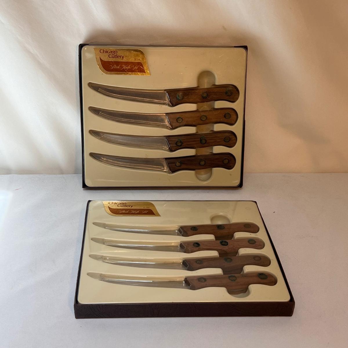 This lot includes two sets of four Chicago Cutlery steak knives. The knives individually measure 8” x .5”H. All appear to be in their original packaging and never used. Shipping available.