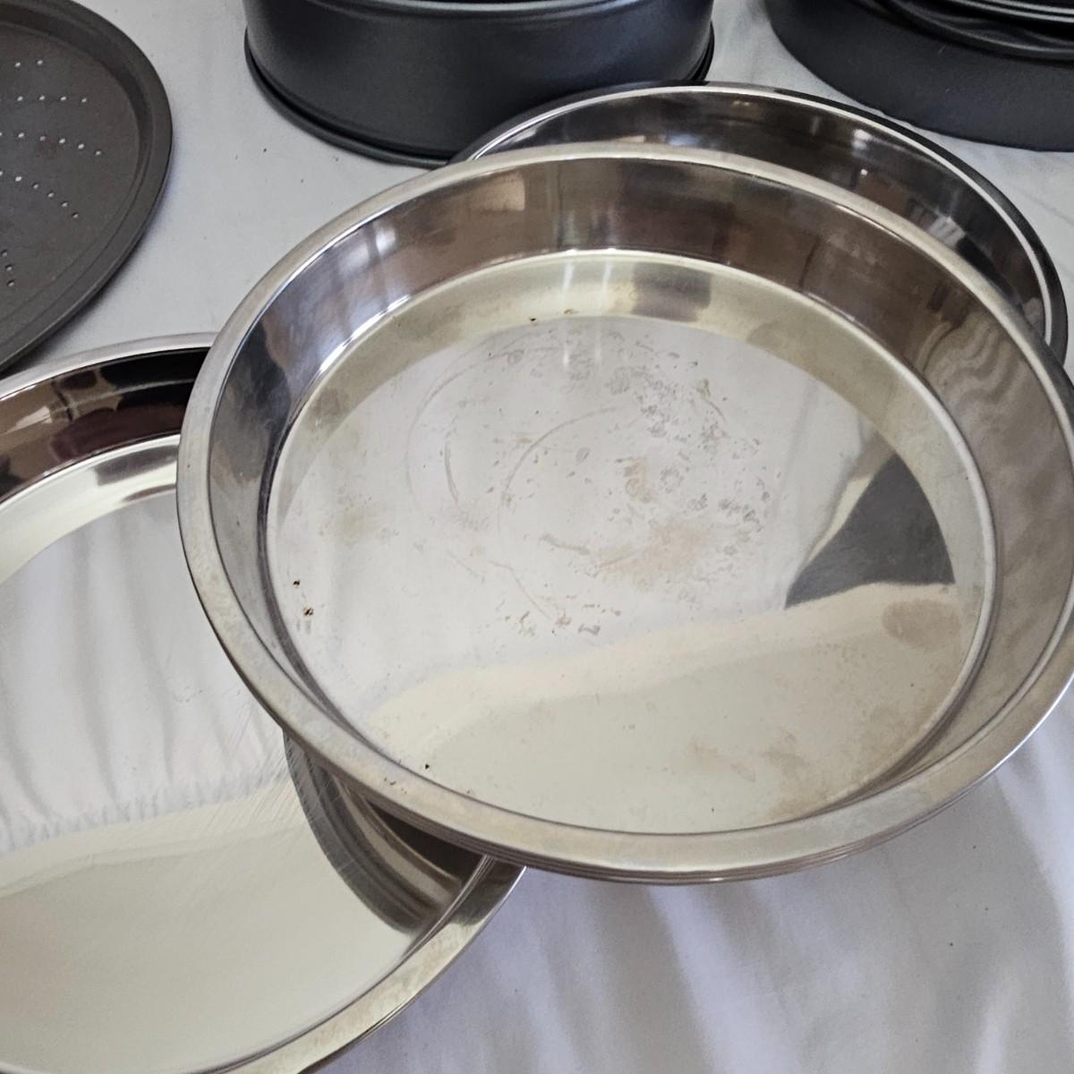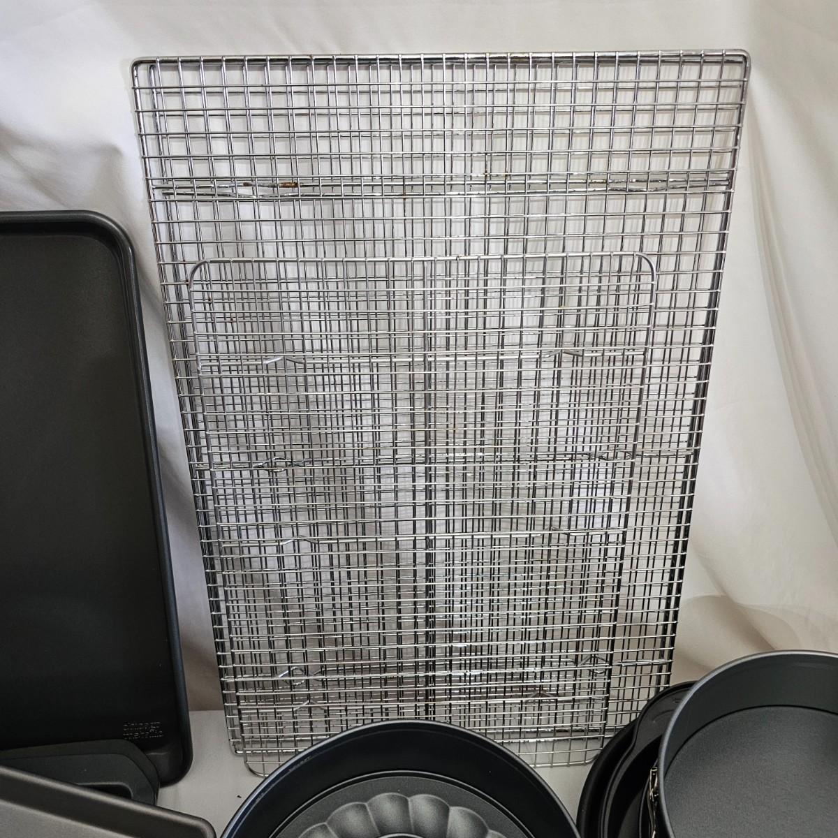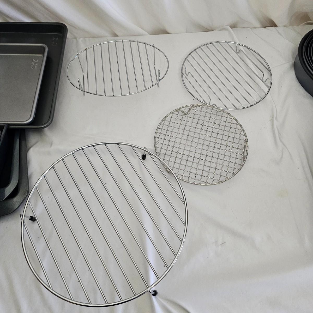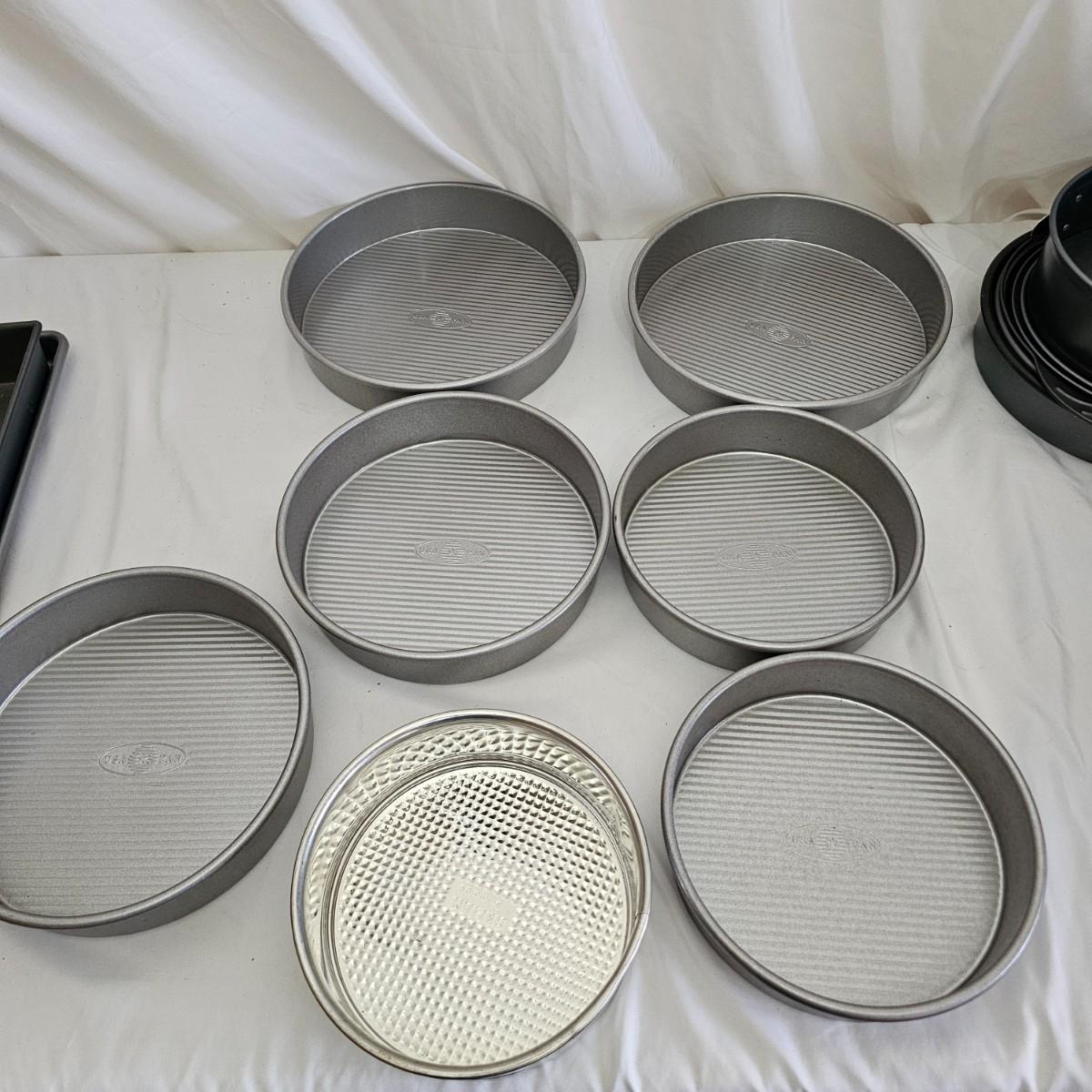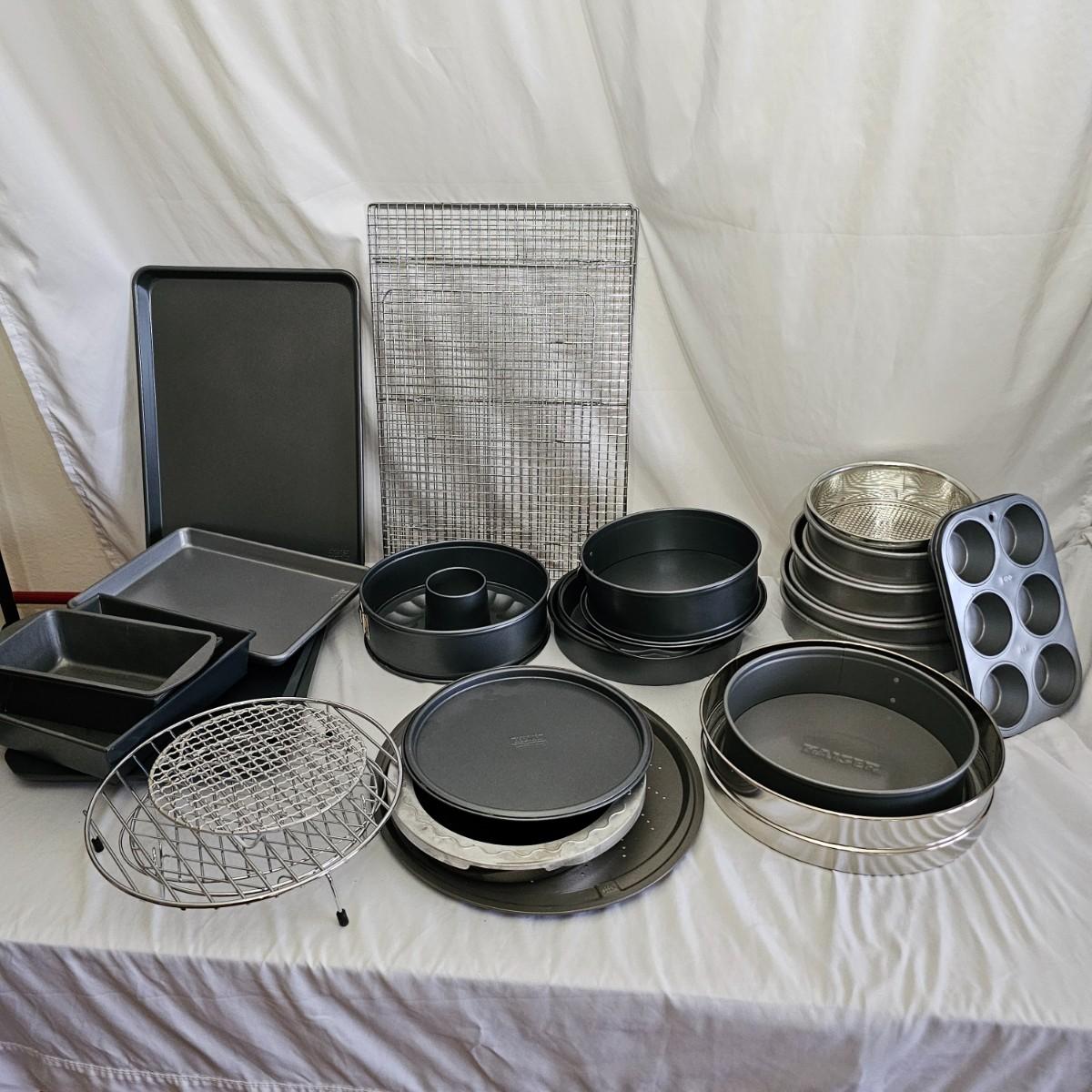 Multiple pieces of metal bakeware, pans, trays, muffin tins and more. Items by brand name producers in a variety of sizes. Large cooling racks, 14.5" x 21". Muffin tins 7" x 10" x 2"H. Round pans 9", 9.5", 10"D and more. Too many to list, see photos for details. Shipping available.