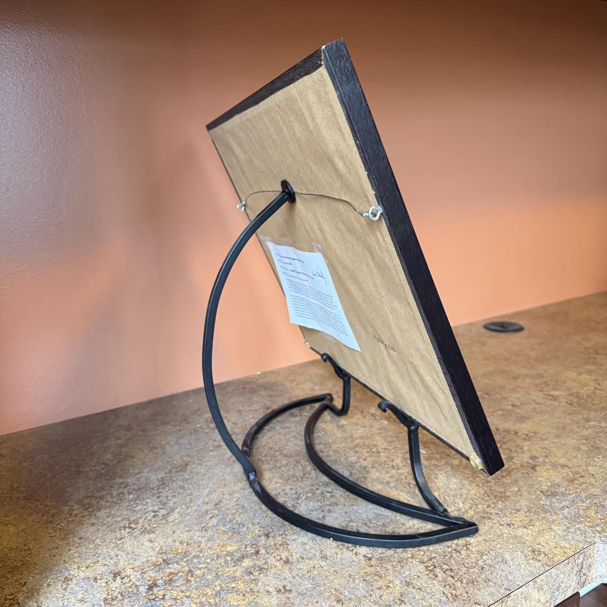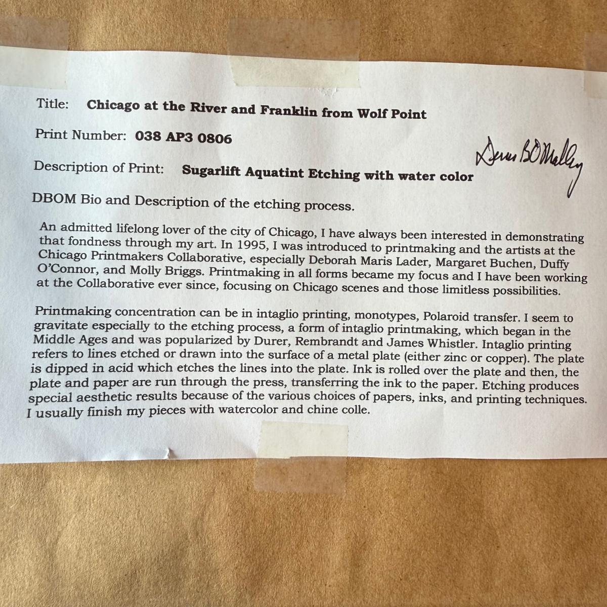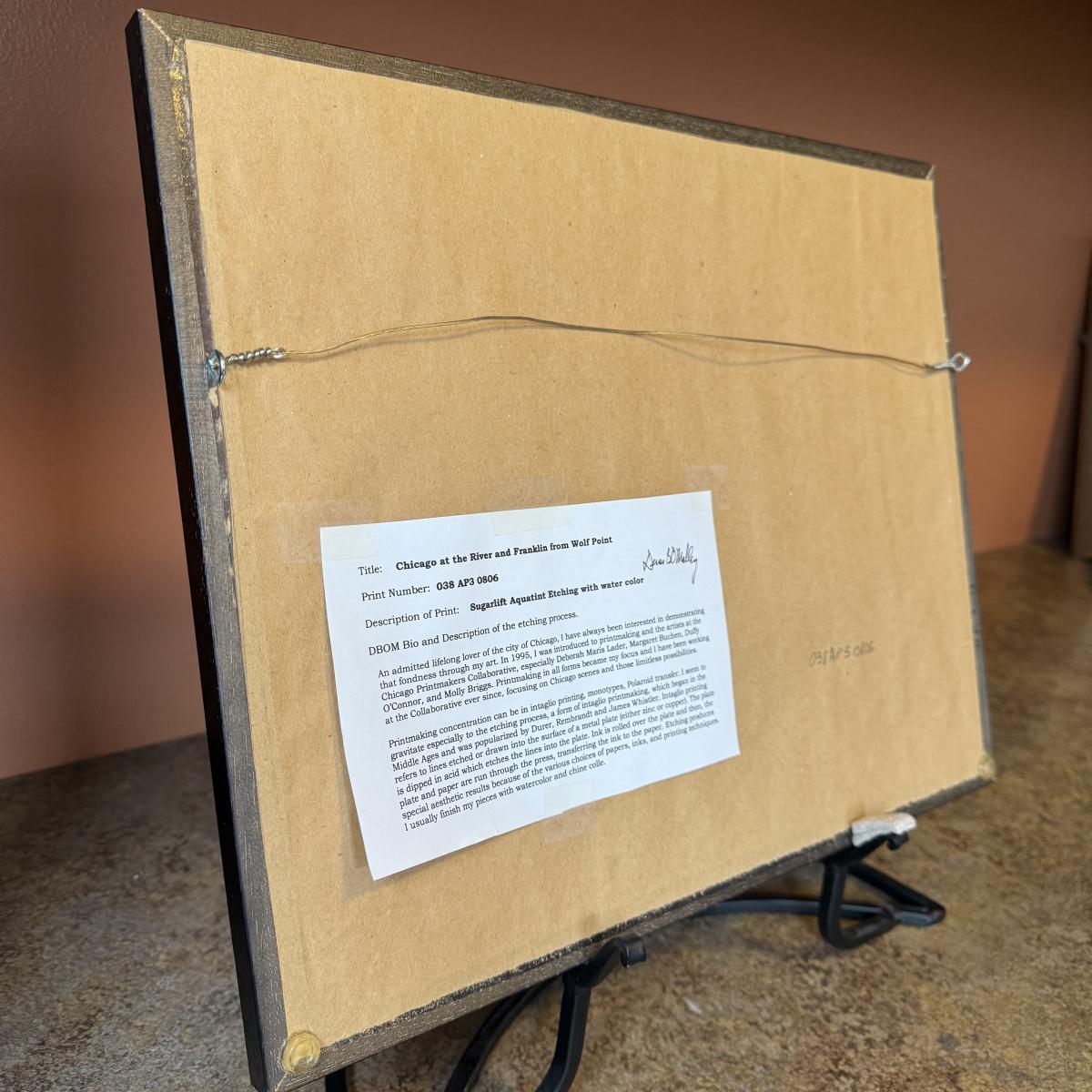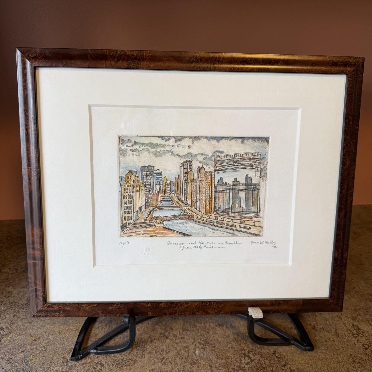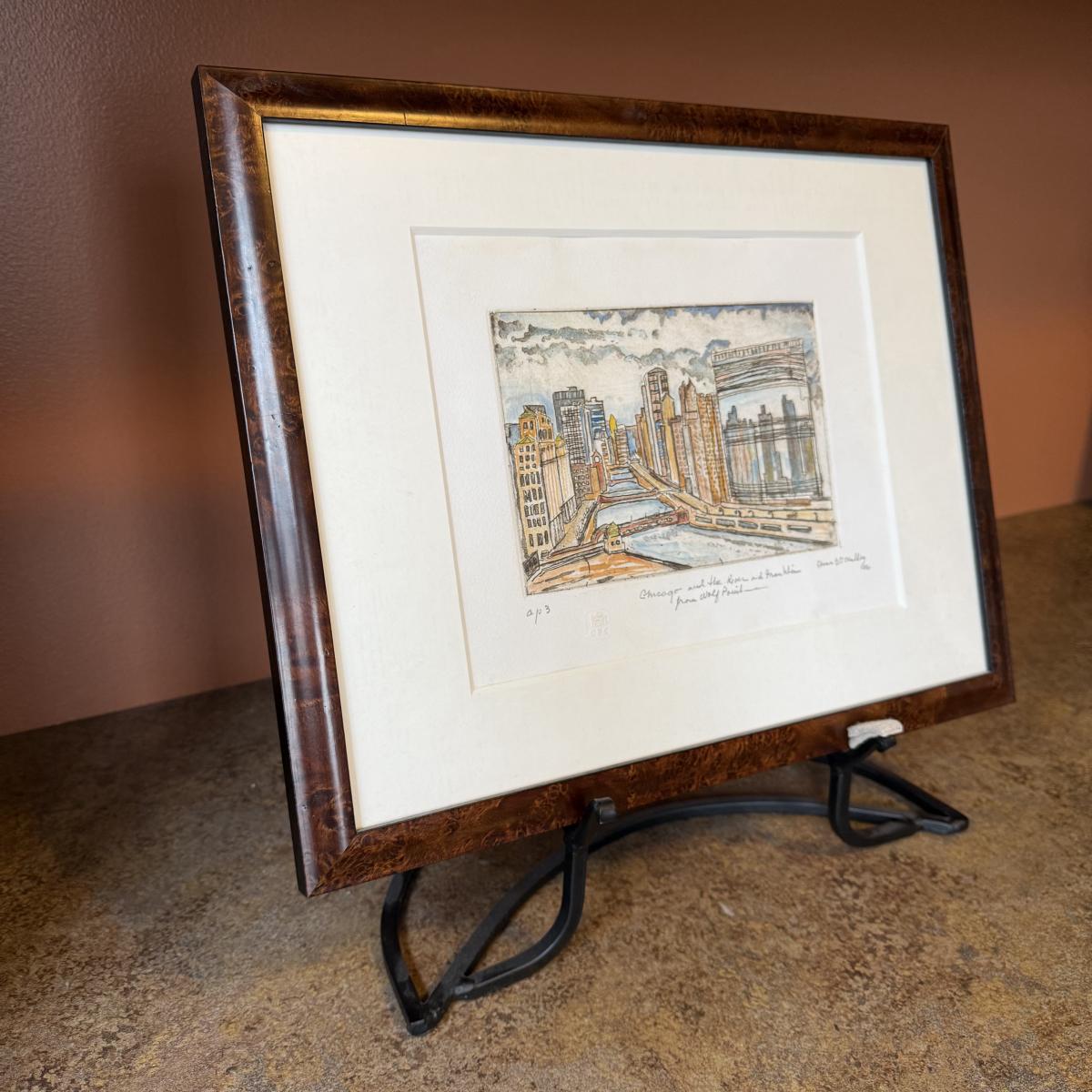 This lot contains a lovely etching with watercolor piece of Chicago’s Skyline. Titled "Chicago at the River and Franklin from Wolf Point" and signed and dated by Chicago, Illinois artist Dennis O’Malley. This piece measures 15.5" x 12.5"H. The frame appears to be wood and piece is under glass. Artist info on the back. This piece comes with a metal display stand as well as hardware on the back to be hung. Shipping available.
