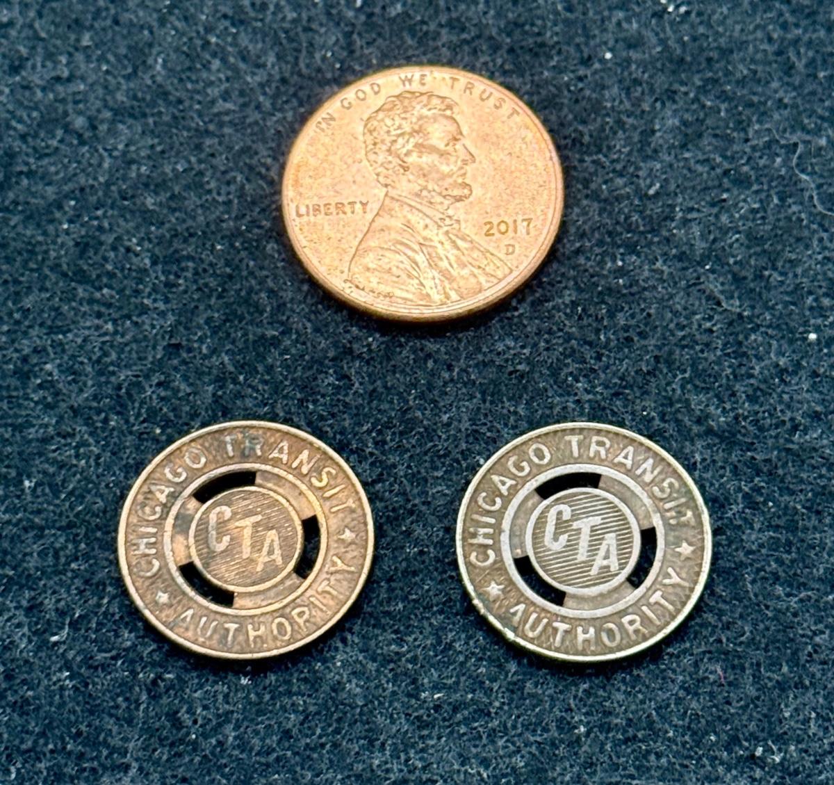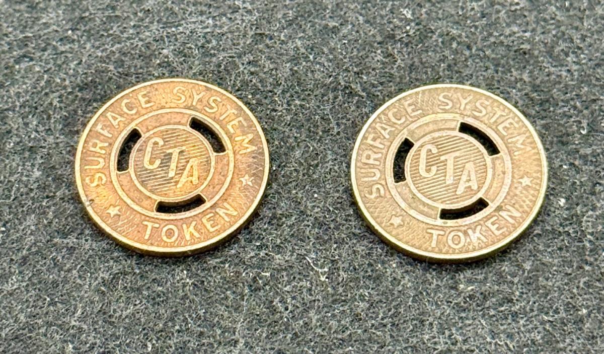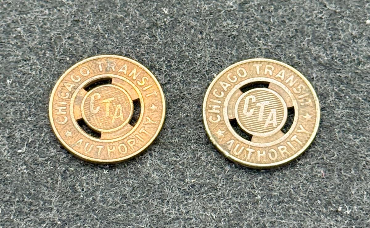Pair of CTA transit tokens. Slightly smaller than a US dime. Rare, in very good condition. The CTA began operation in 1947, consolidating original operation of the Chicago Surface Lines from 1914. These tokens are likely from the mid 1940's or 1950's.