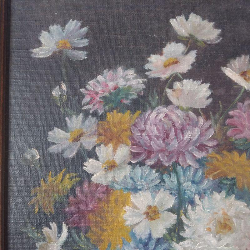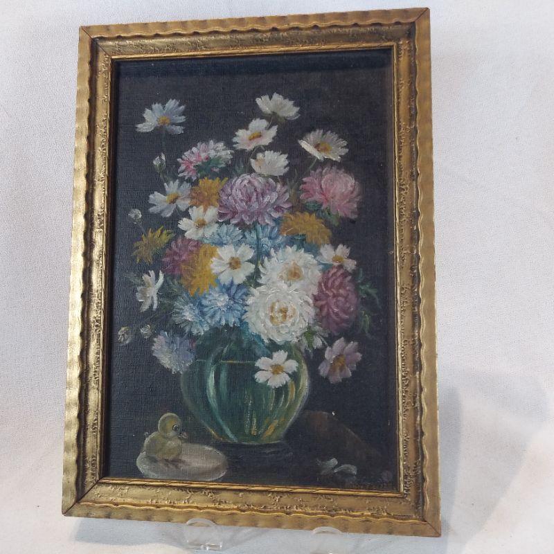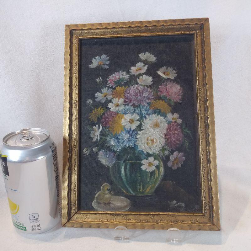 This is a small vintage oil painting on canvas board, framed. Very nicely executed, the baby chick is just adorable and so unexpected. No artist signature that we could find. Framed size is 10 1/4-inches tall X 7 1/2-inches wide. In very good shape.
