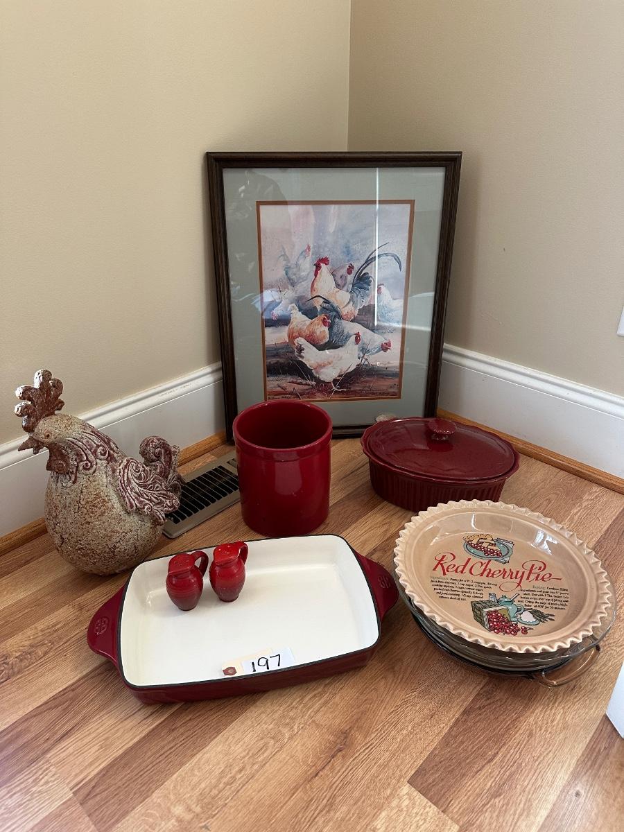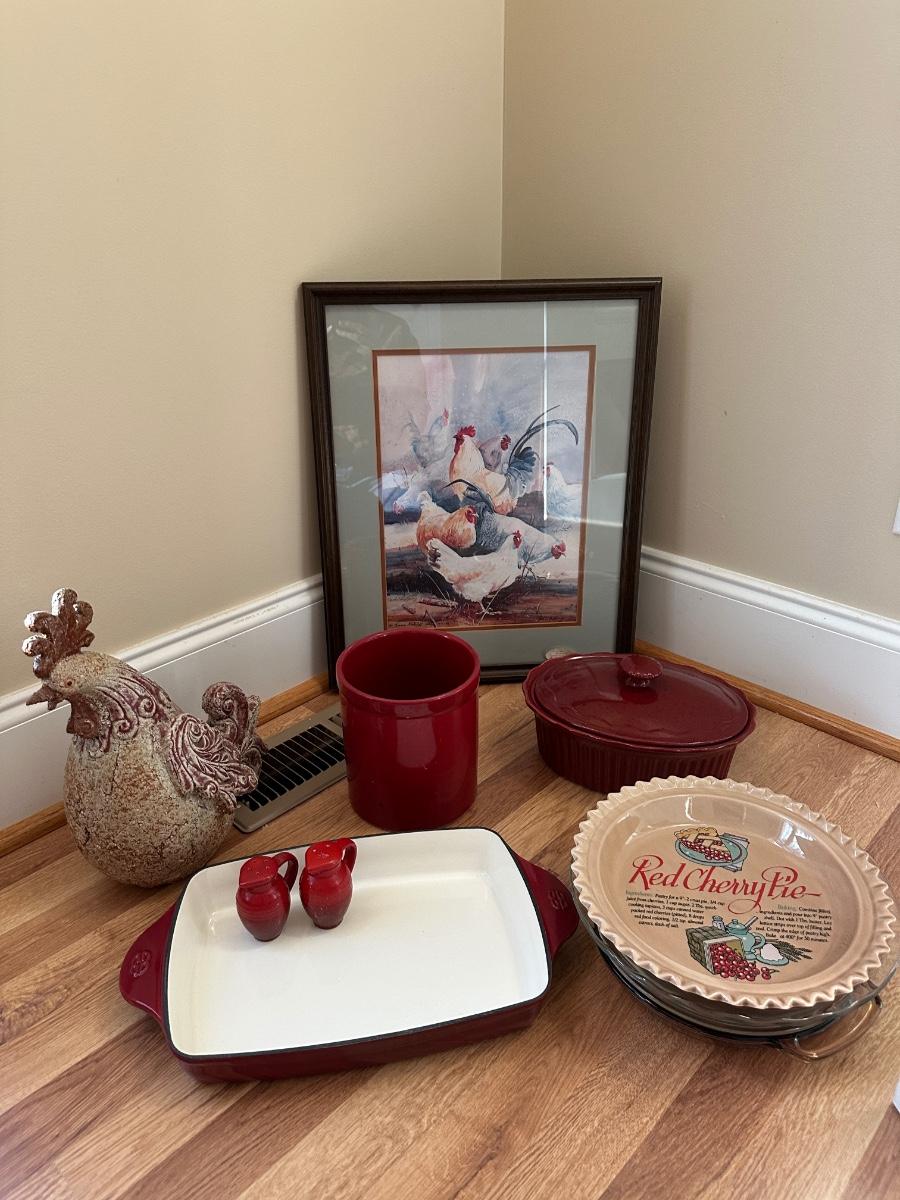 MISC CHICKEN HOME DÉCOR, ART, AND BAKING DISHES AS PICTURED