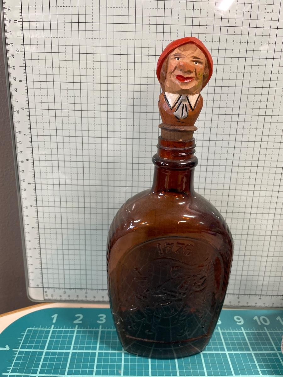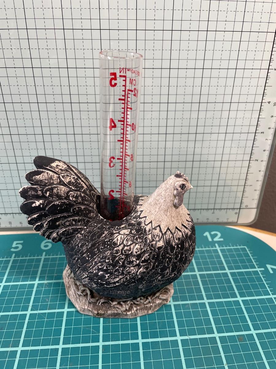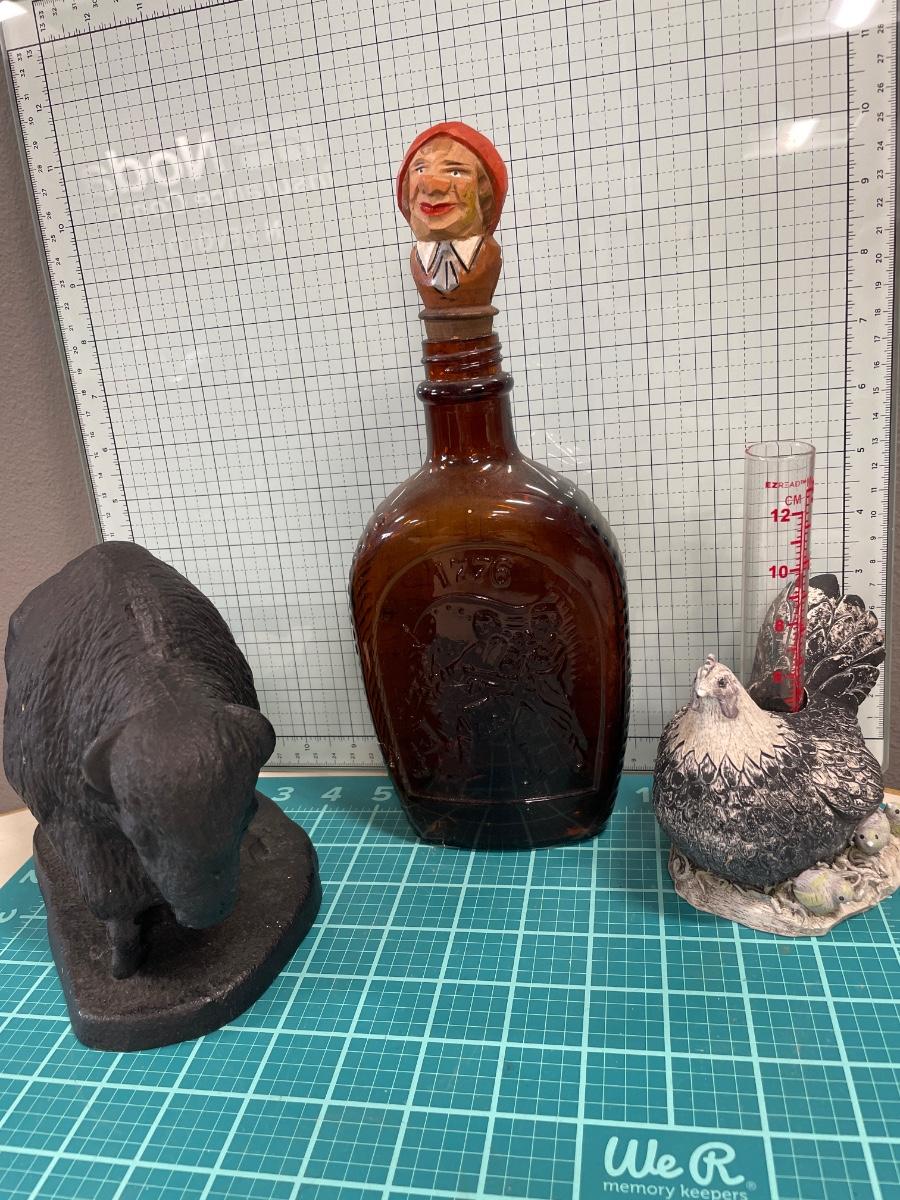 Chicken rain gauge, Buffalo and bottle with wood cork