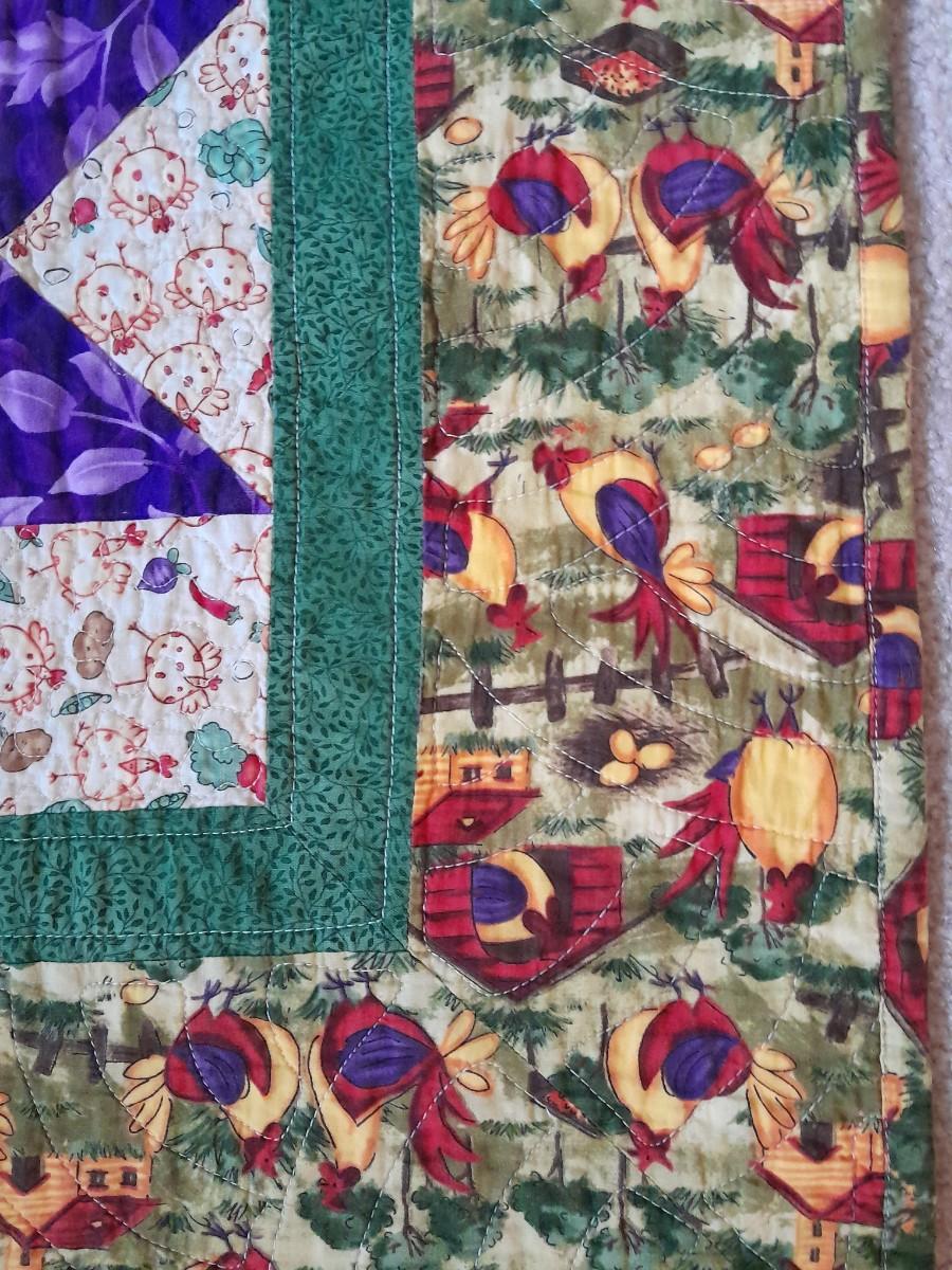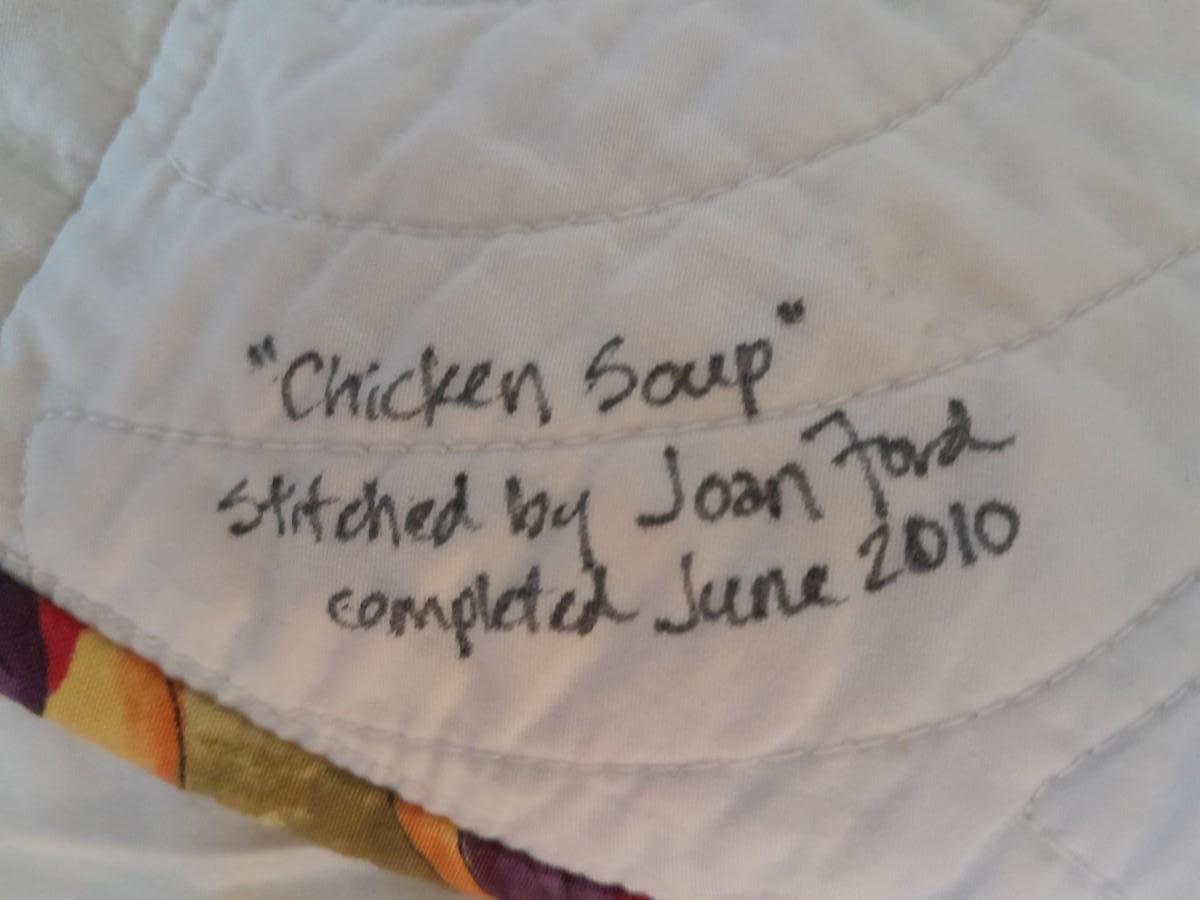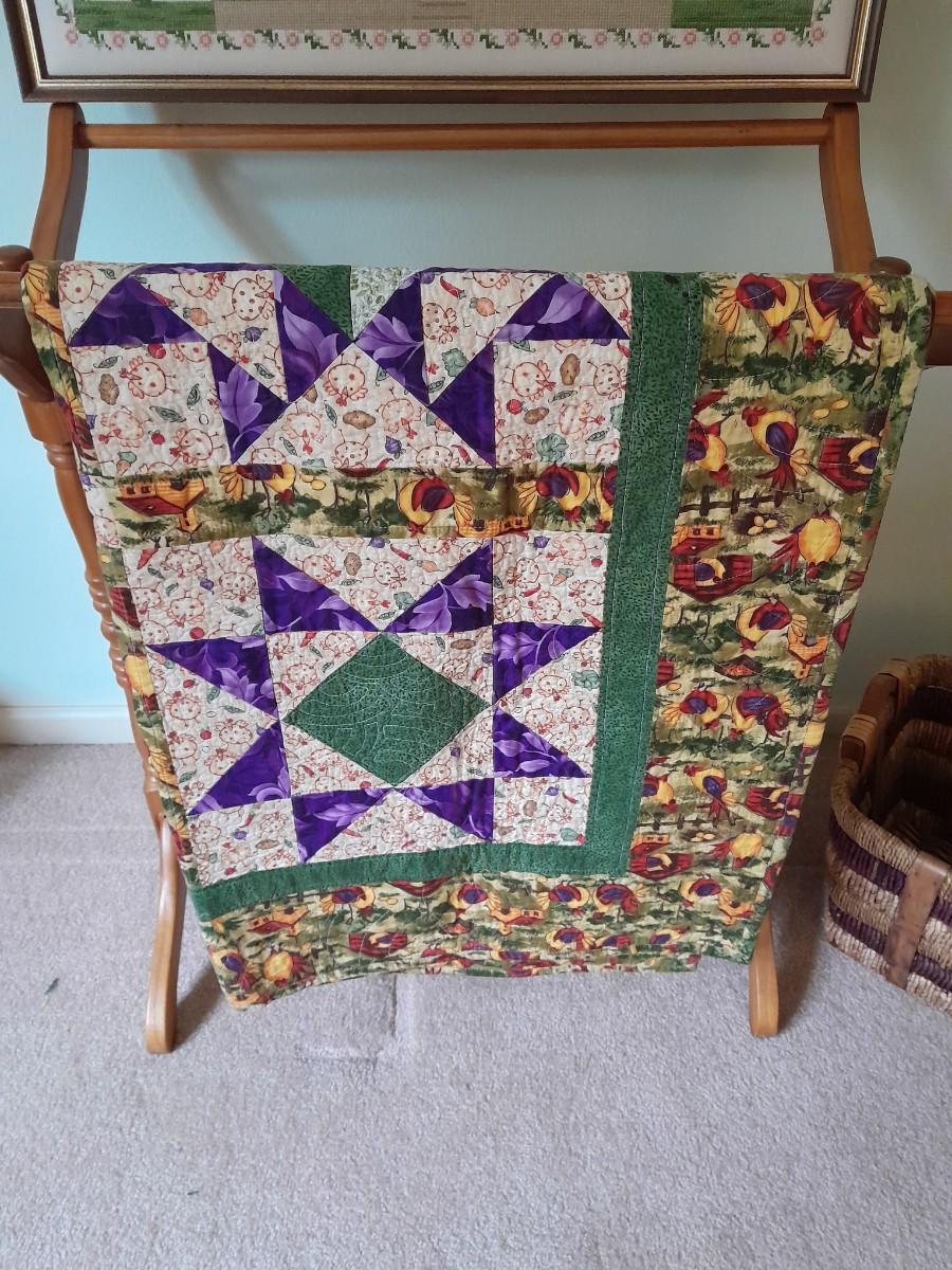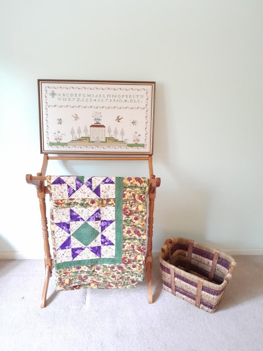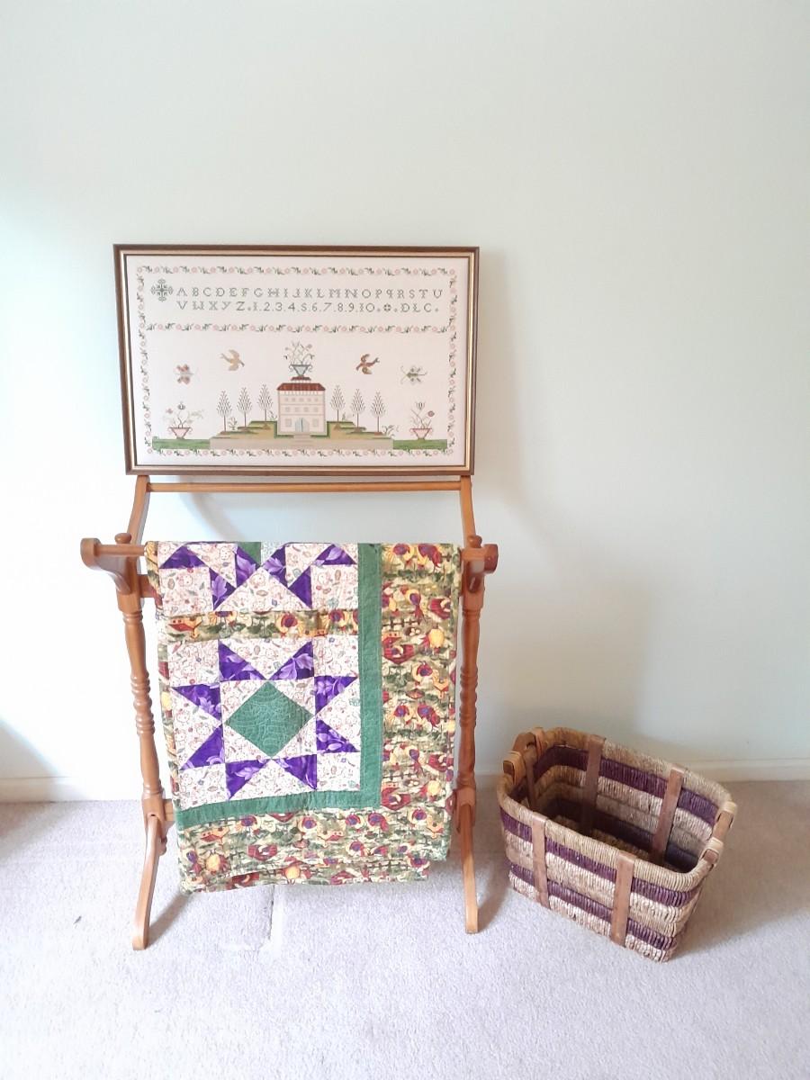 ADORABLE "CHICKEN SOUP" SMALL QUILT STITCHED BY JOAN FORD 49" X 36", QUILT RACK 30.5" X 24.5" X 15", CROSS STITCH ARTWORK 25.5" X 15" AND A 9" X 17" BASKET