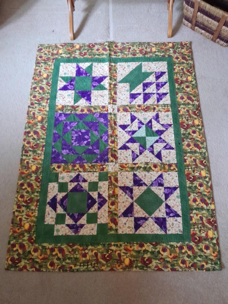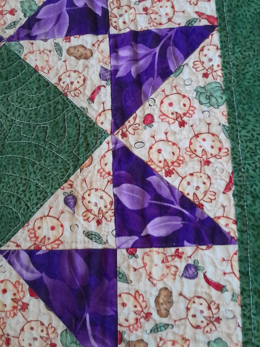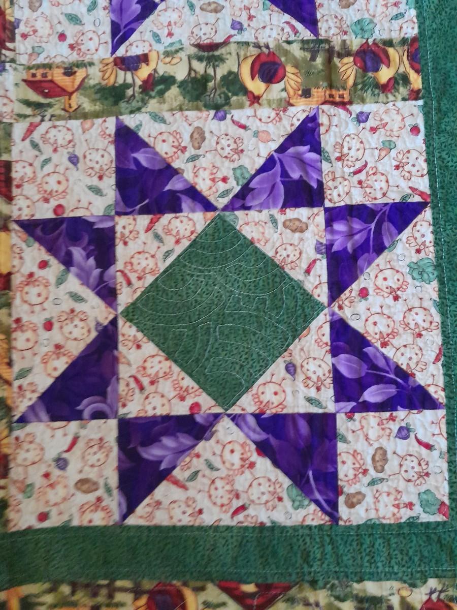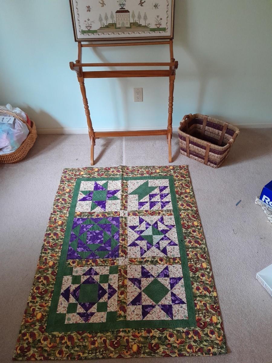 ADORABLE "CHICKEN SOUP" SMALL QUILT STITCHED BY JOAN FORD 49" X 36", QUILT RACK 30.5" X 24.5" X 15", CROSS STITCH ARTWORK 25.5" X 15" AND A 9" X 17" BASKET