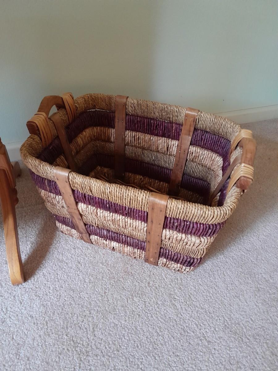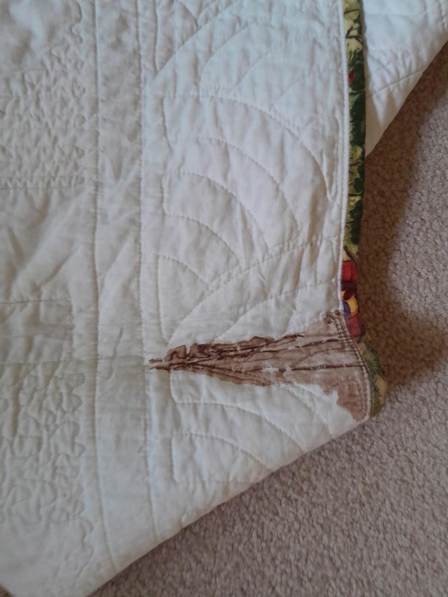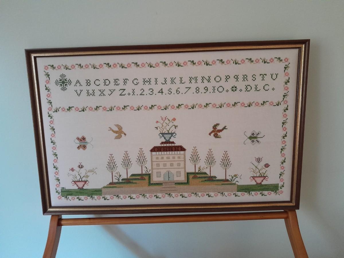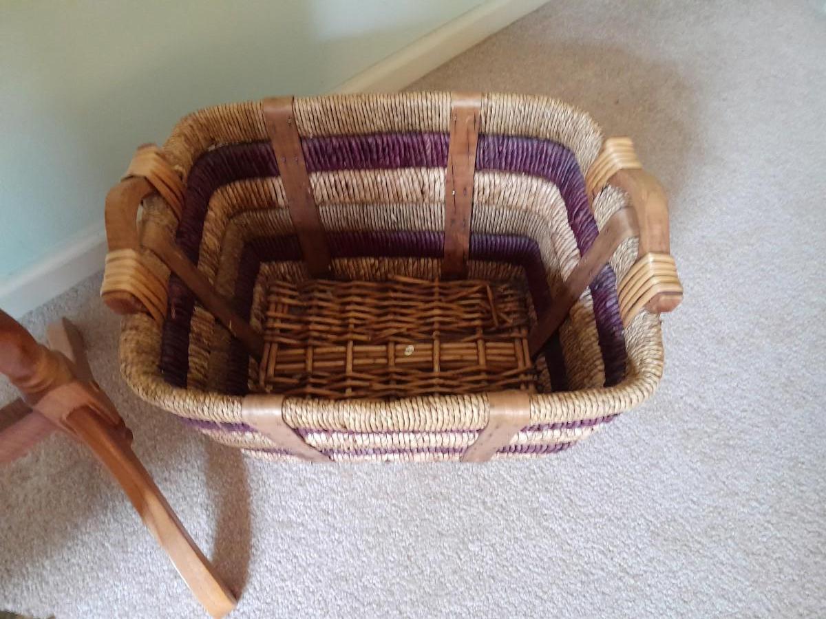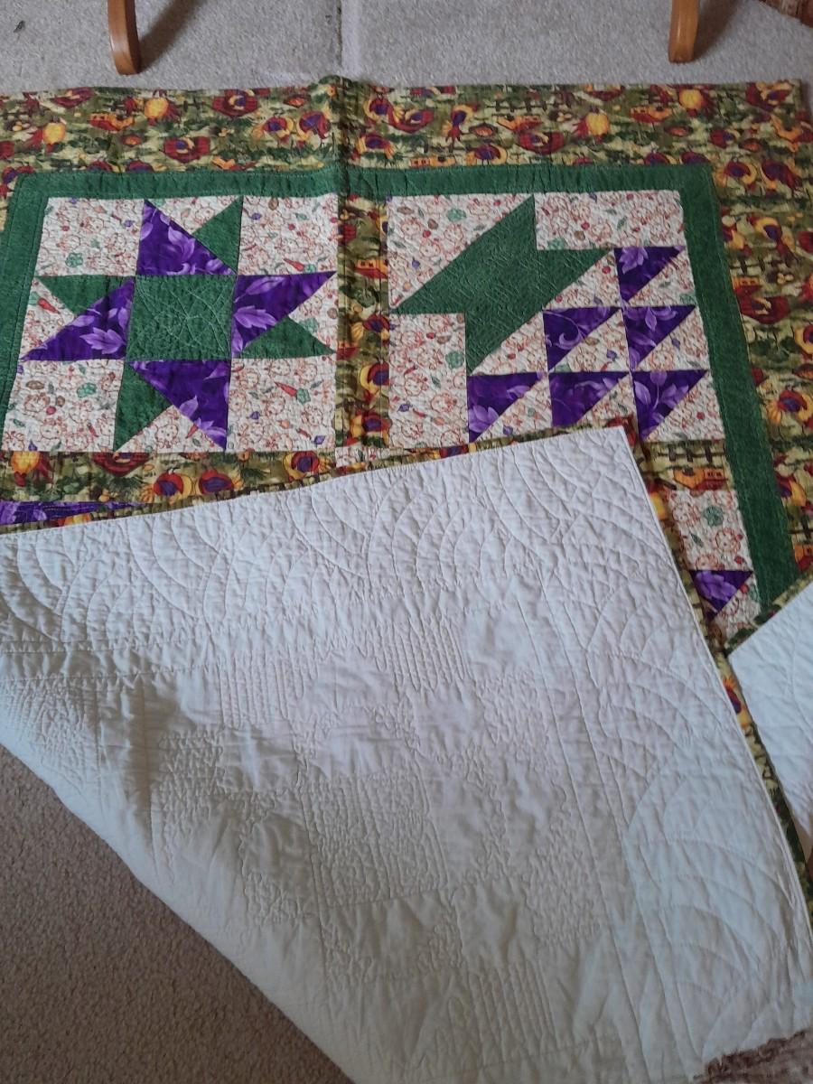 ADORABLE "CHICKEN SOUP" SMALL QUILT STITCHED BY JOAN FORD 49" X 36", QUILT RACK 30.5" X 24.5" X 15", CROSS STITCH ARTWORK 25.5" X 15" AND A 9" X 17" BASKET