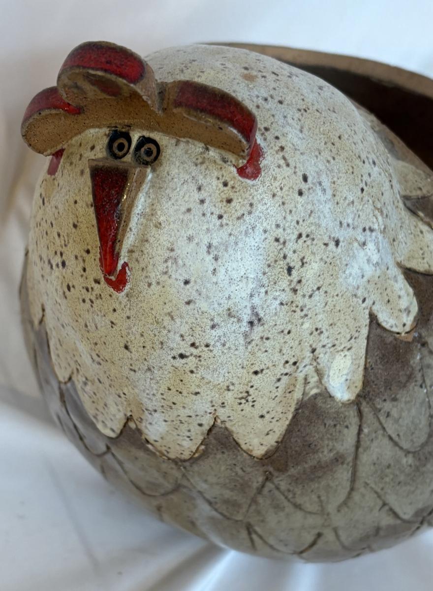 Cotton tea towel is 19.5” x 33”, spatula has wood handle, silicone scraper and is painted on both sides. Hand-made art pottery chicken is 9”D x 10”H. No signature can be found on bottom. Shipping available. Shipping can be costly. We suggest contacting our preferred local shipping provider, Postage Express, with dimensions and getting an estimate before bidding: (828) 255-9250 or shipping@postageexpressnc.com.