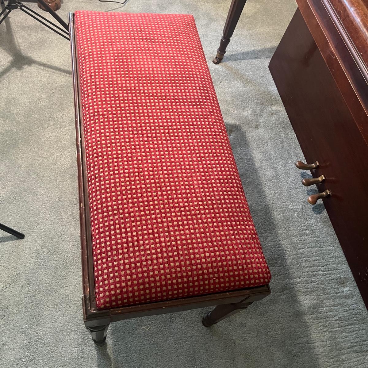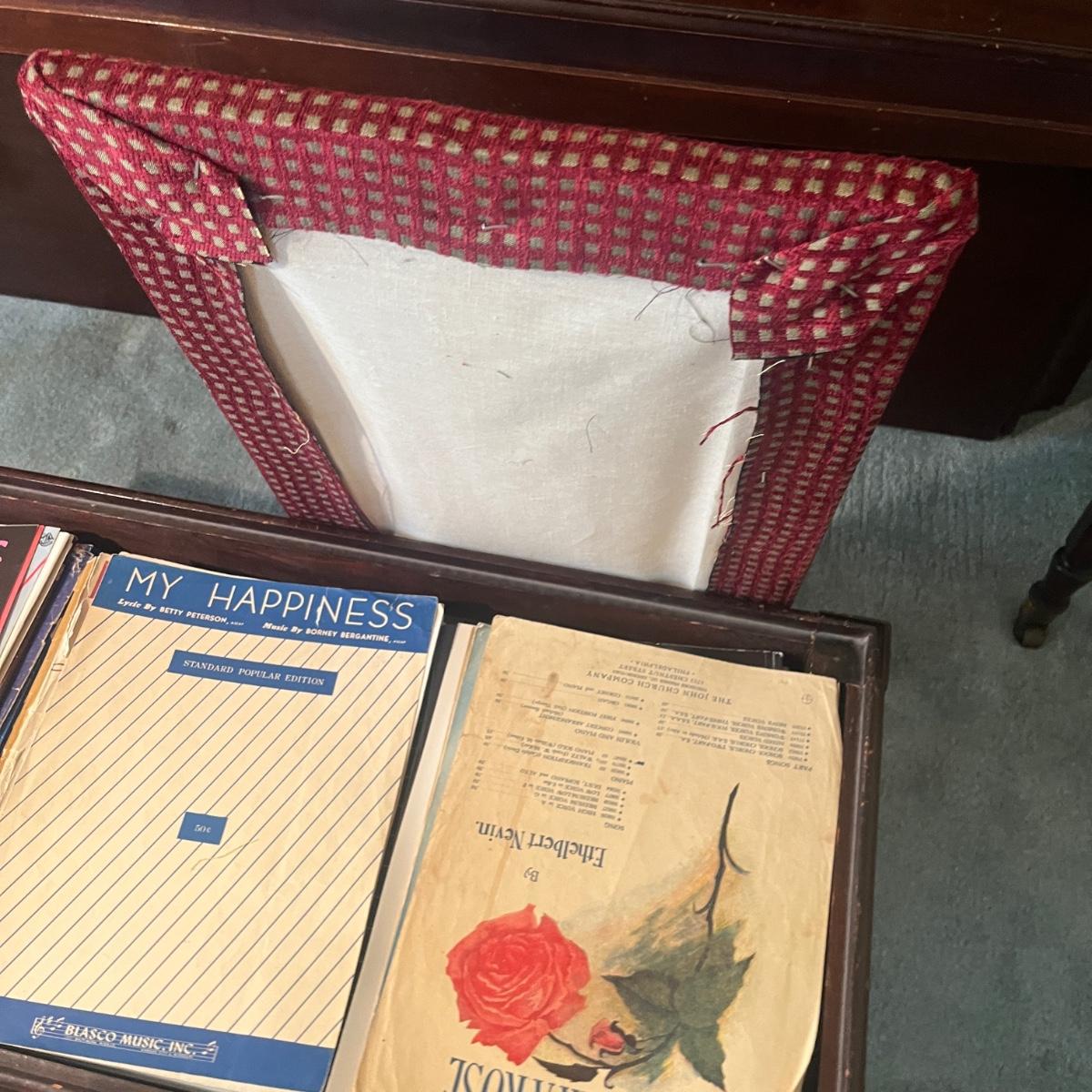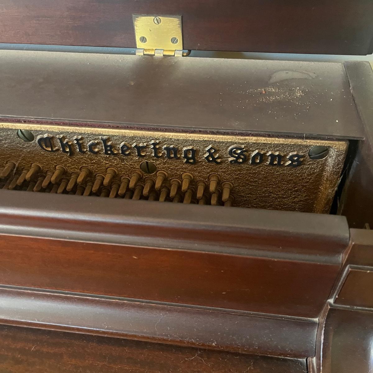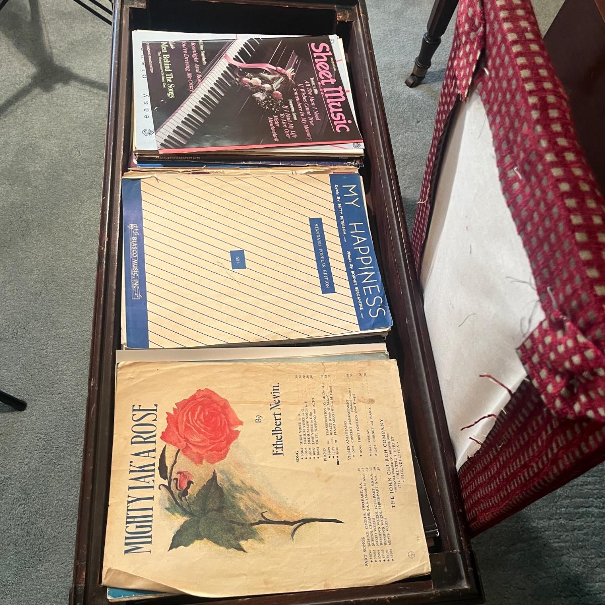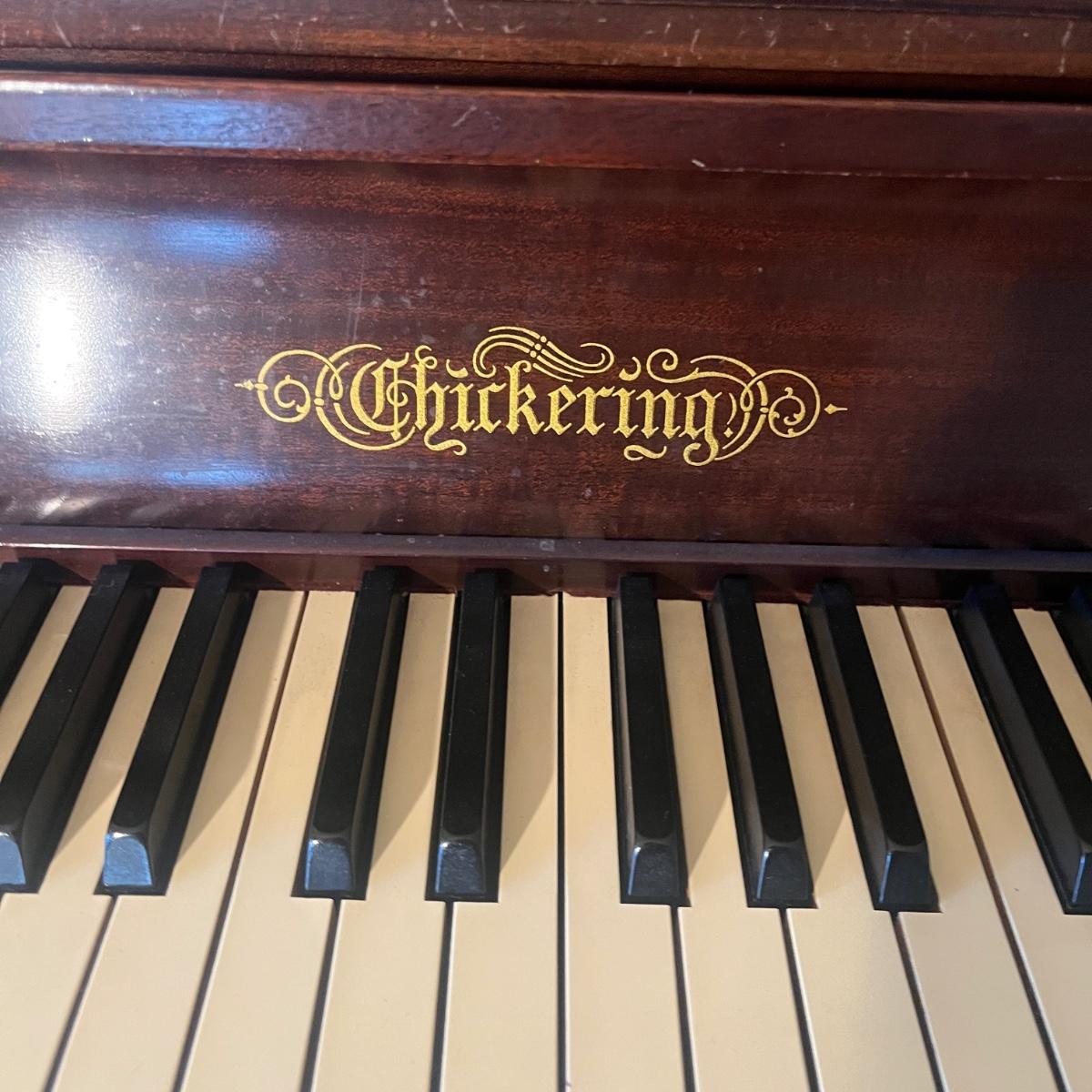 Lot includes a Chickering upright piano with a matching bench that has padded and upholstered seat. Piano measures 59.5” x 23” x 39”H. Bench contents are included.