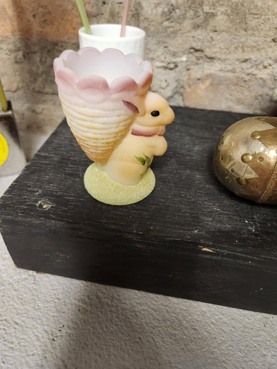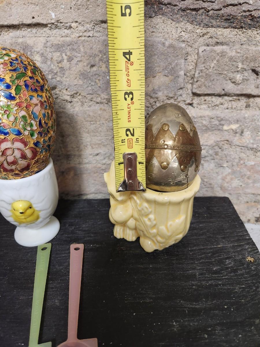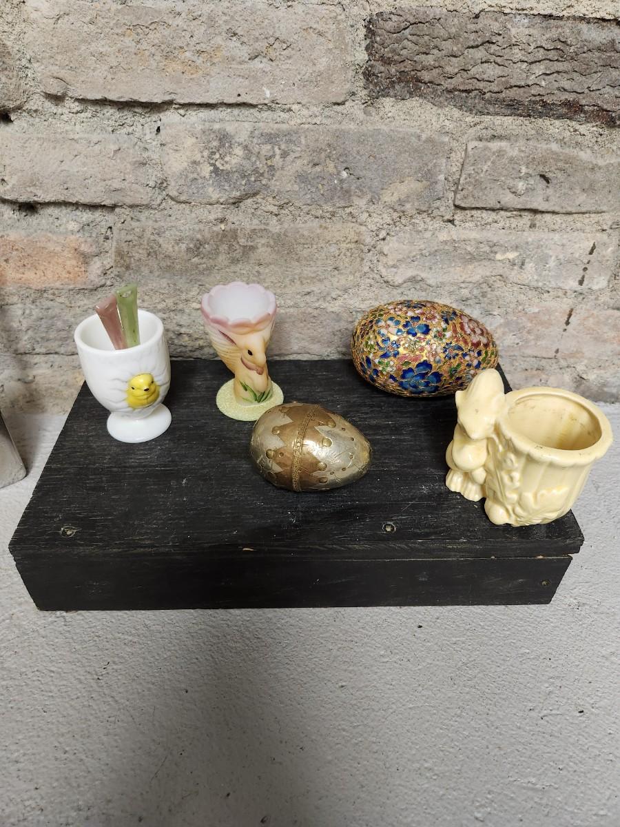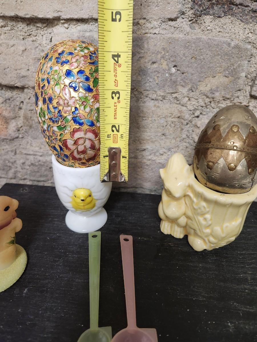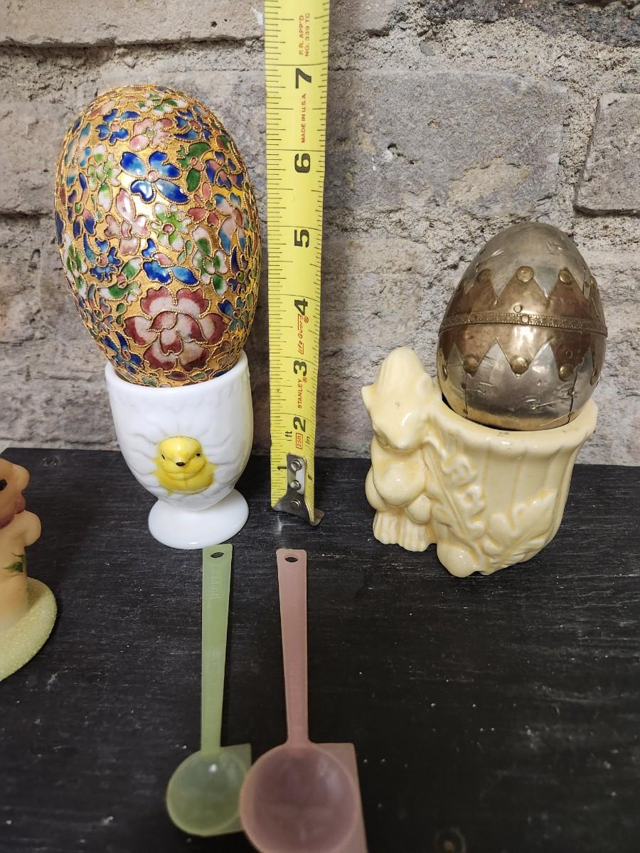 Fenton bunny egg holder, Westmoreland egg cup (quite old) a really cool cloisenne type egg, a steam punk egg and a super cute squirrel planter