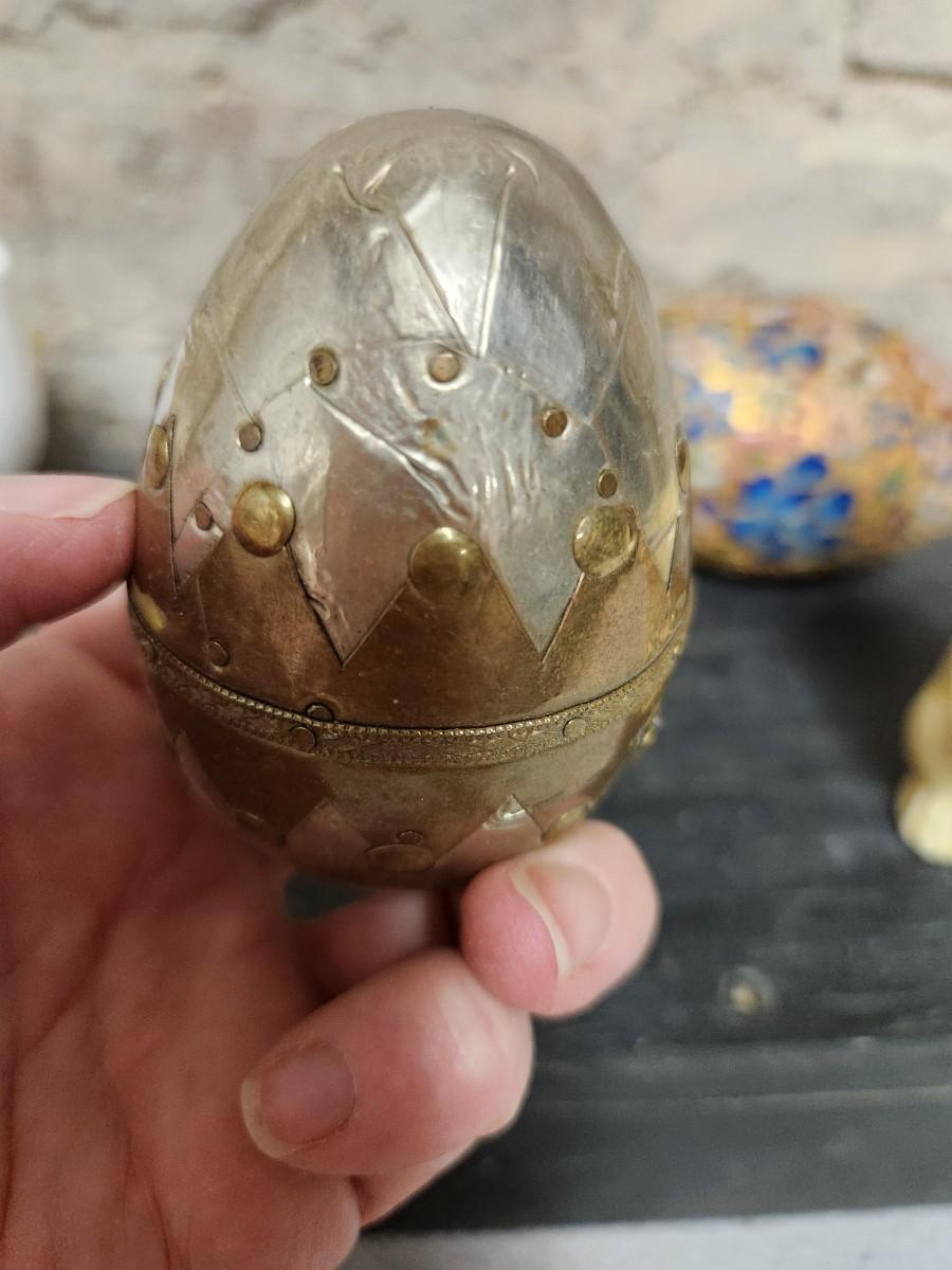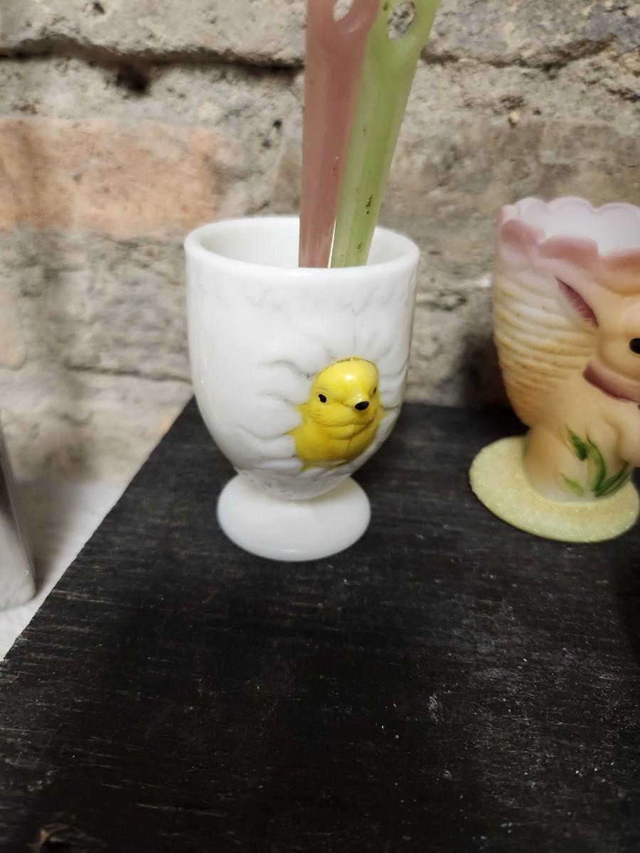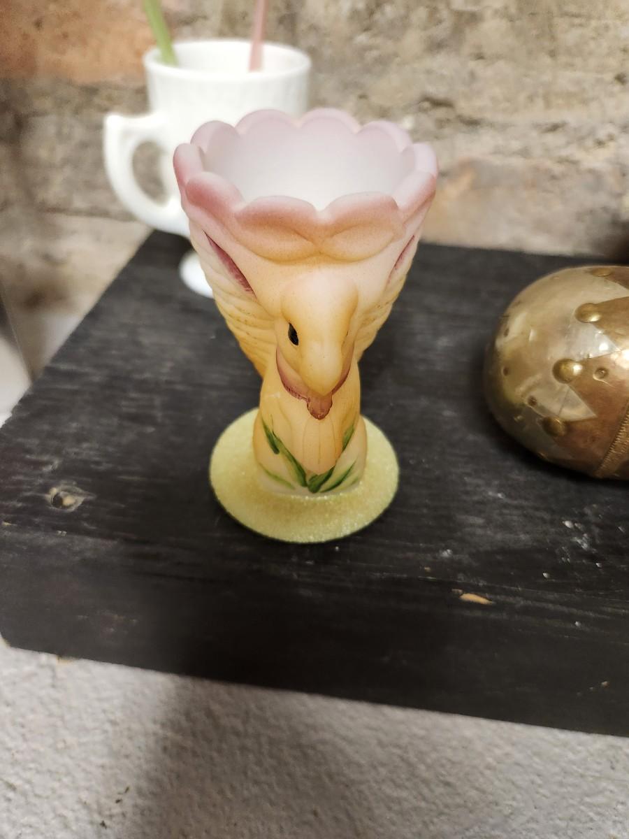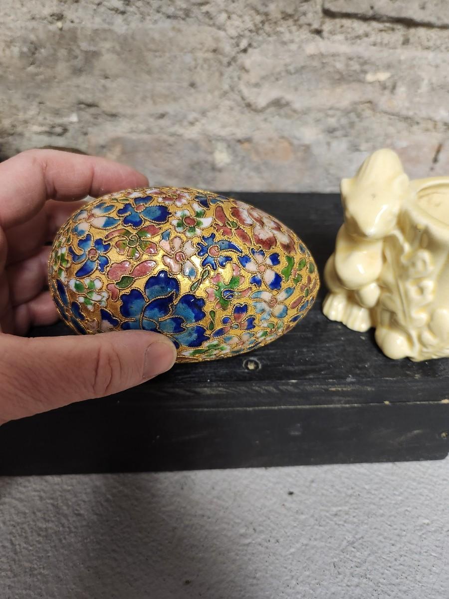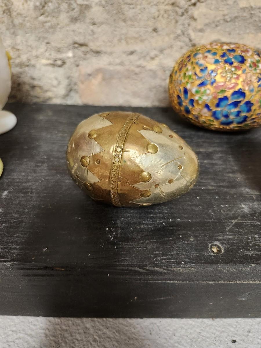 Fenton bunny egg holder, Westmoreland egg cup (quite old) a really cool cloisenne type egg, a steam punk egg and a super cute squirrel planter