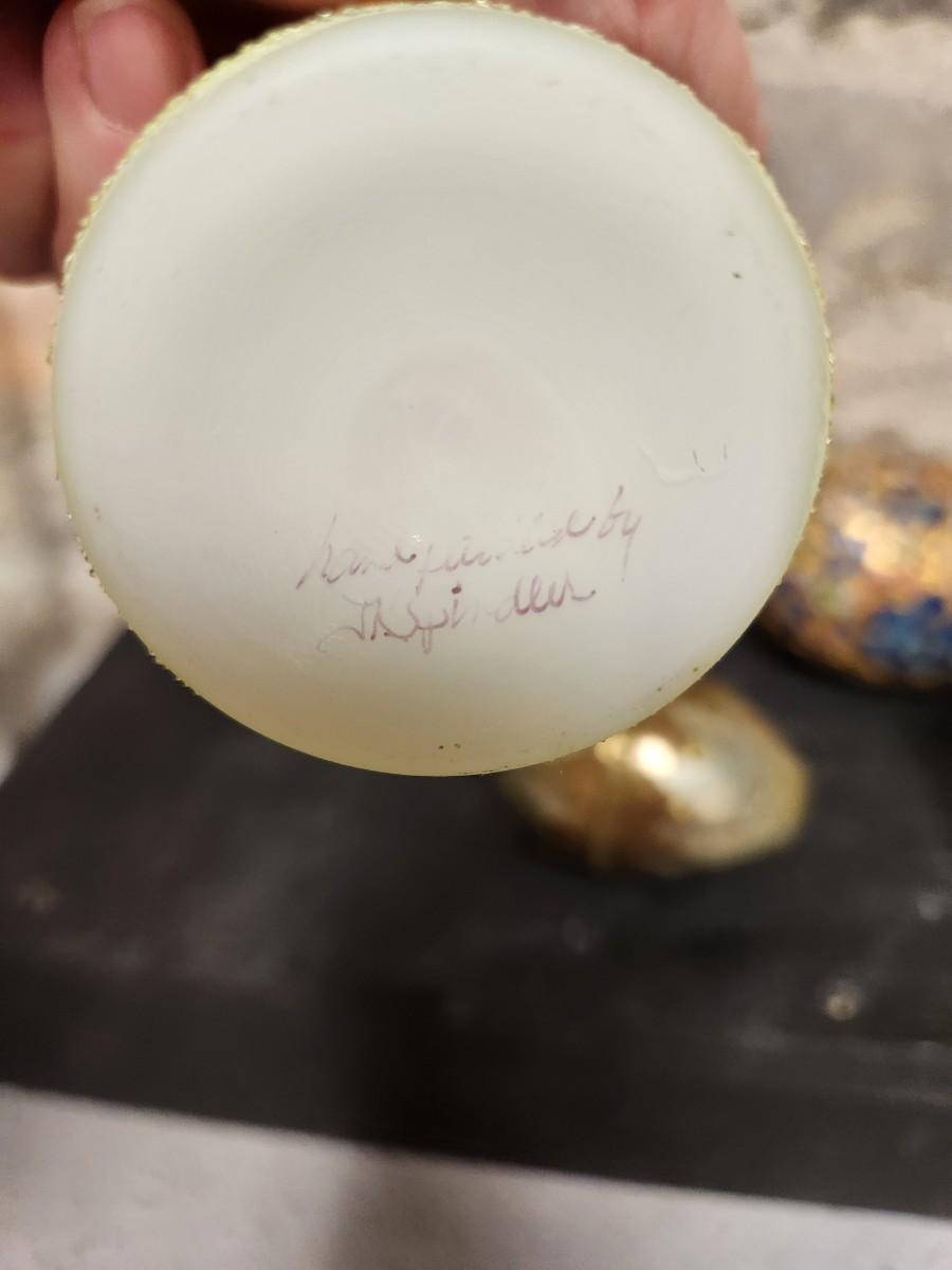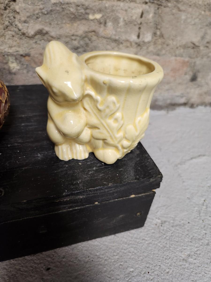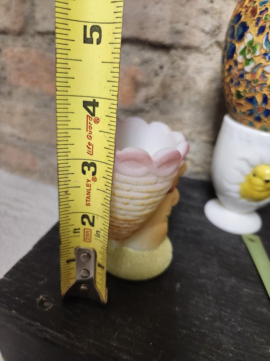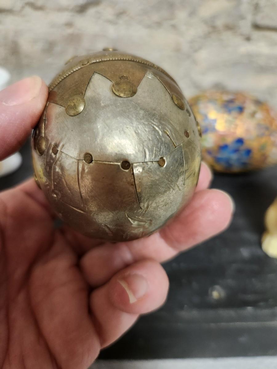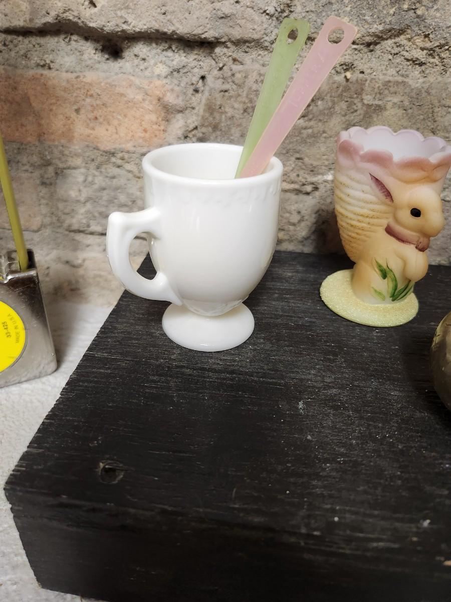 Fenton bunny egg holder, Westmoreland egg cup (quite old) a really cool cloisenne type egg, a steam punk egg and a super cute squirrel planter