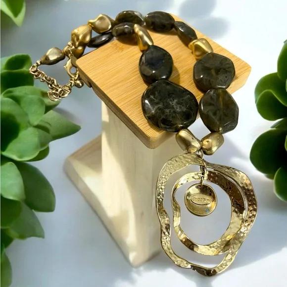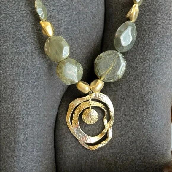 Chico's green and gold beaded necklace with a 3 layer goldtone pendant. In good condition, only one gold bead is scratched at the top of the necklace, see pictures. The necklace length is 8-in with an additional 2-in extender, the pendant is 2.5-in