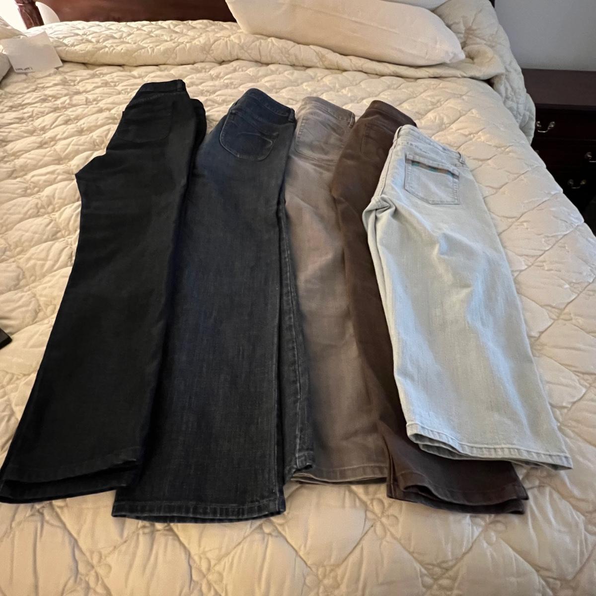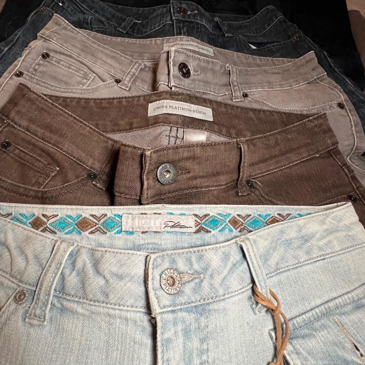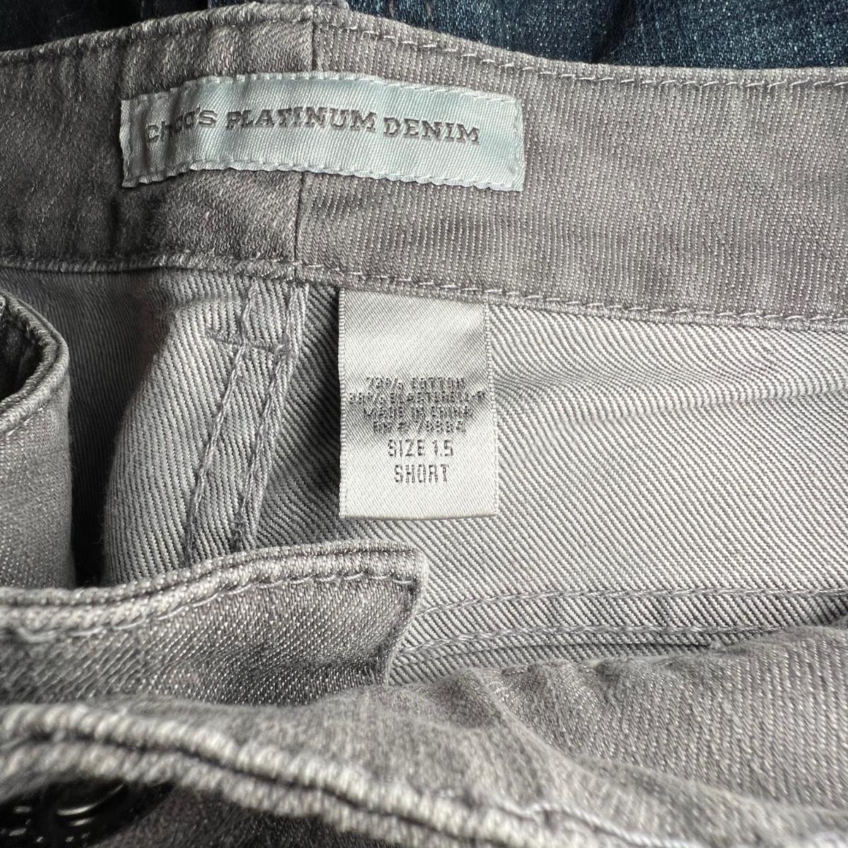 Five pairs of Chico’s denim pants that are either size 1 or 1.5 short. The light denim pair are capris, note there is a small red ink mark on back of pant leg.