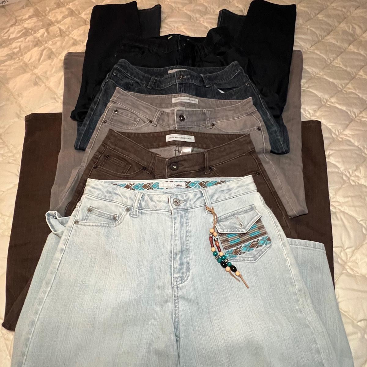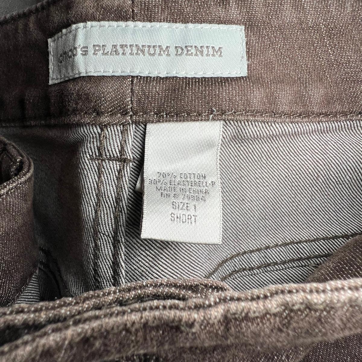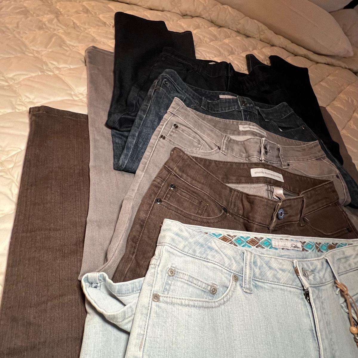 Five pairs of Chico’s denim pants that are either size 1 or 1.5 short. The light denim pair are capris, note there is a small red ink mark on back of pant leg.