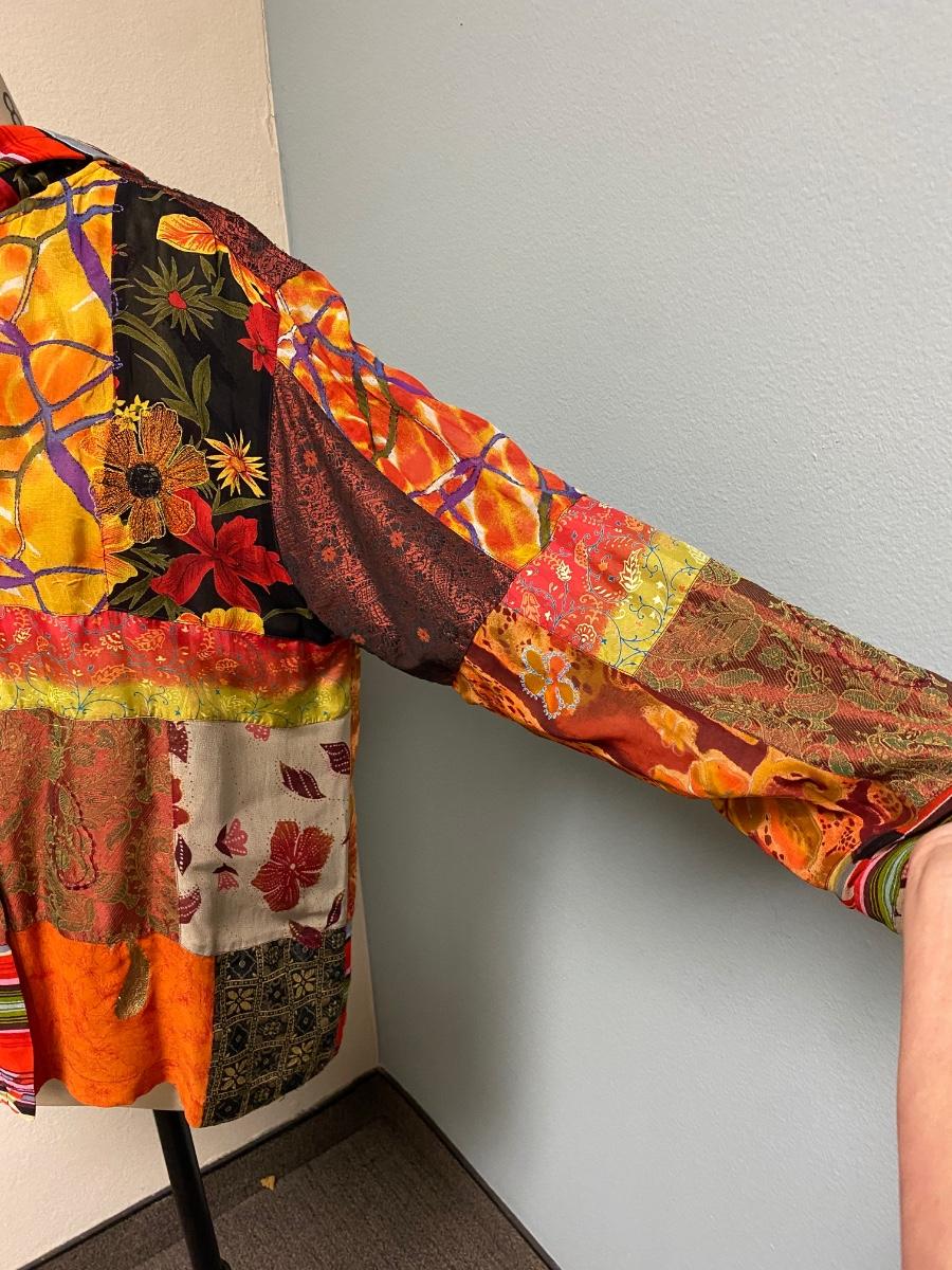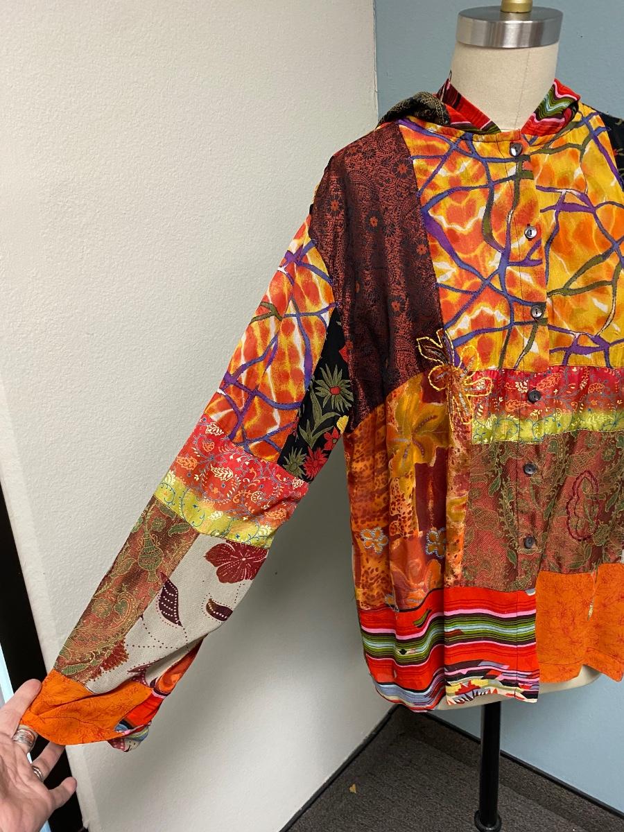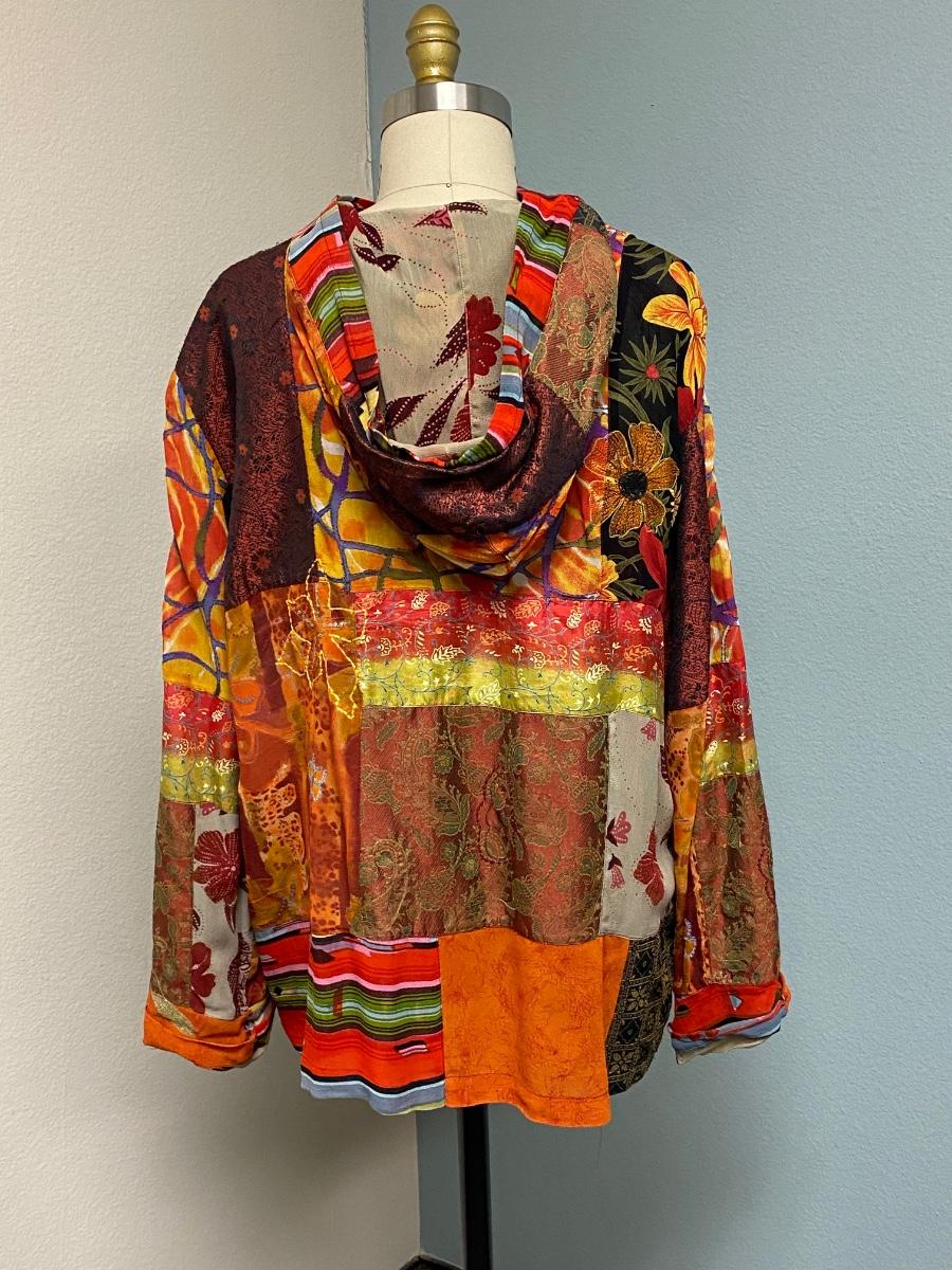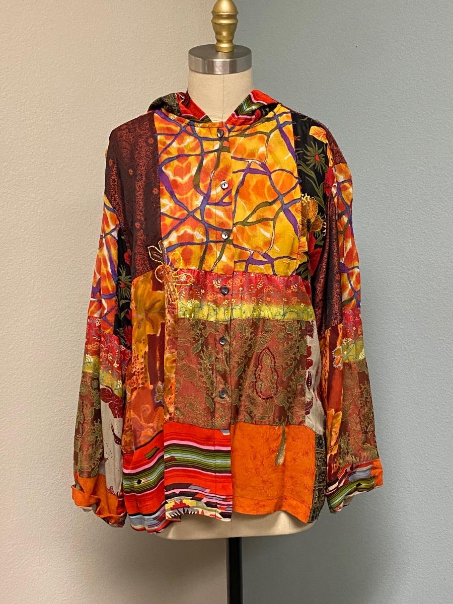 Chico's Design Size 3 Patchwork Style Hooded Button Front Lightweight Coat Blouse. In good condition. Chico's size 3 is a 16/18 or 1X.