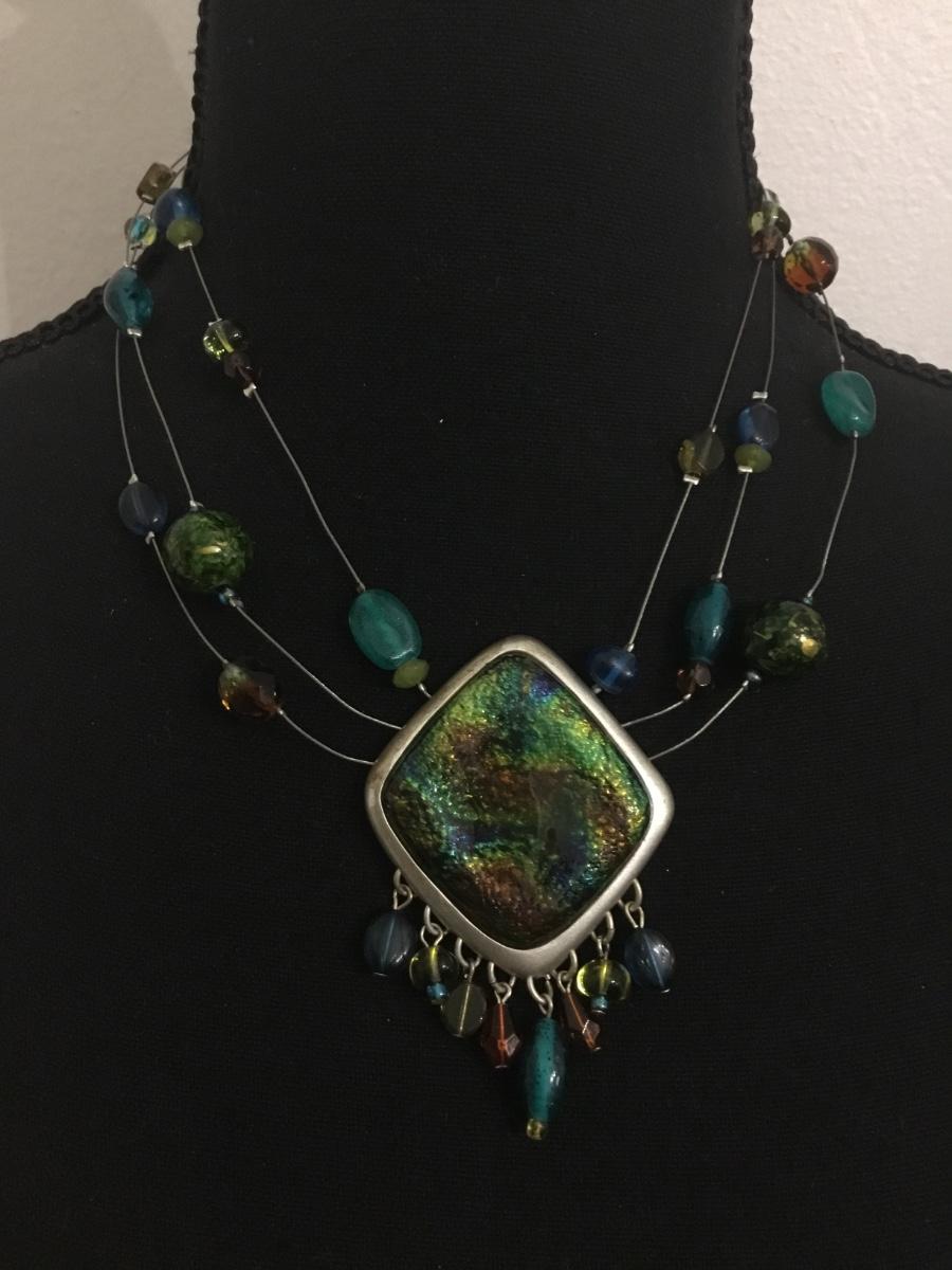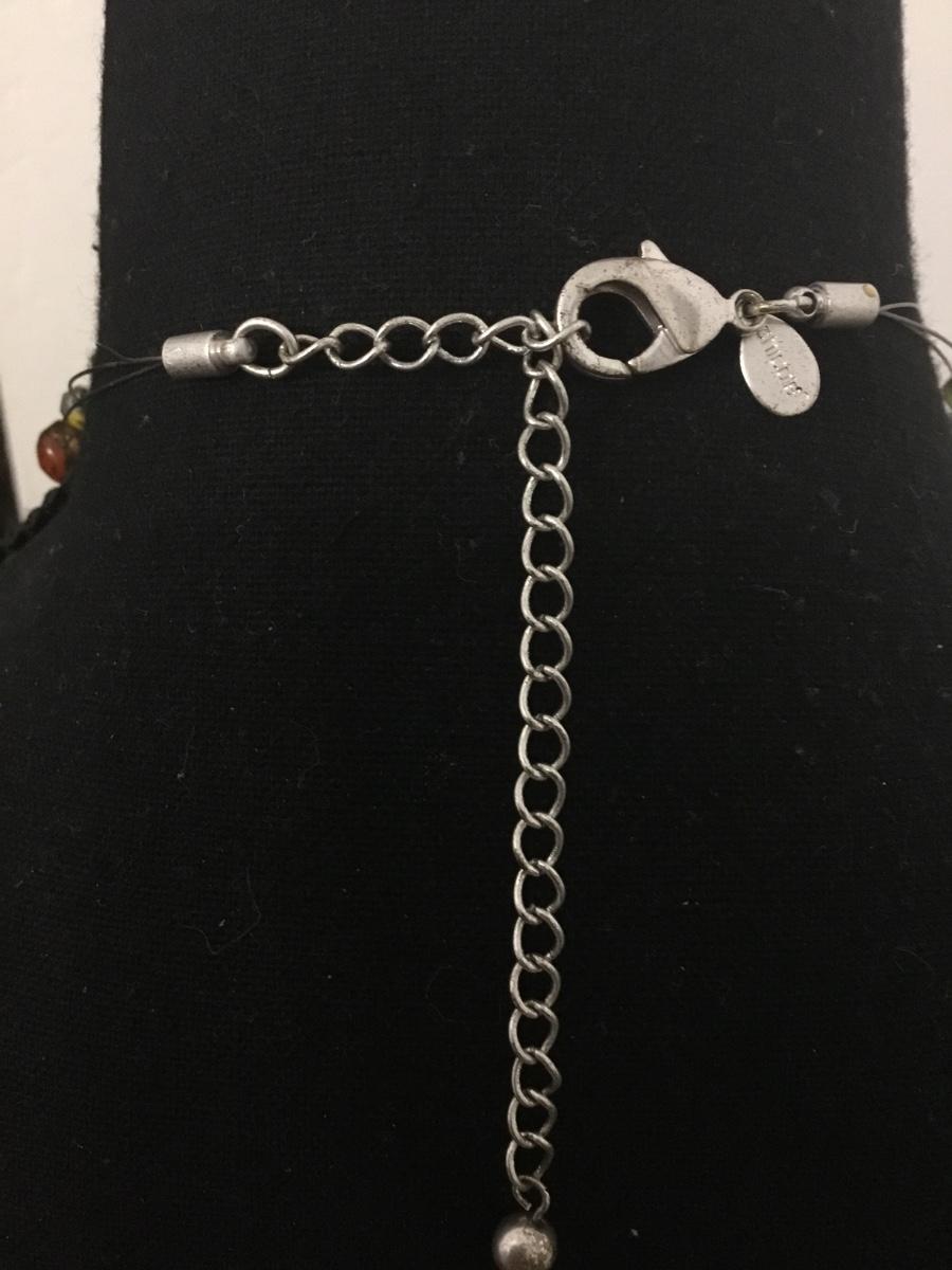 Chicos, peacock color beaded, Silvertone statement, necklace