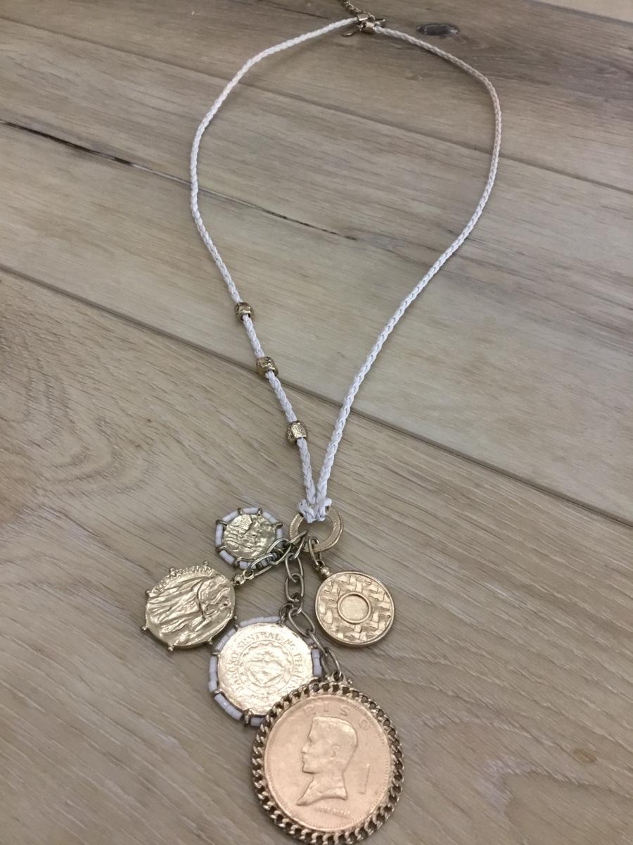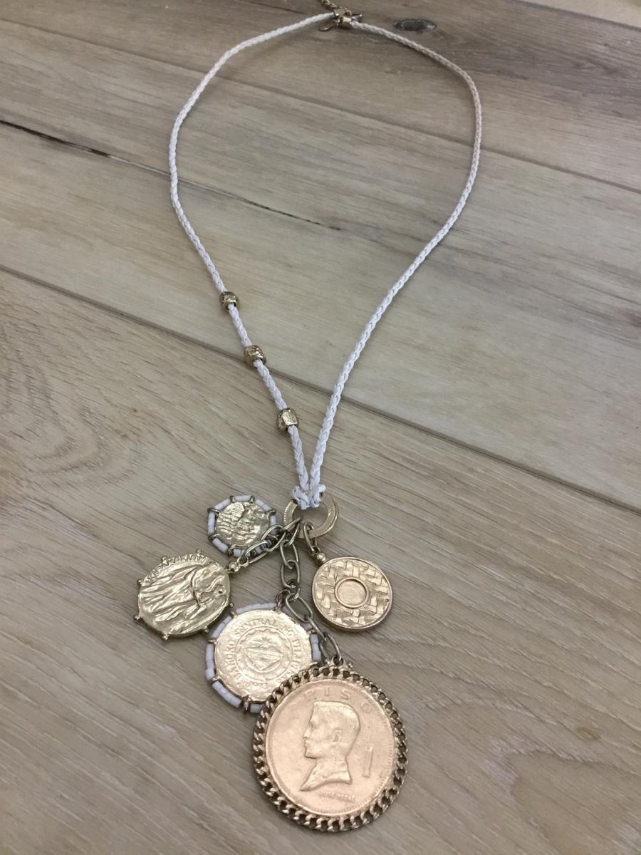 Chico’s White leather corded necklace with gold tone coin charms