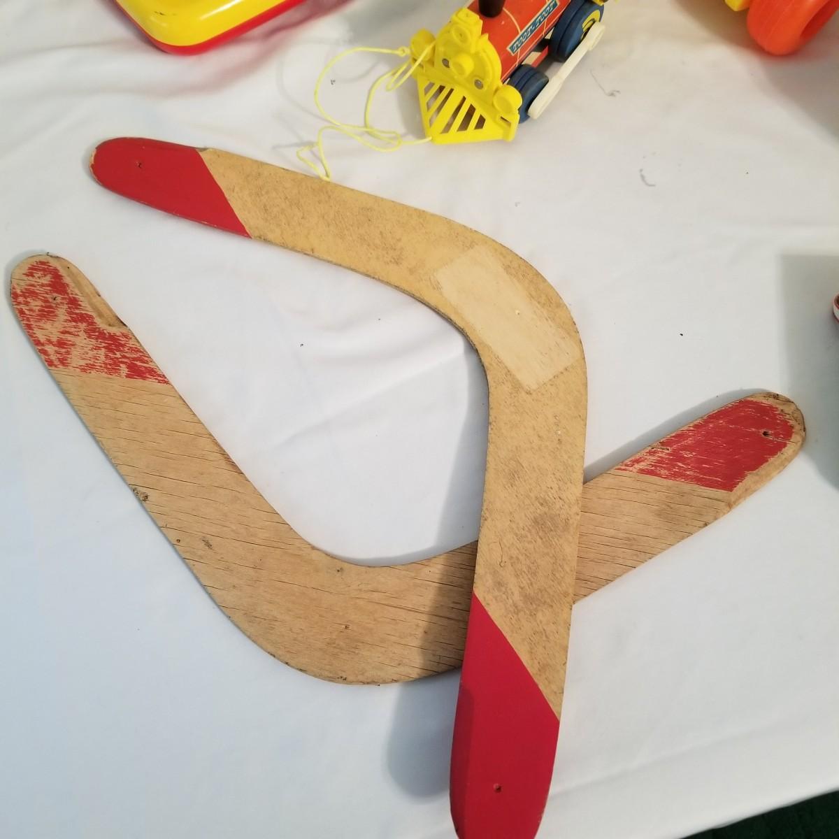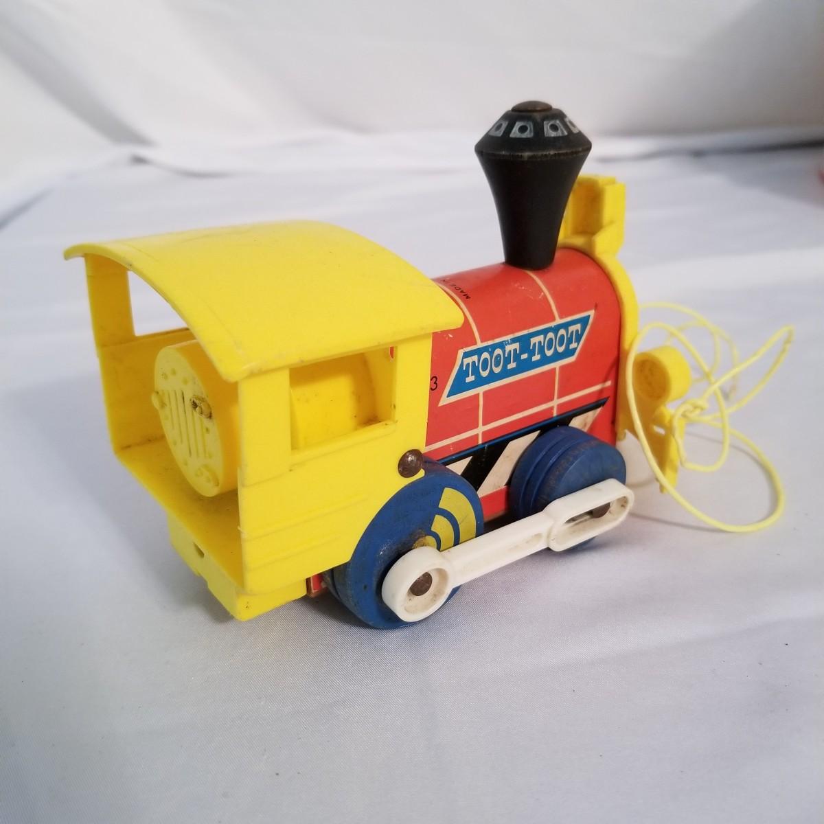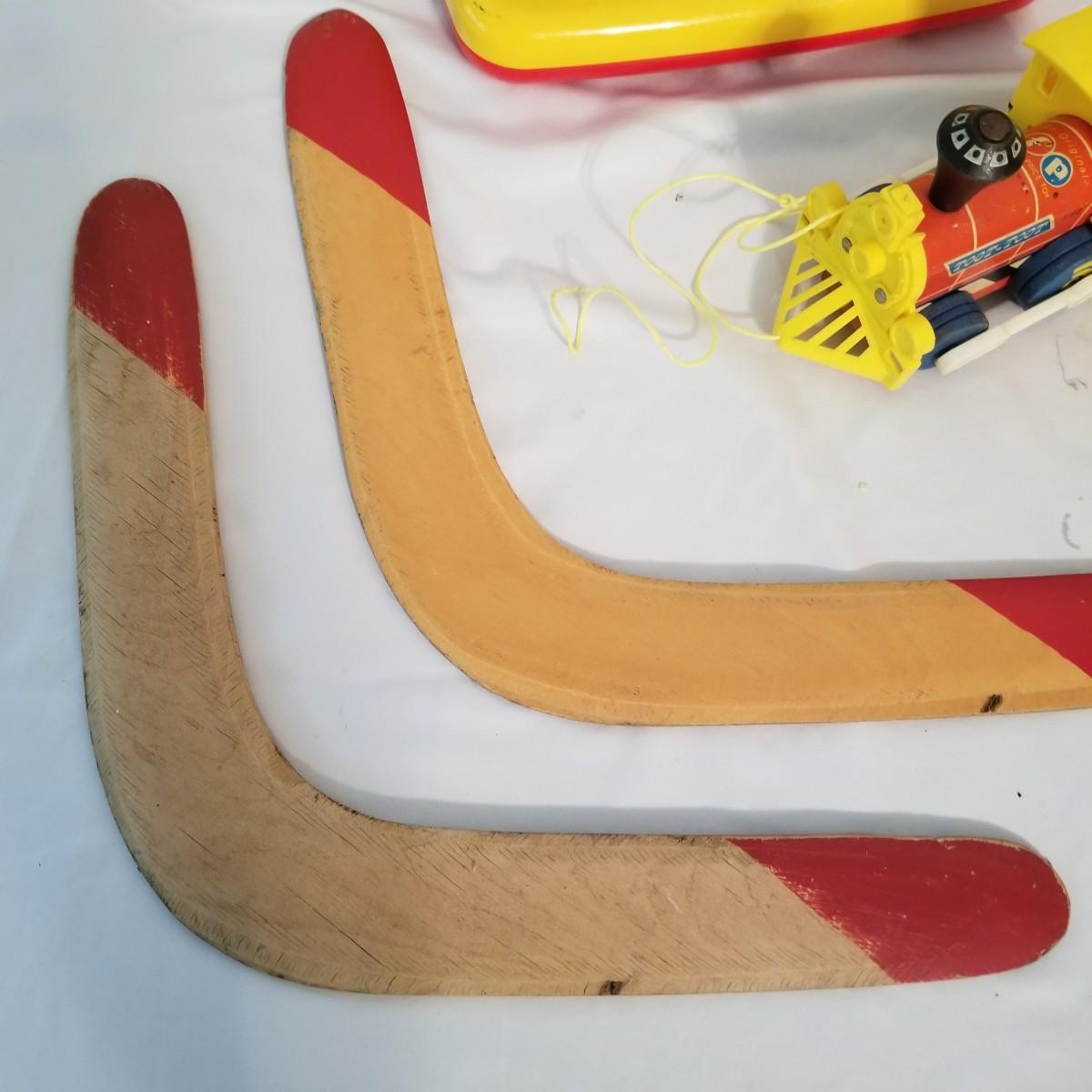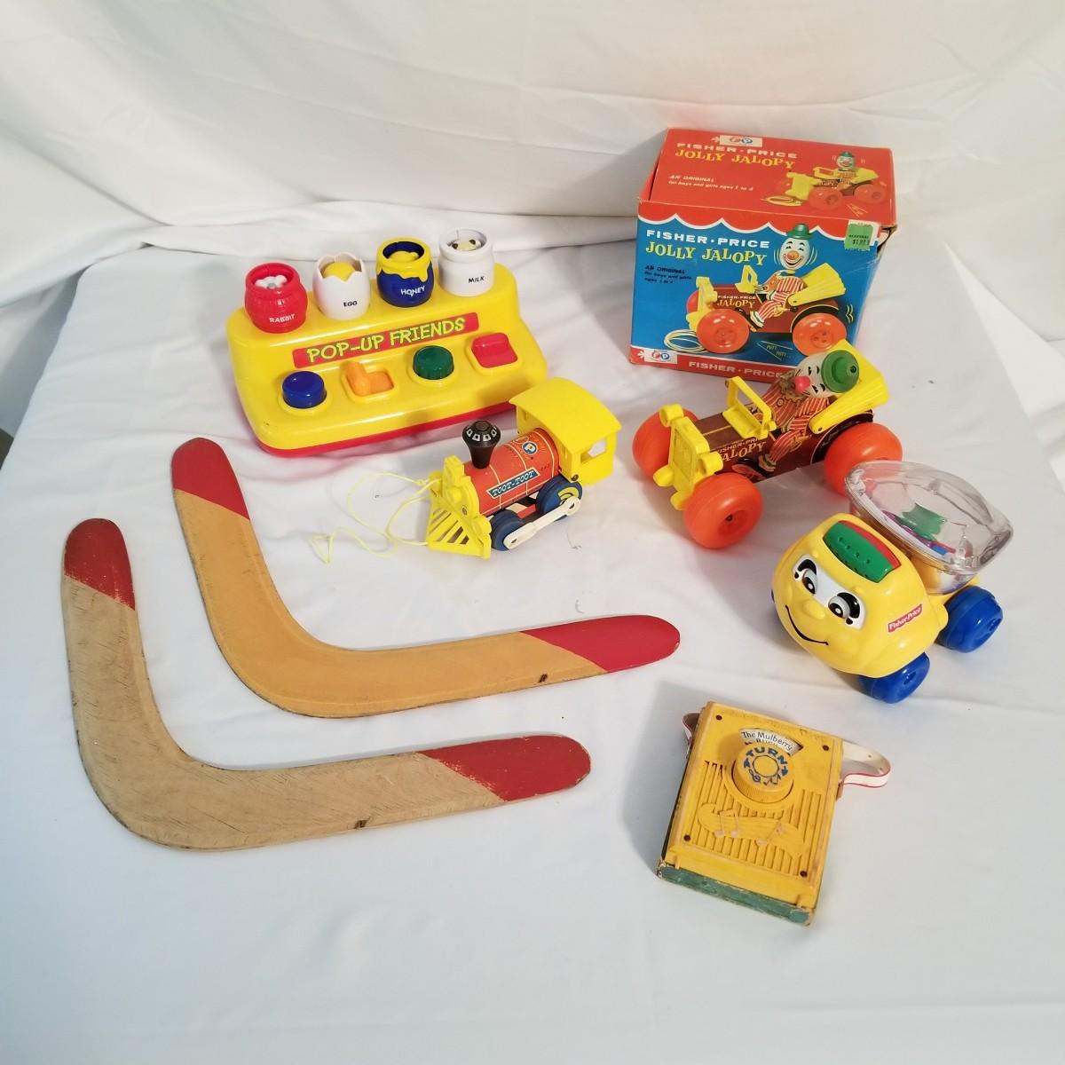 Seven pieces of fun for younger kids. Two boomerangs, a pull choo choo train, and a cement mixer. Also a Jaunty Jalopy, a Mulberry Bush twist and play, and a pop up friends item. Most pieces are Fisher Price, and in fair to good condition. See photos for detail. Shipping available.